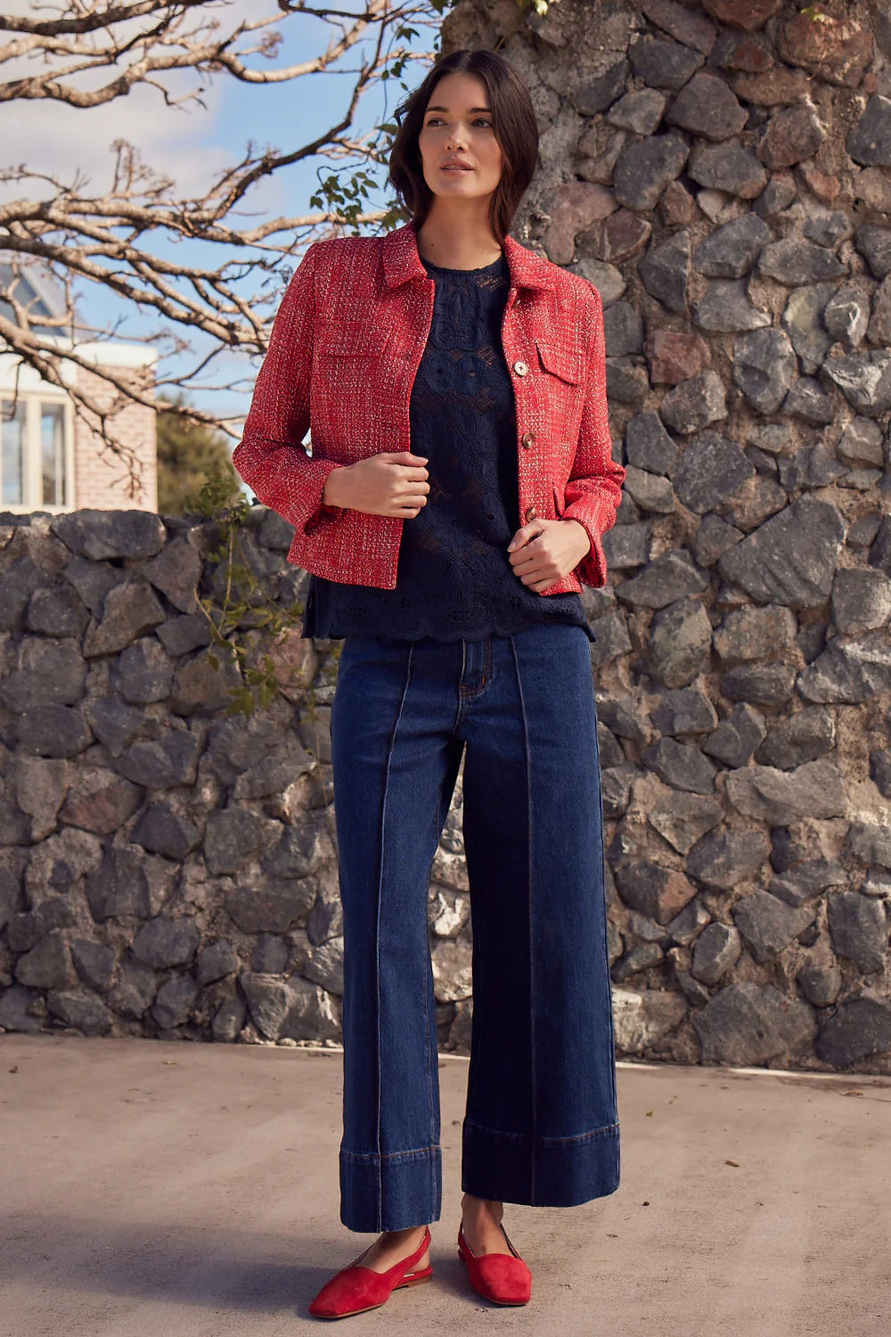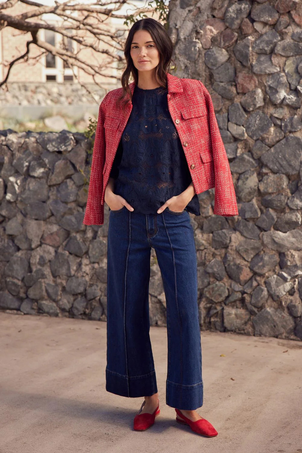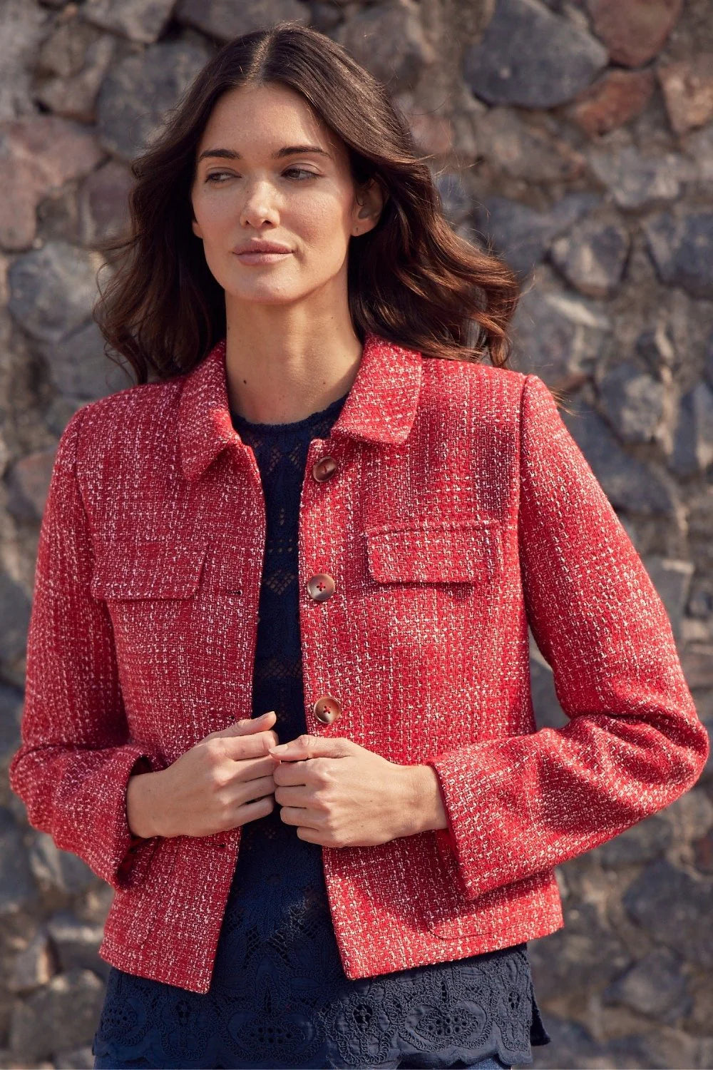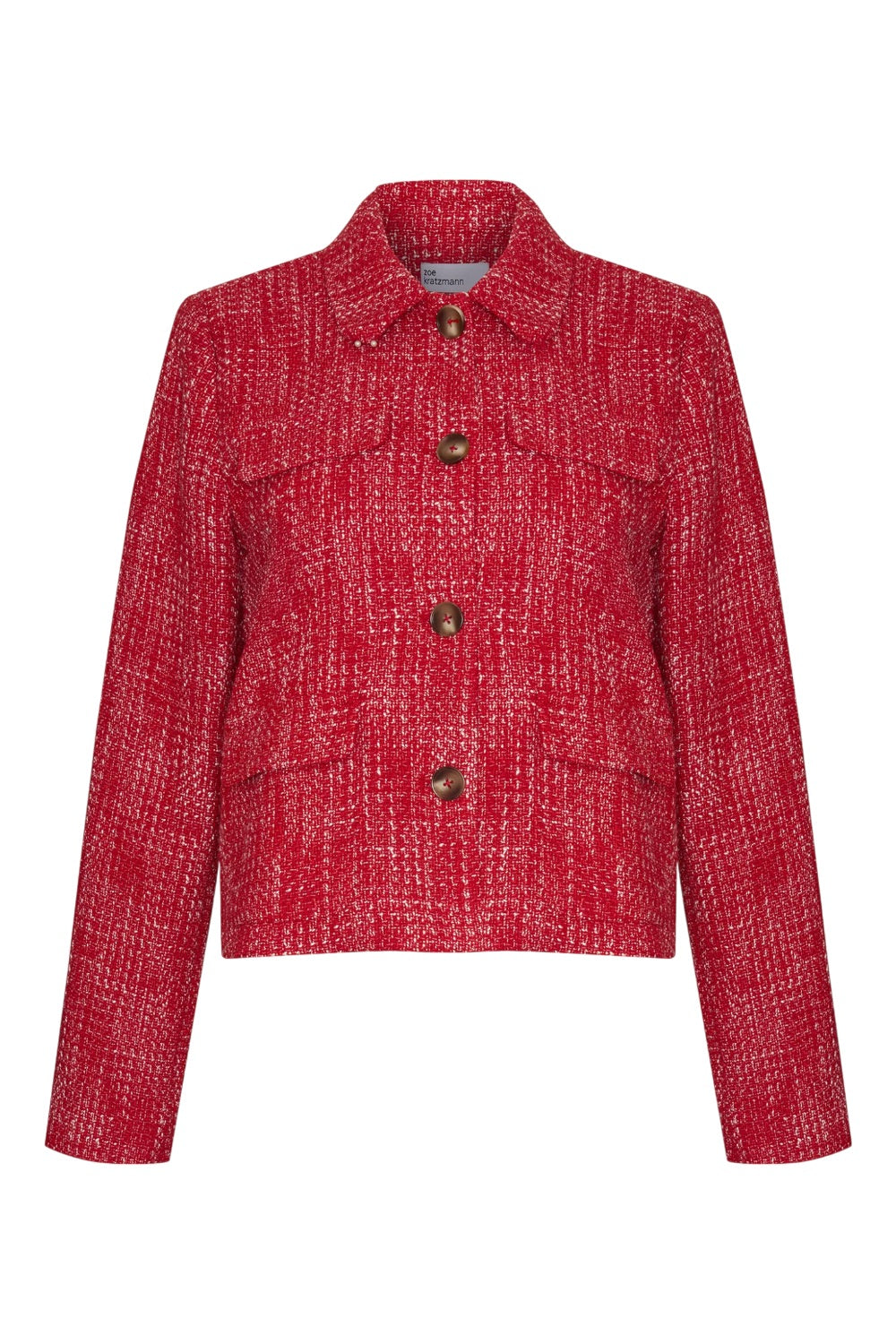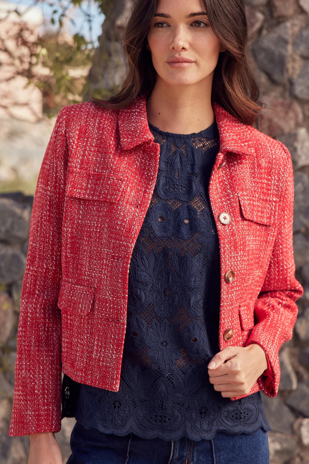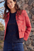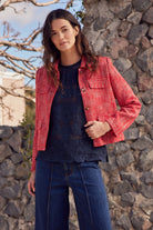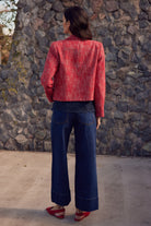 With its cropped silhouette and unique boucle texture, the adjoin jacket blends vintage elegance with contemporary luminosity. Textured red threads create a sophisticated visual, while the neat collar and curved pocket flaps add refined femininity. Perfect for travel, it instantly elevates any fall look.