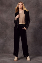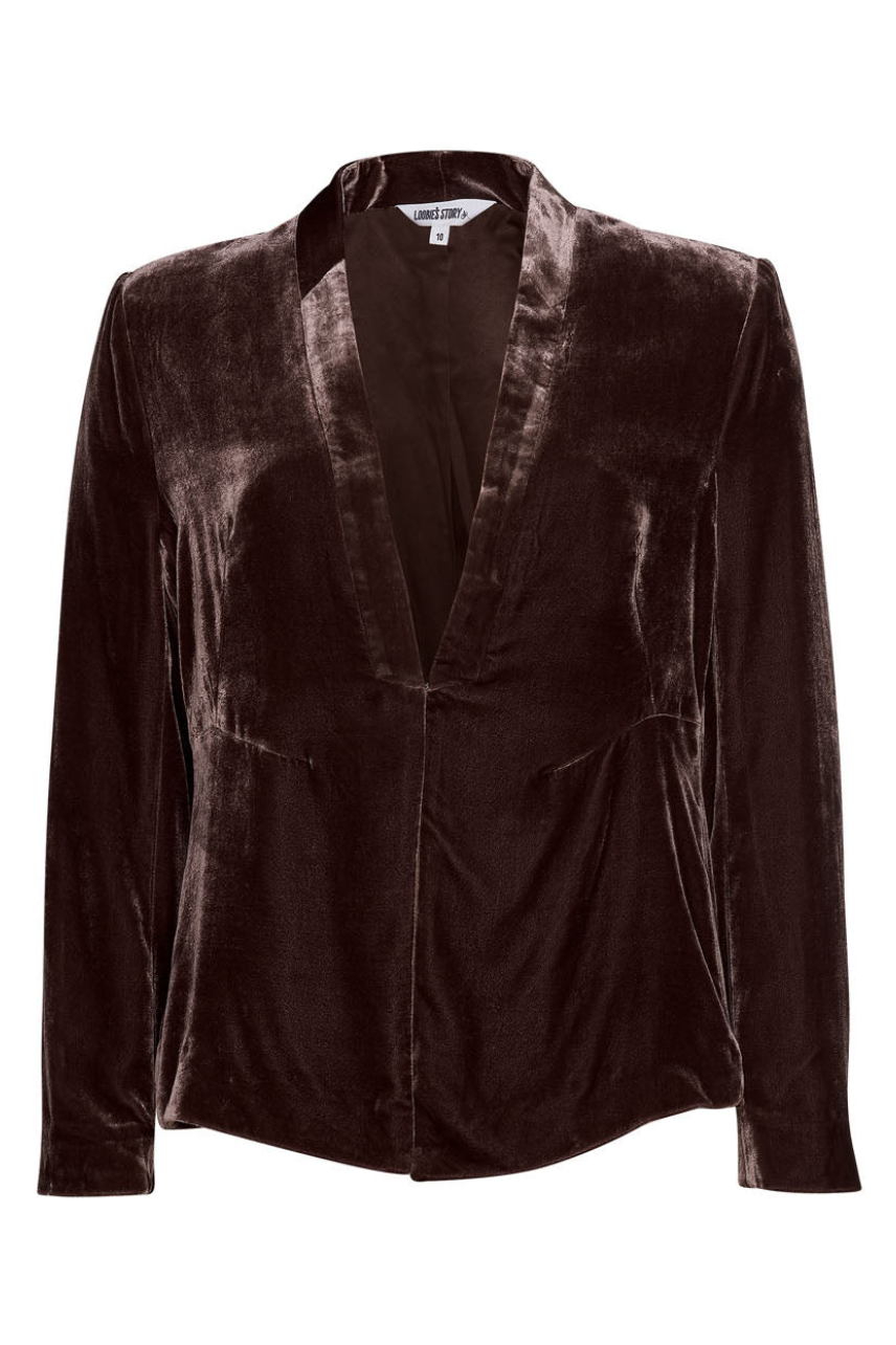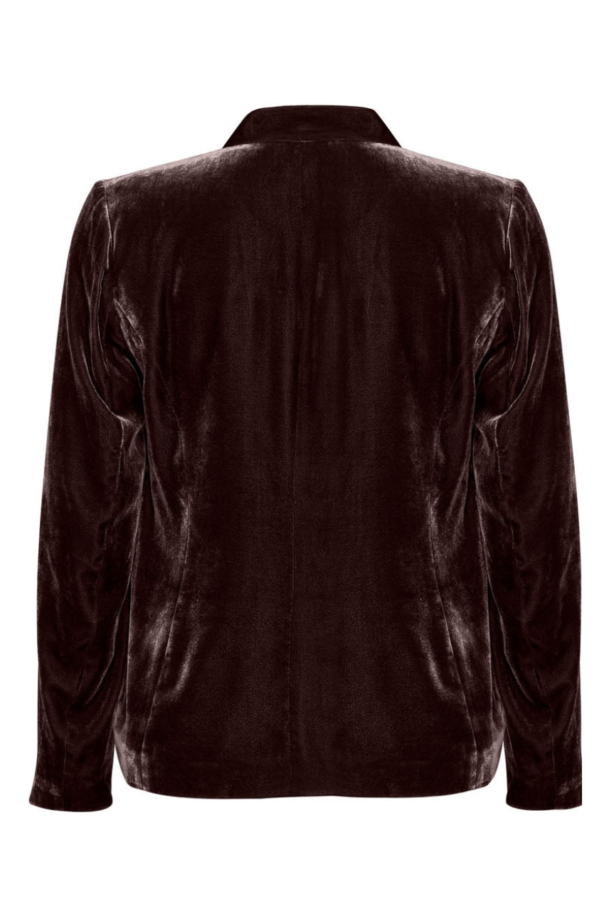 Slimline jacket in a luxe silk blend velvet with a front opening fastened with a hidden hook at the waist. Fully lined.