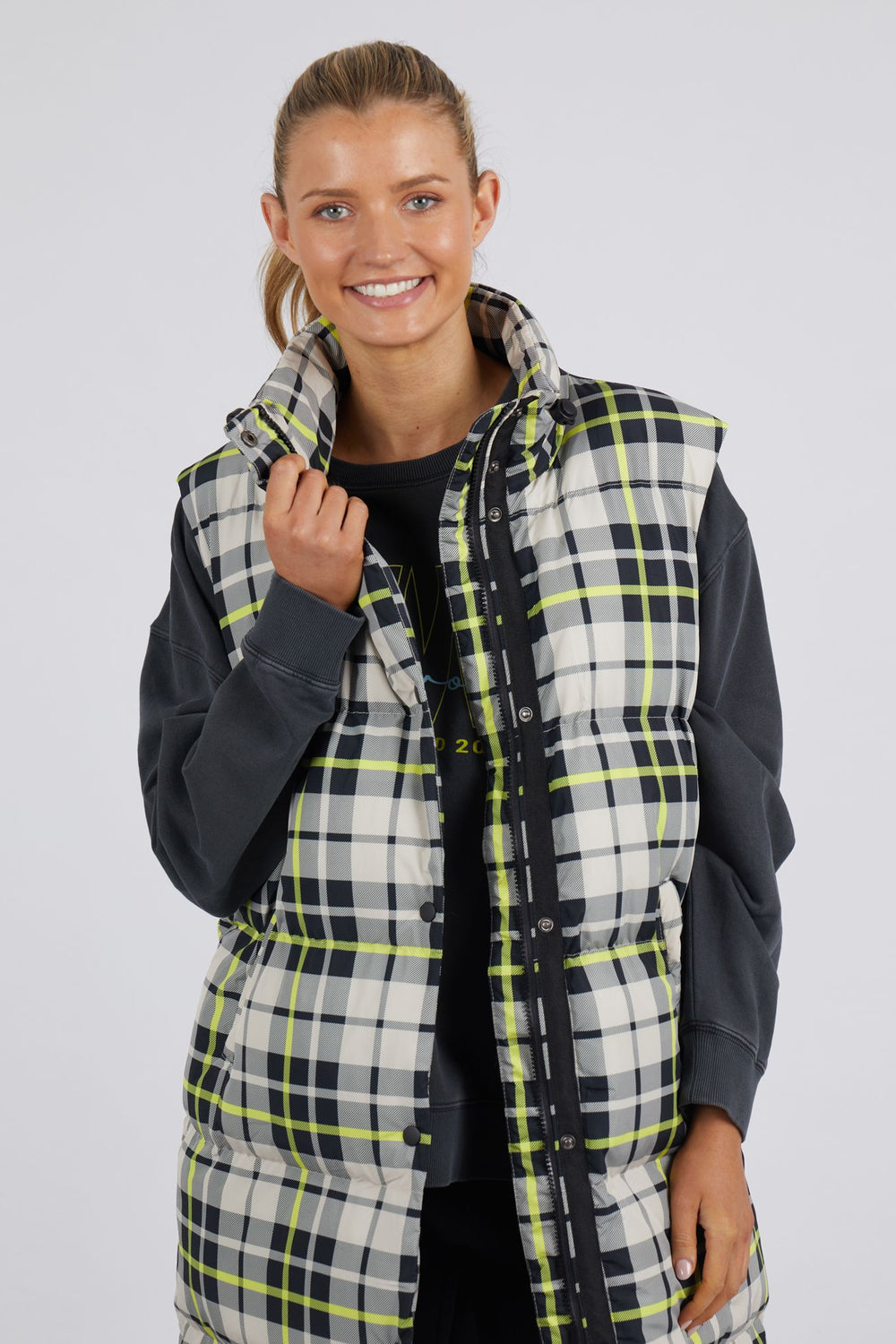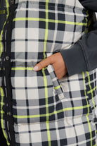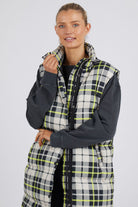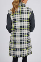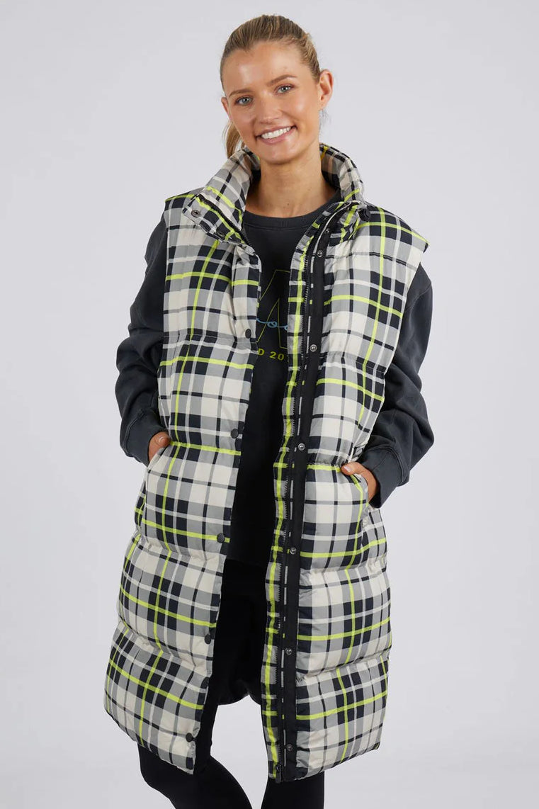 Check it out! Puffer vest or sleeping bag? This style is classic check yardage with modern pops of yellow throughout. Fashion meets practiality, this is a must have piece for your Winter wardrobe.