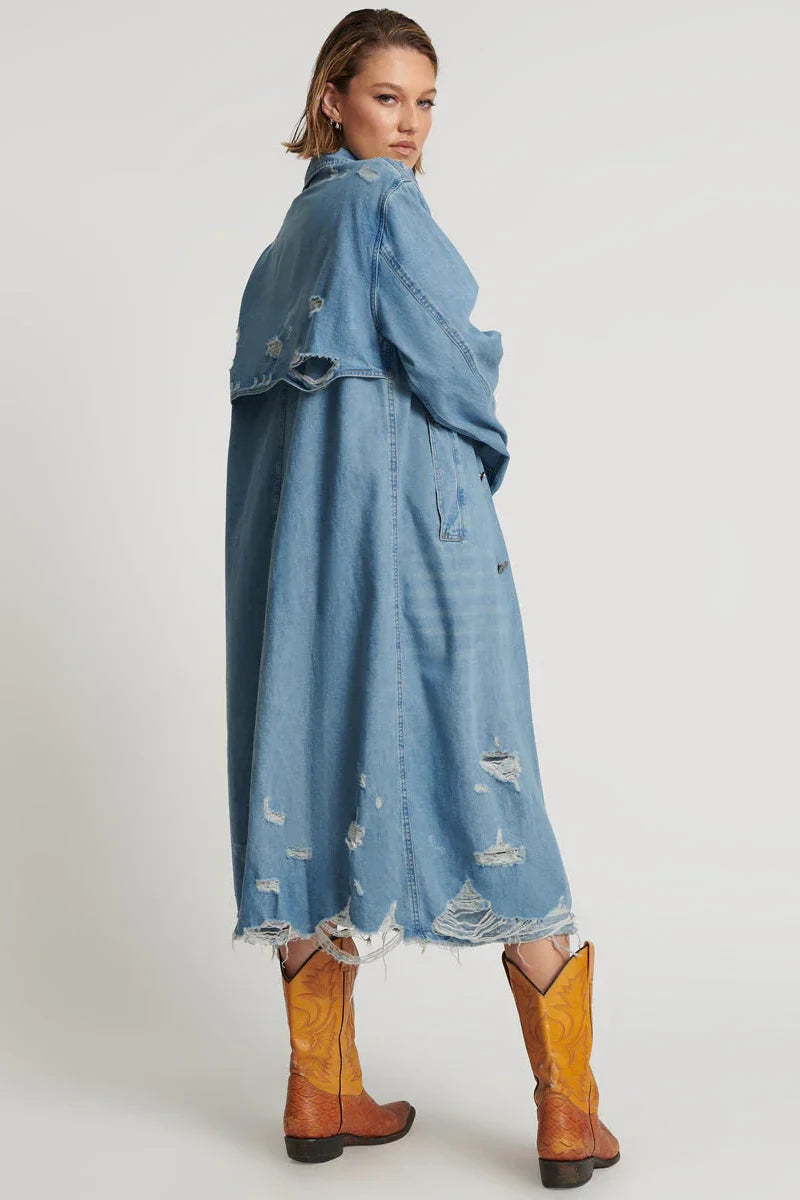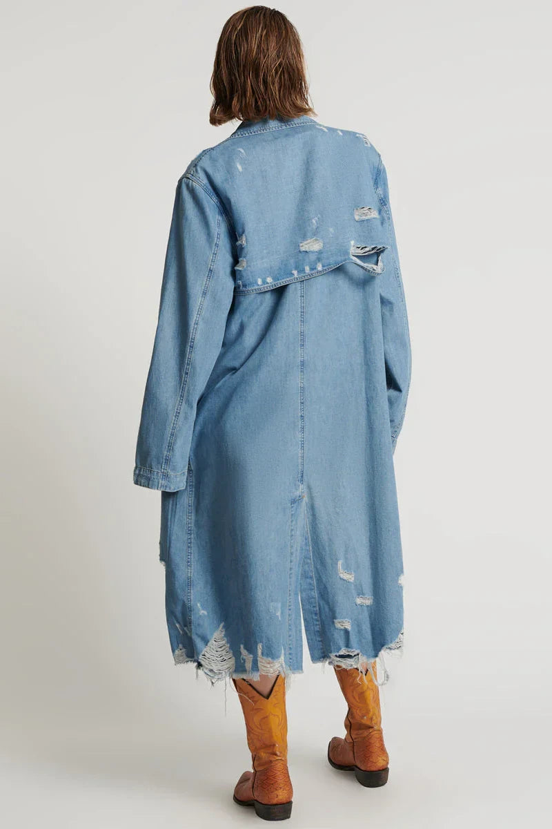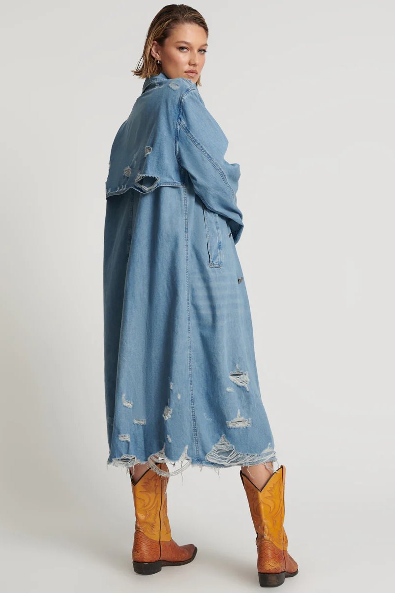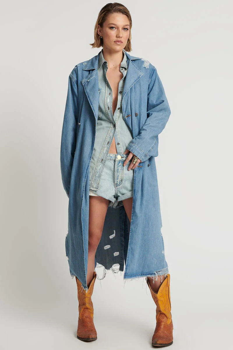 The PACIFICA DENIM TRENCH COAT means business. This double breasted beauty features adjustable cuff tabs, large side pockets, a back storm flap and distressing in all the right places.