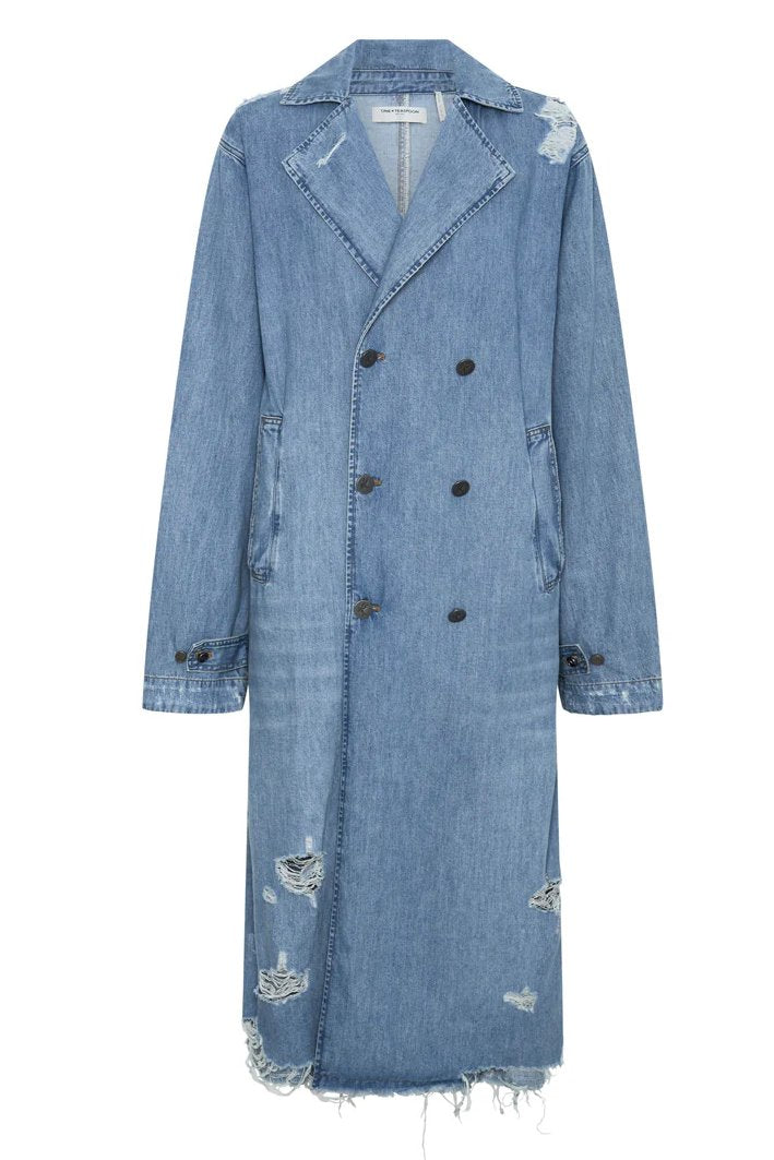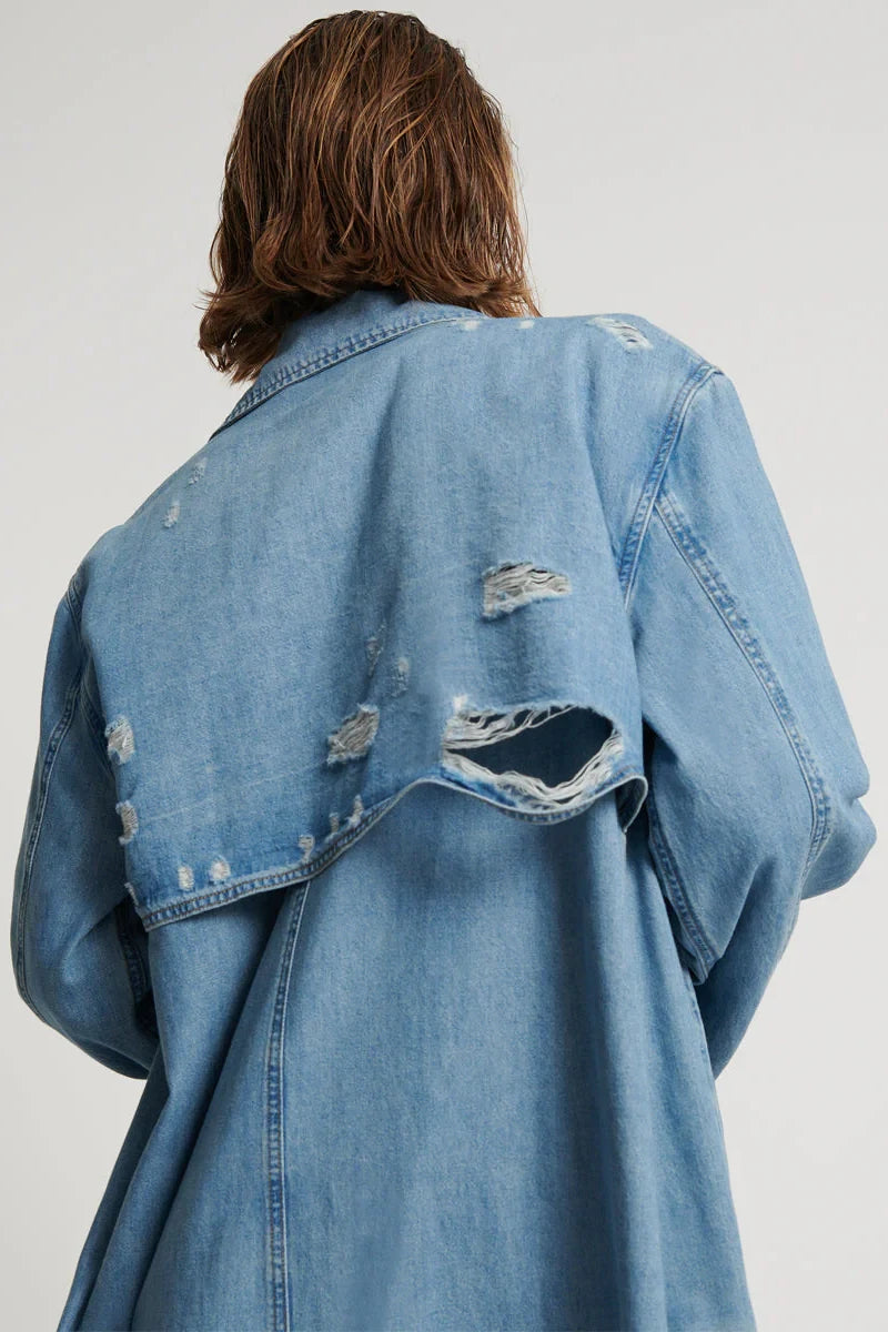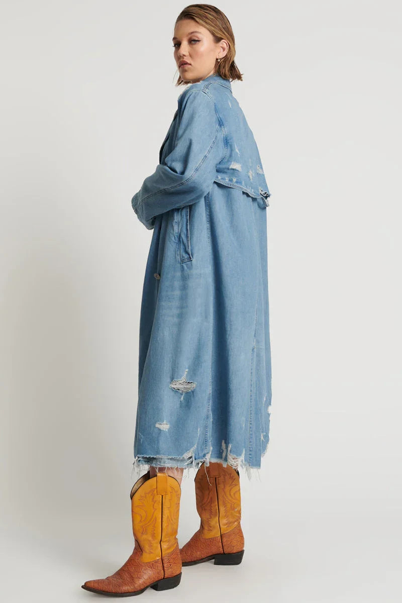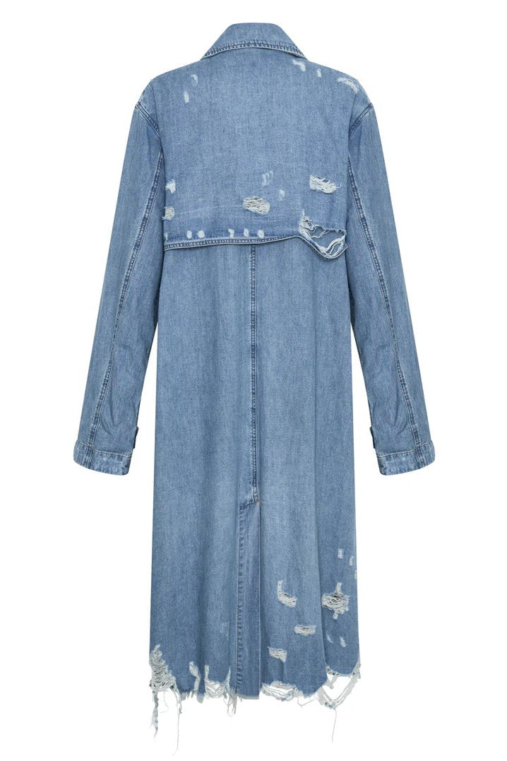 The PACIFICA DENIM TRENCH COAT means business. This double breasted beauty features adjustable cuff tabs, large side pockets, a back storm flap and distressing in all the right places.
