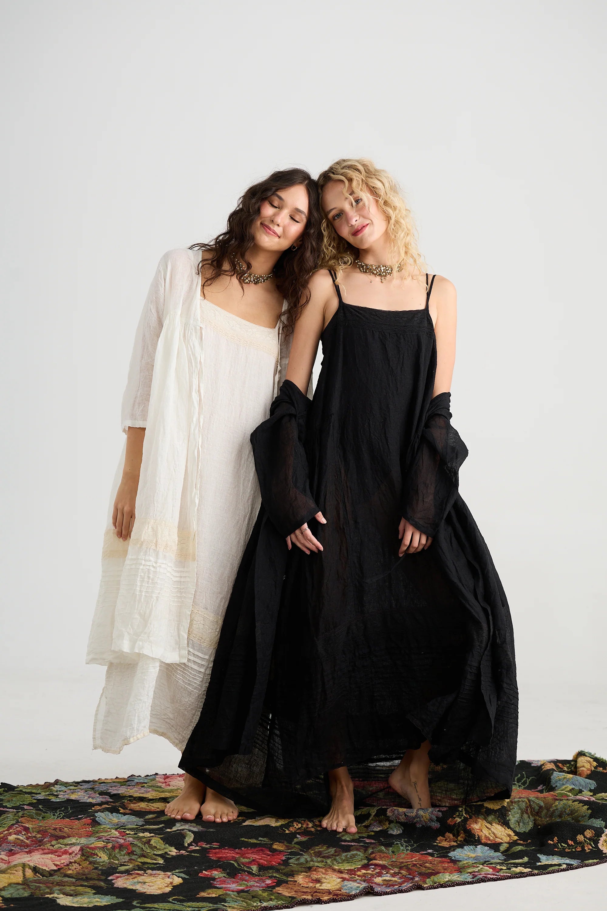 Enchantress is a true statement piece. Dramatic , Theatrical, poetic but also achingly Romantic. With its soft folds of luxurious linen gauze the coat is enriched with exquisite detailing - pintucks and vintage lace prettily adorn it and the simple fine ties bring it together at the front. Truly a sumptuous piece . Perfect for special occasions and weddings.