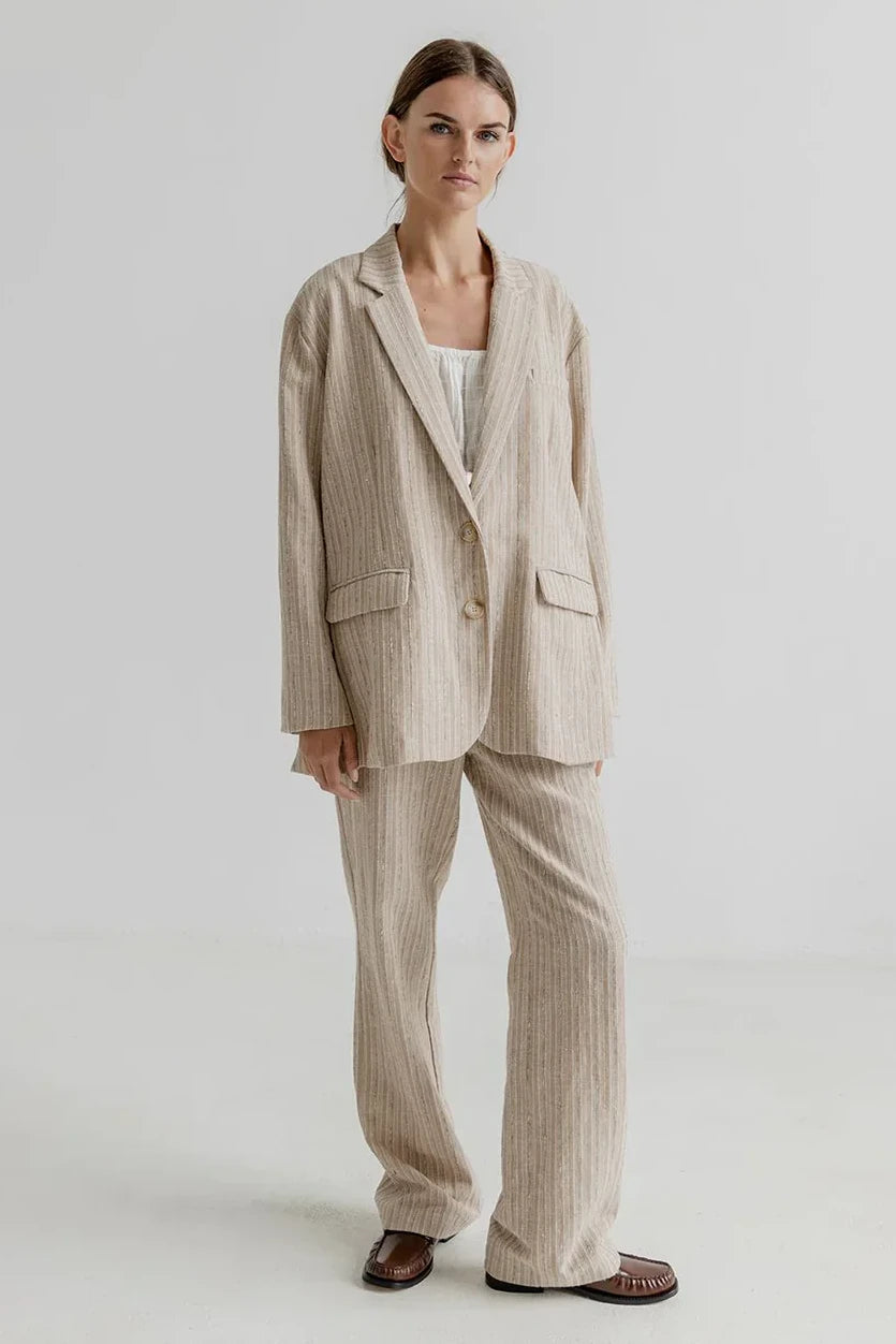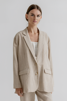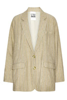 FINNE is a single breasted pin striped blazer in an Italian cotton-linen quality. The blazer has a relaxed fit, two-button closure and two welt pockets with flaps at front. The blazer has lining inside in a matching color.