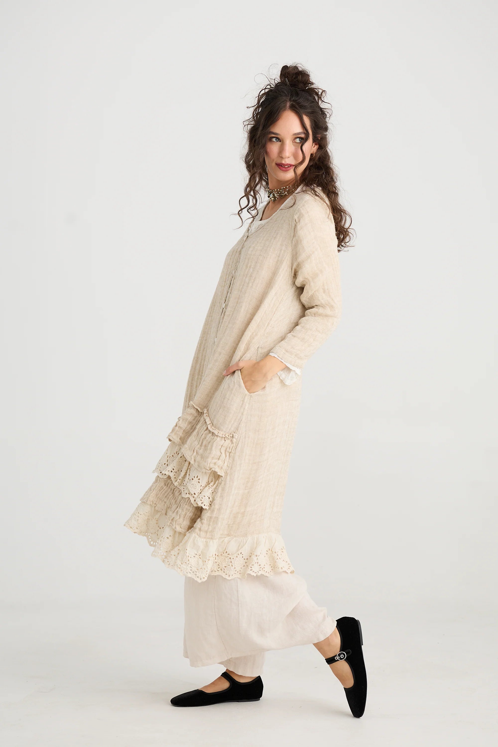 Life is like a poem - verses and layers - this coat dress made from textured linen and beautiful cotton lace has a poetry all it`s own.