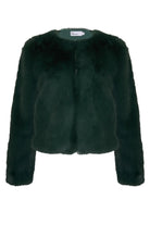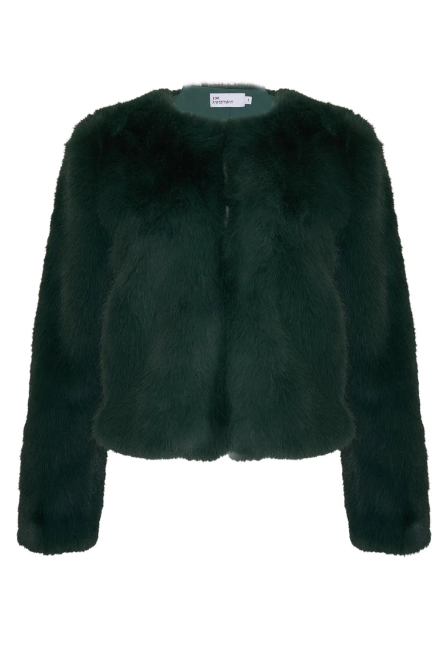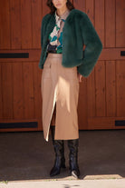 A statement in luxurious texture and modern sophistication, the Glacier Jacket in emerald is designed to elevate cool-weather dressing with ease. Crafted in a sumptuous faux fur, this cropped silhouette is designed to command attention, whether paired with denim for a textural contrast or layered over occasion wear.