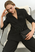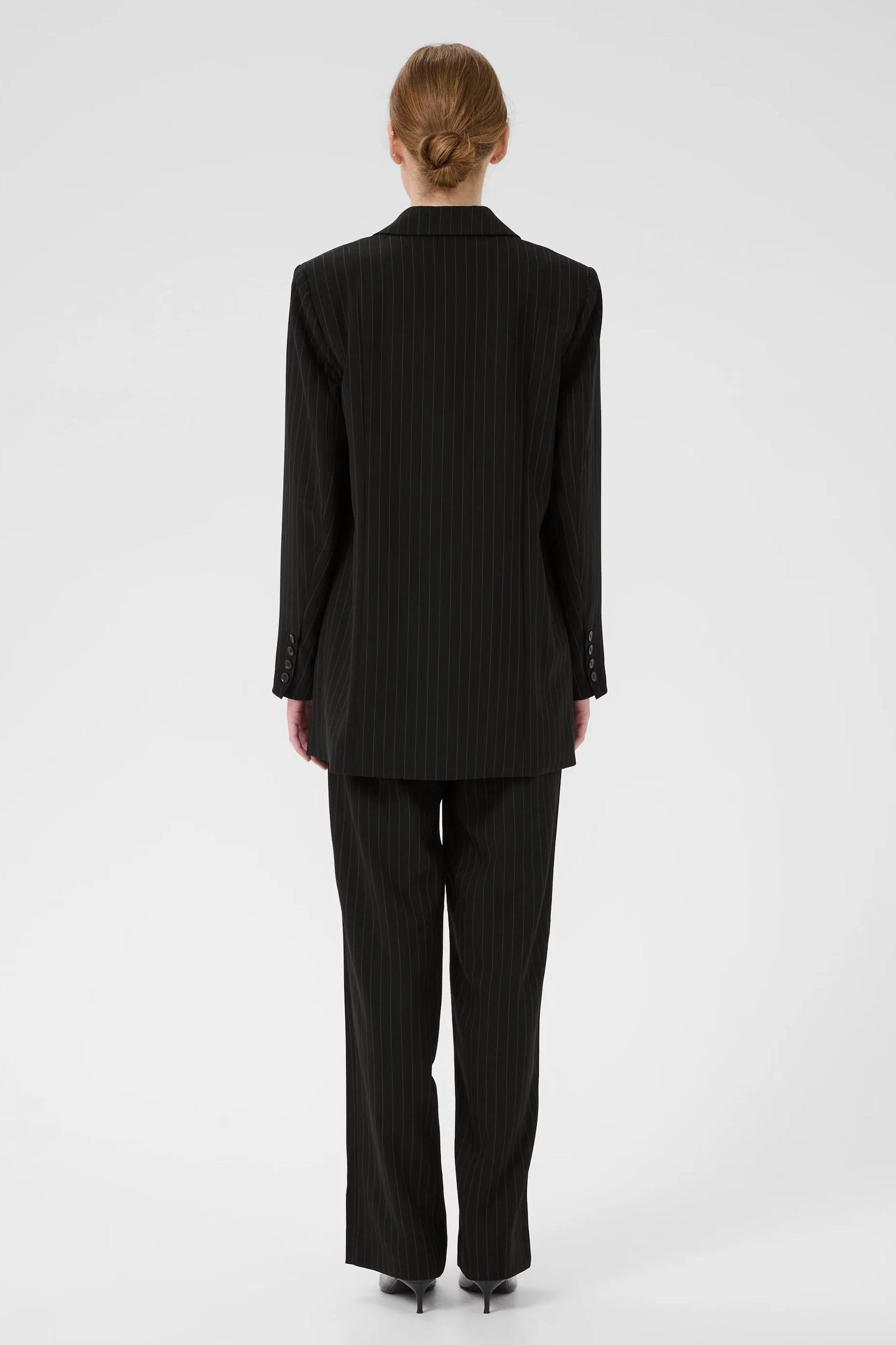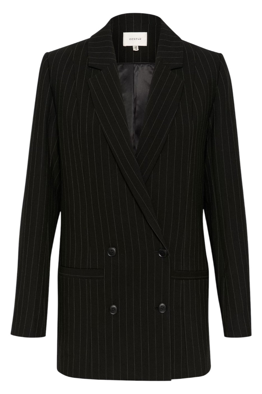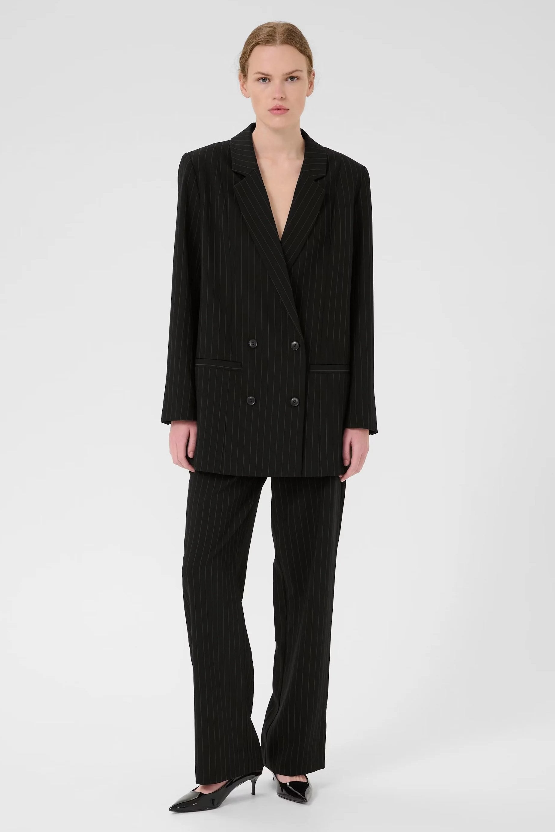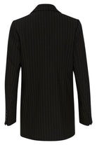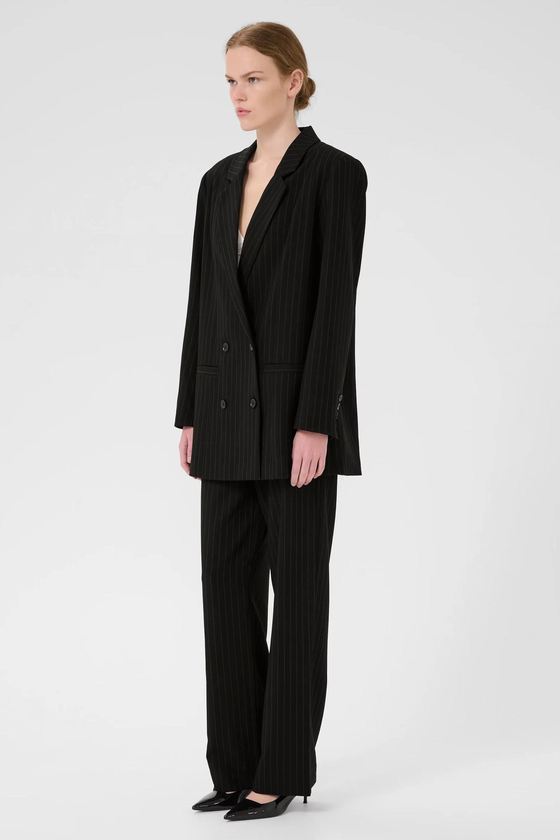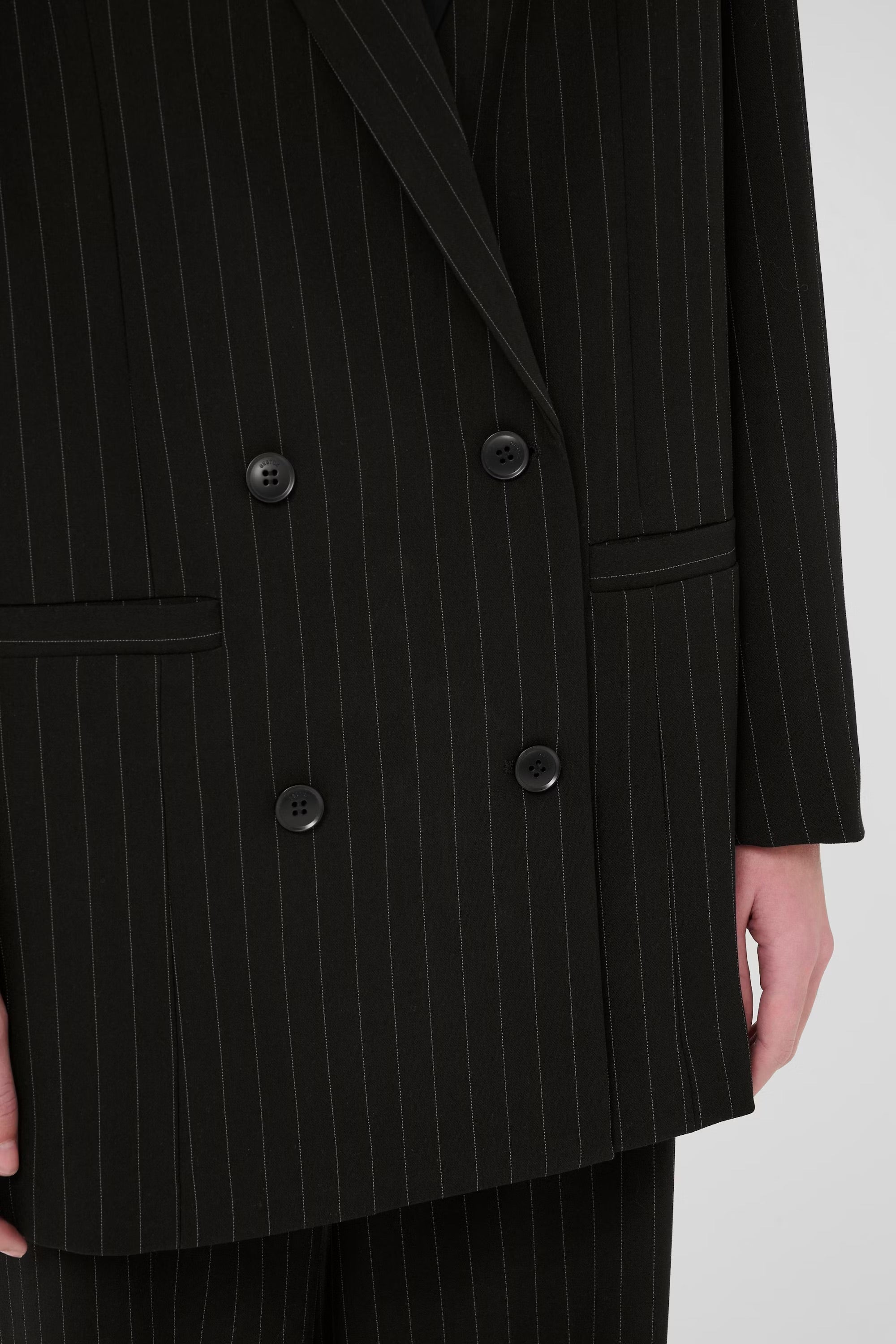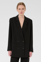 Pinstriped double-breasted blazer with a long, oversized fit and defined shoulders. Notched lapels, front flap pockets and a clean expression create a sharp, tailored look.