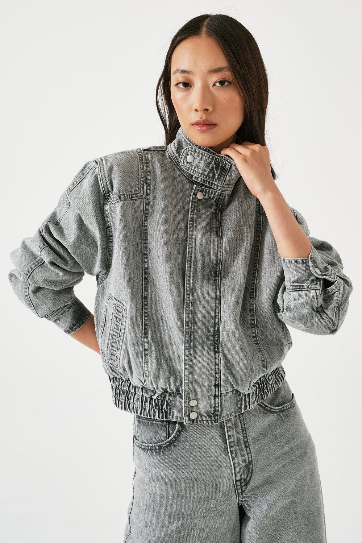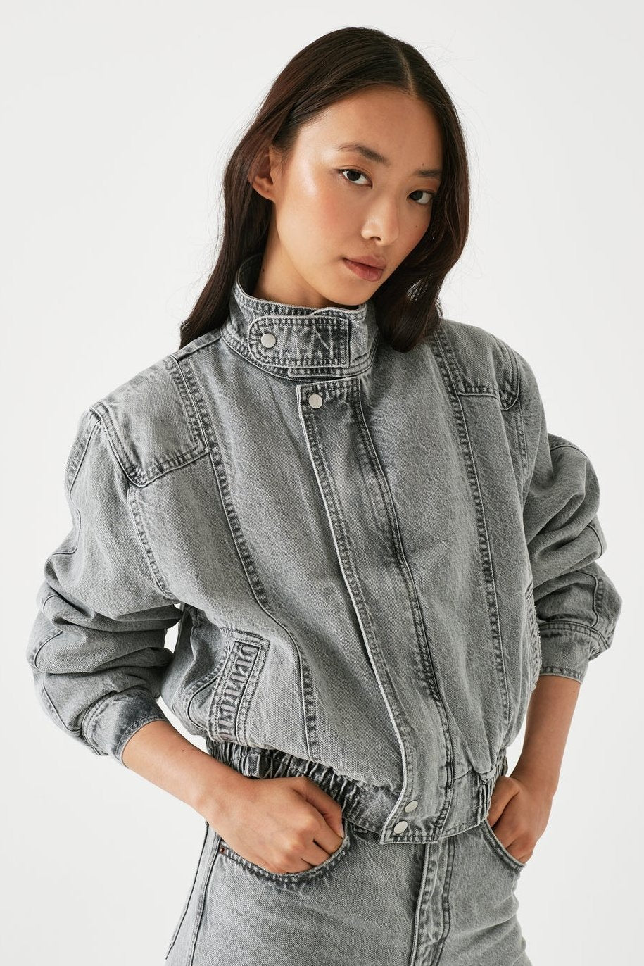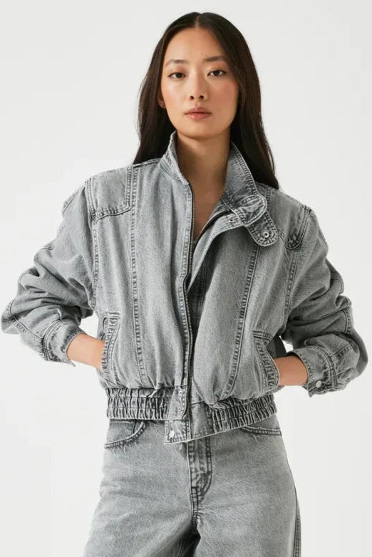 The Juno Jacket by Seventy & Mochi is a gorgeous bomber style jacket with a retro feel. Available in 2 colour options this style has an elasticated waist and zip front fastening with covered placket. Wear open or fully close with the stud flap closure at the neckline. This jacket has 2 slant pockets at the front edged with placement embroidery detail. It has a quilted lining making it the perfect layering piece for cooler days.