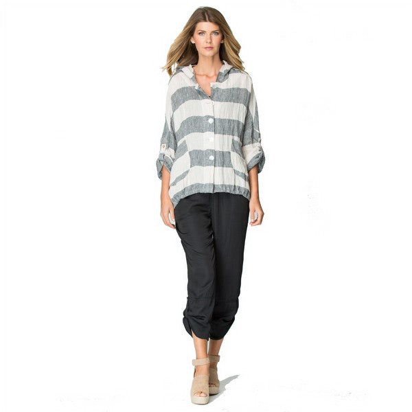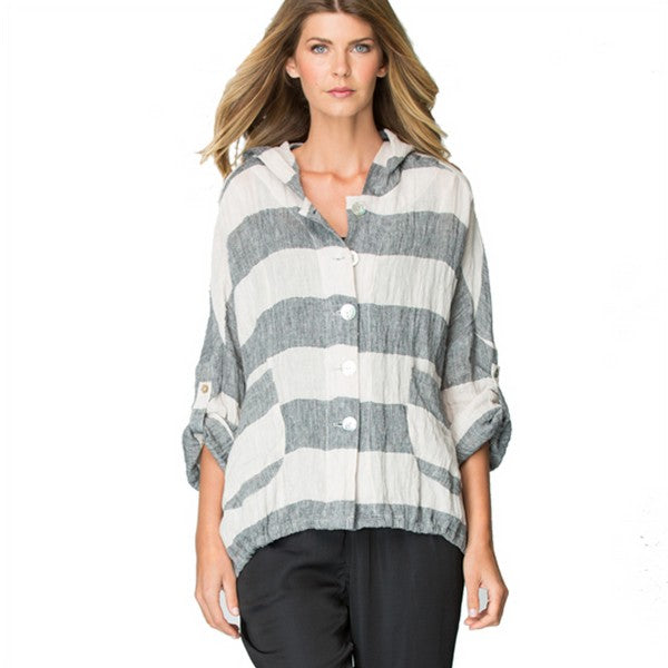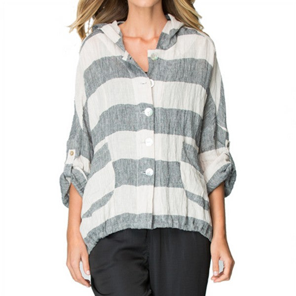 The Relaxed Linen Jacket by Hammock & Vine is a quality cross-dyed striped linen jacket in soft hues of beige and black. With an on-trend oversized fit this jacket features long tab up sleeves, a soft hood, patch front pockets, a drawstring hem and large mother of pearl buttons down the front and on sleeves. This easy to wear style can be paired back with jeans and tees for an extra layer or is perfect as a beach cover-up. Hem finishes just past the hips on most.