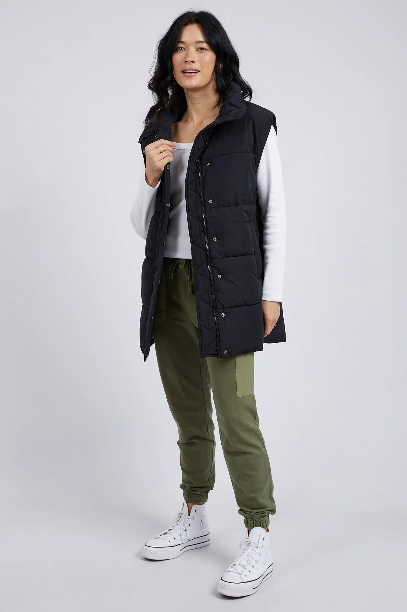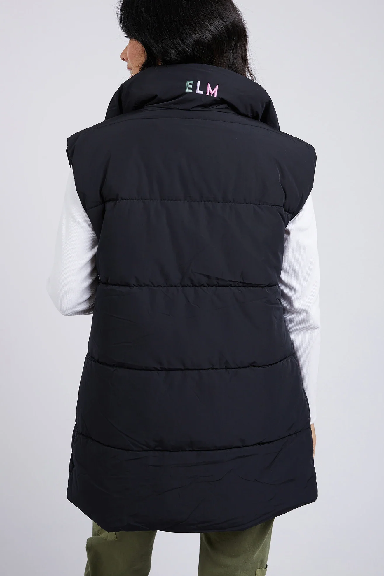 • The perfect blend of style and versatility, the Longline Puffer vest offers comfort and ease of movement for everyone. Designed to be the ideal outer layer when the weather calls for it, this vest is flattering on all sizes and features a subtle Elm embroidery on the stand-up collar.