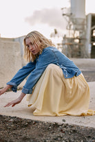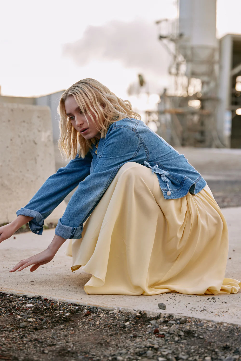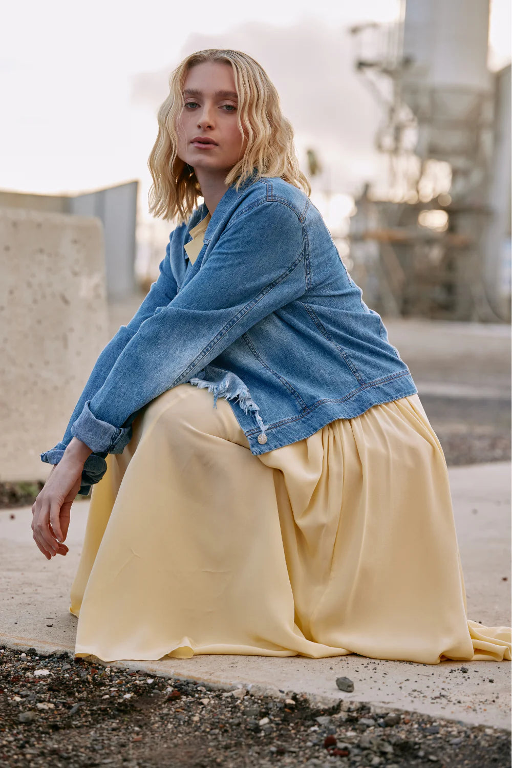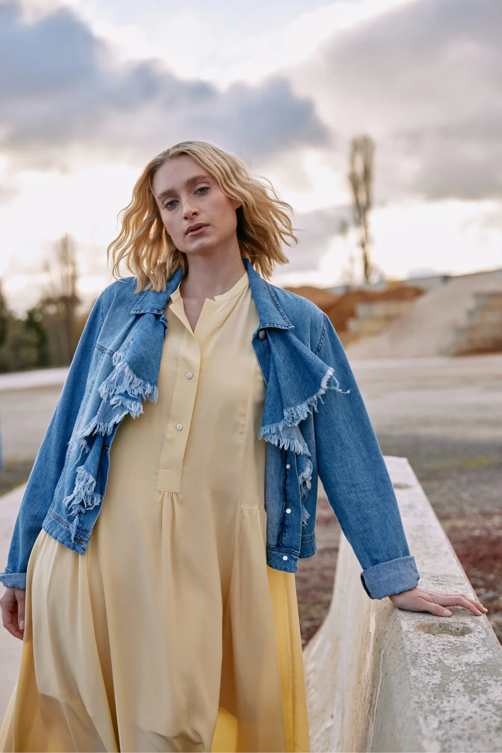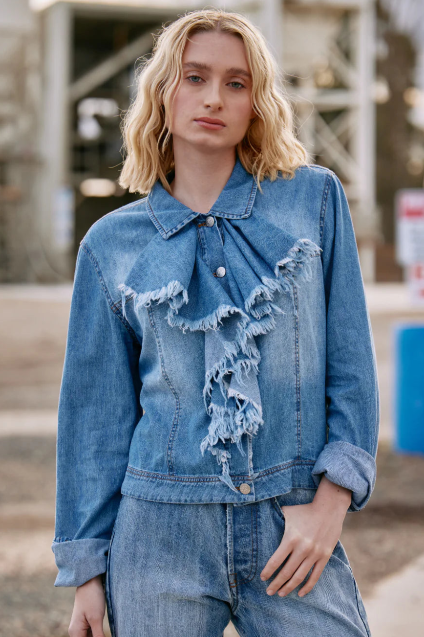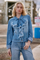 Feel the unique style and exquisite design of the M.A.Dainty Blossum Jacket in Indigo Denim. Featuring distressed frills cascading down from the collar to the hem, this jacket is truly one-of-a-kind. Button up and hip-length, it pairs perfectly with the matching Fedora Jeans.