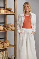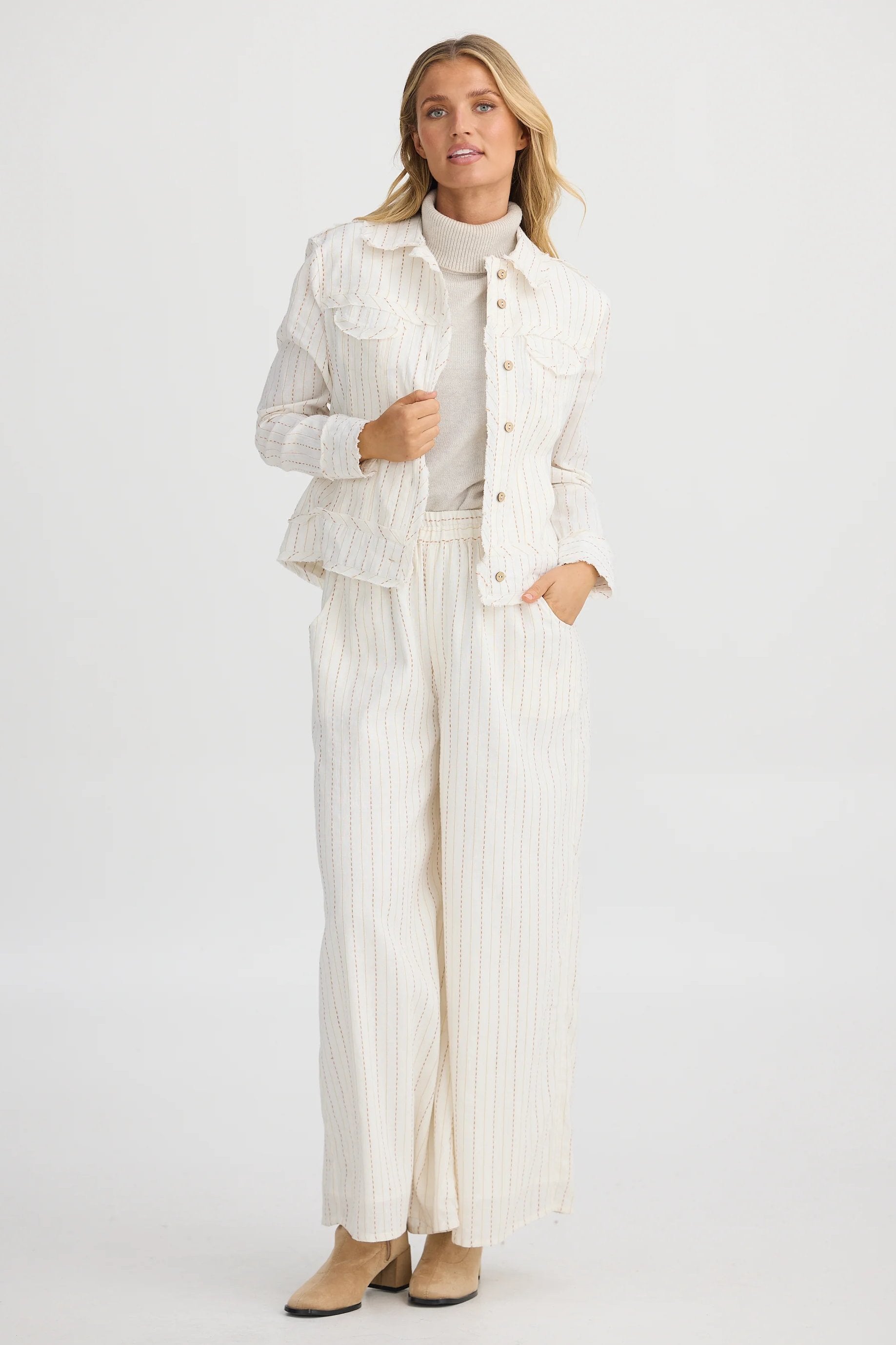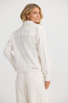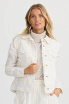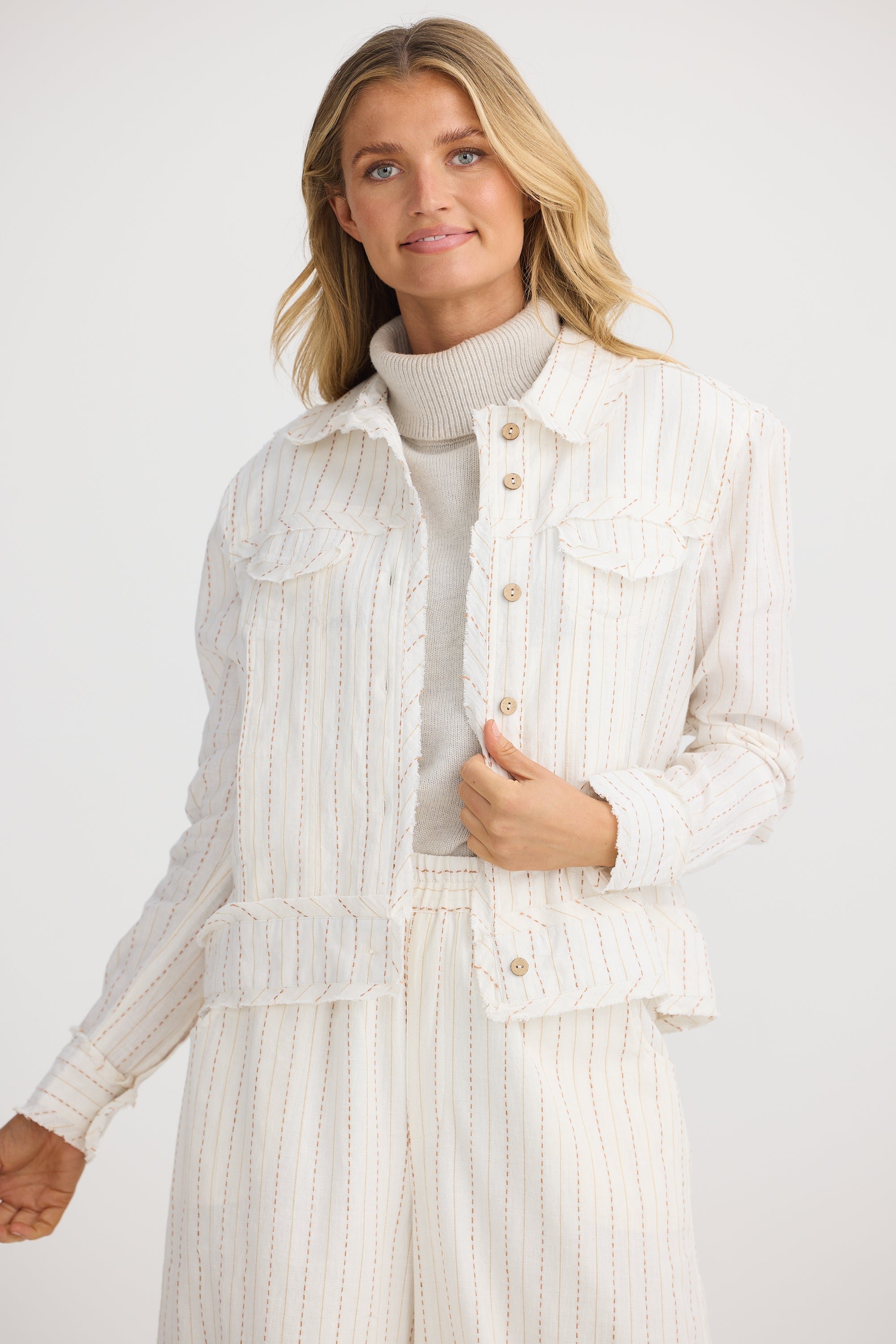 She's here! The Monza Jacket from the Shanty Co Autumn Winter collection. This is the ideal jacket for our cooler seasons. A classic denim look in a stunning linen featuring a silver stripe and raw finishes.