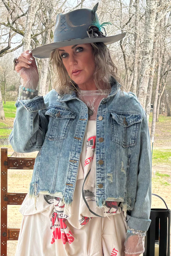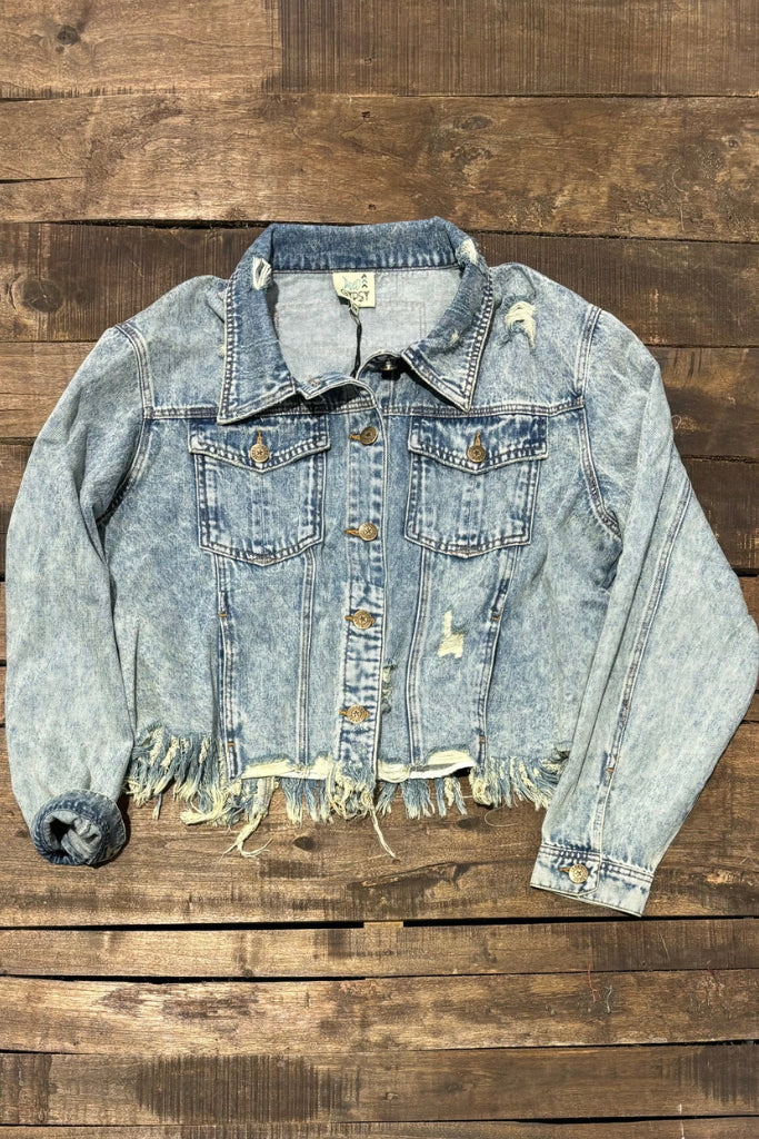 Our On My Way Vintage Jacket features a denim jacket with long sleeves and distressed cropped hemline.