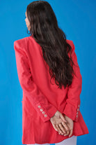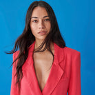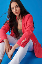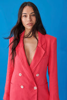 Bright pink paired with a classic double-breasted jacket – a blend of high impact and classic style. The Rita Jacket by Kireina comes in a light-weight linen blend, features a longline cut, welt pockets and a light pink and white striped lining.