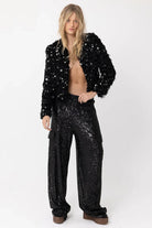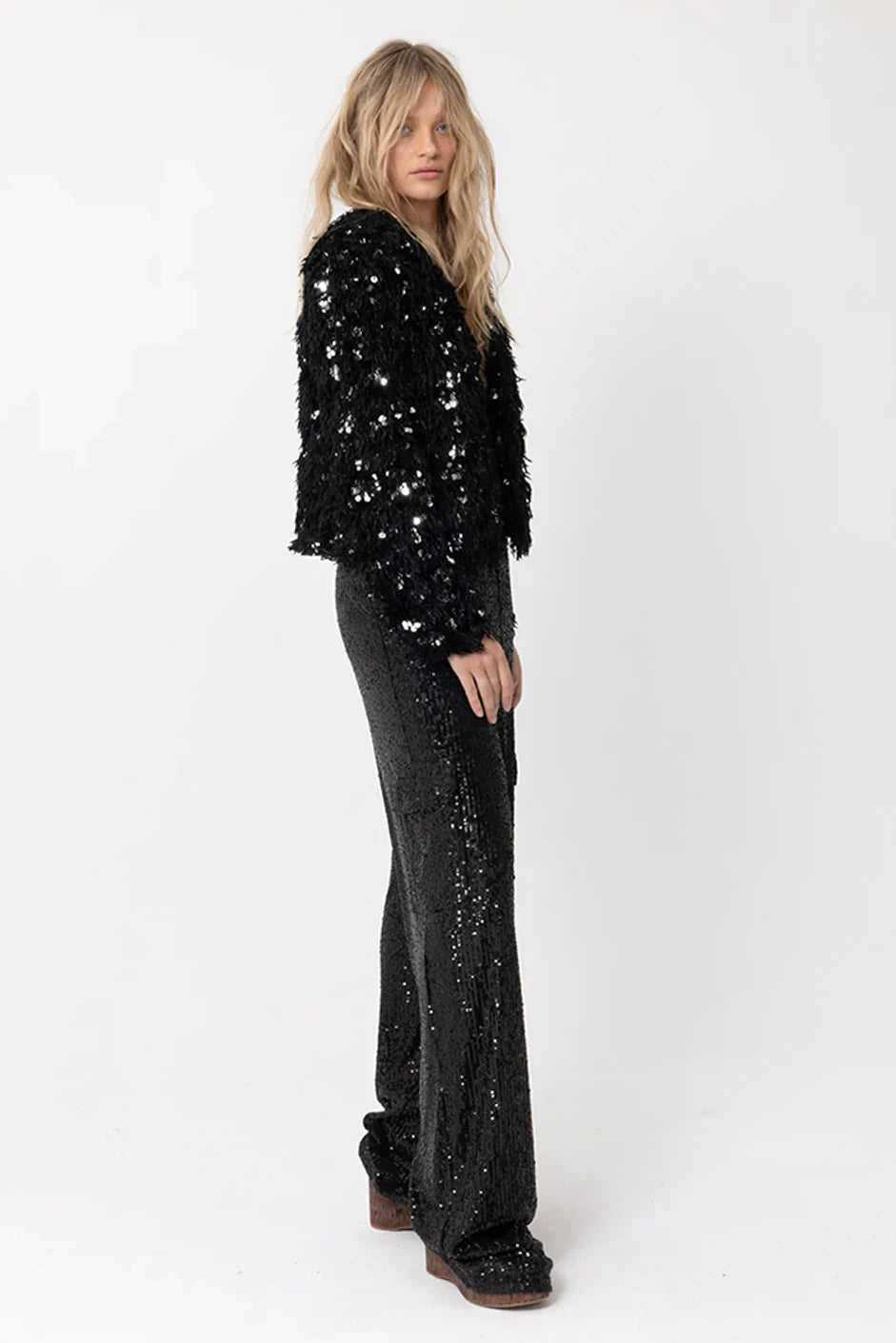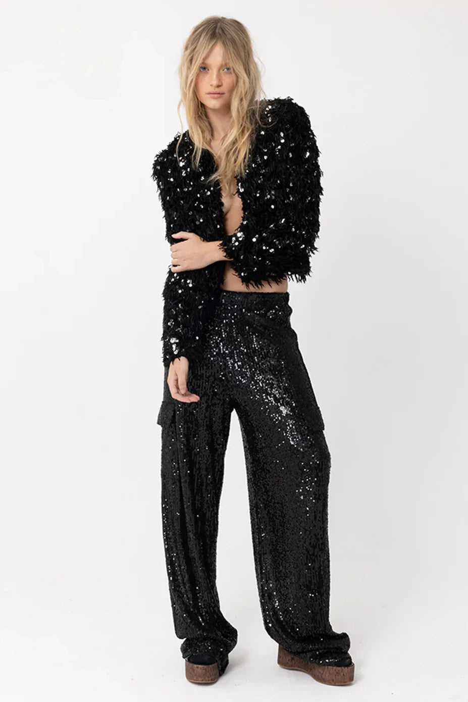The Splendour Jacket in Black is a statement evening piece that exudes glamour and confidence. Featuring hand-sequinned detail across a soft mesh base, it delivers high impact with a surprisingly lightweight feel. The silhouette is slightly tailored with subtle shoulder padding and is fully lined in stretch satin for comfort. Designed to be worn open, this jacket is the perfect finishing layer over sleek pants, dresses or sheer separates—taking any look from understated to unforgettable.