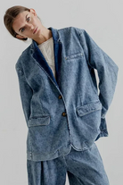 The blazer can be paired with the denim Taylor pants or Pam skirt.