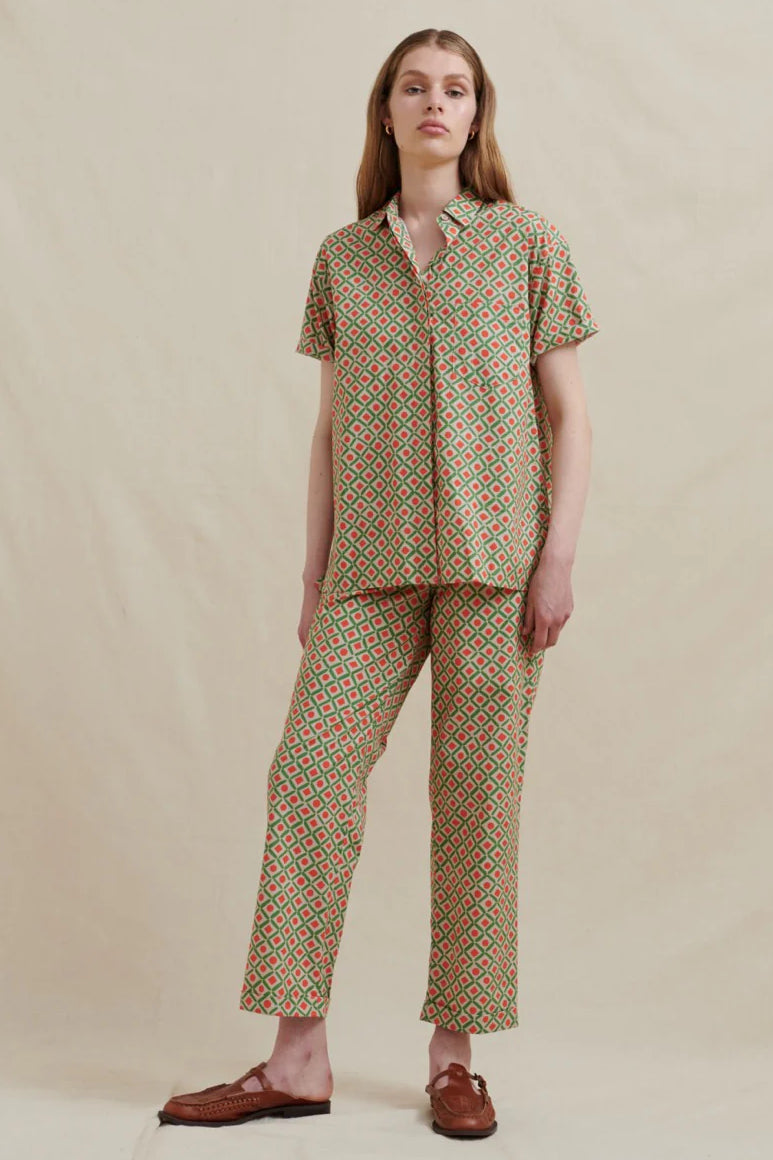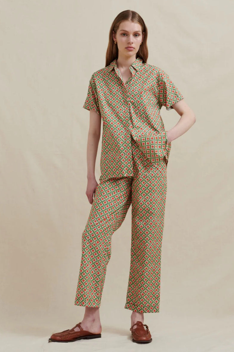 Be summer ready with the bold statement-making Rowland Straight Leg Pant in Orange Geo. Crafted from 100% cotton, this unique, eye-catching pant set features a quirky oriental pattern with a modern flair that will have you looking like you stepped straight out of a European postcard. With its daringly vibrant orange hue and flattering straight-leg fit, you'll be ready to take on the warm weather in style.