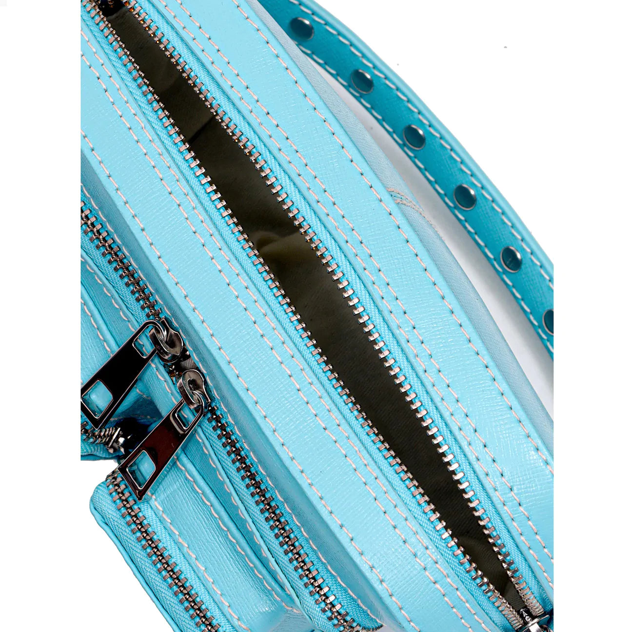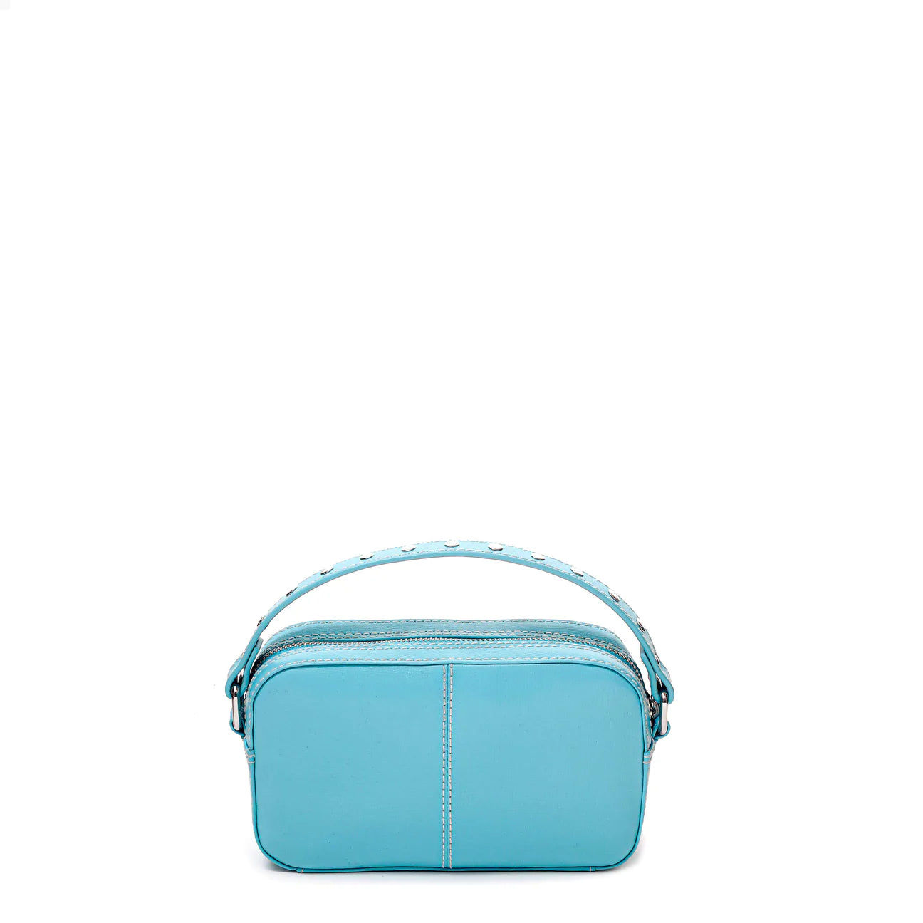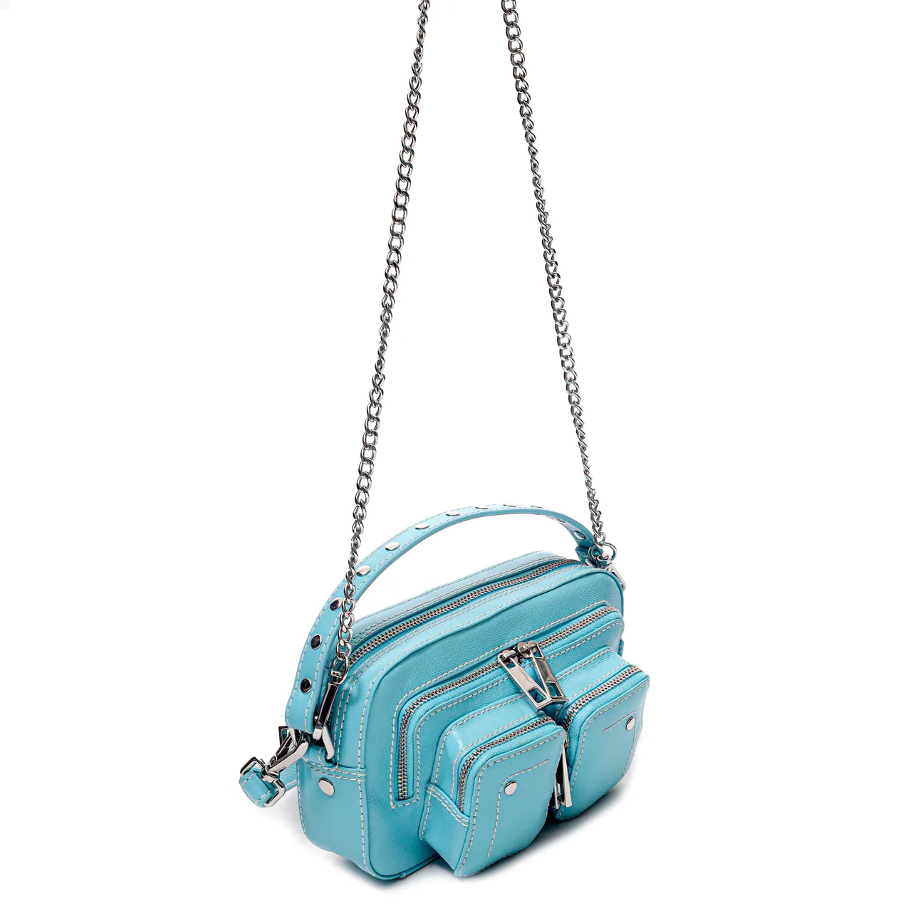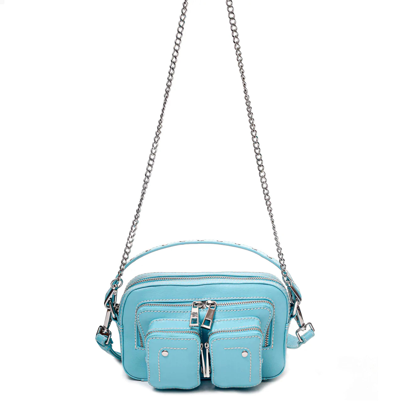 The Helena Bag by Danish Label, Núnoo, has a main compartment and two small compartments on the front of the bag. The bag closes with a zipper. This style comes with an adjustable leather strap and a chain. Also Available in Ibiza Light Green, NZ Black with Studs, NZ Yellow with Studs and NZ White with Studs.