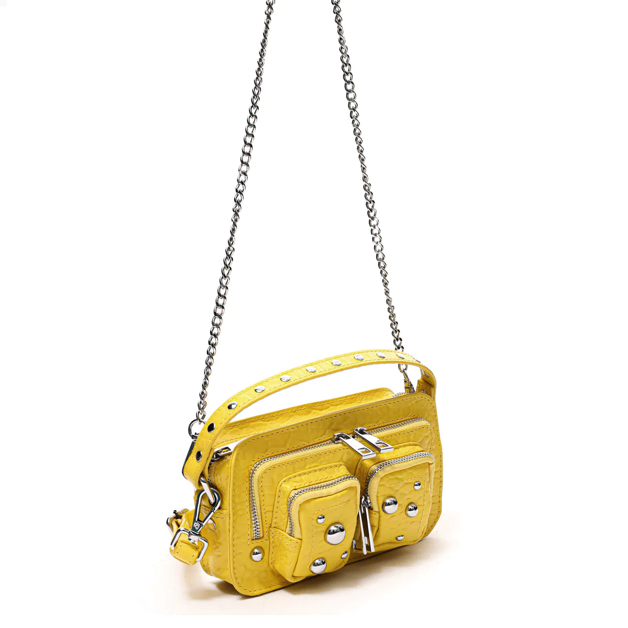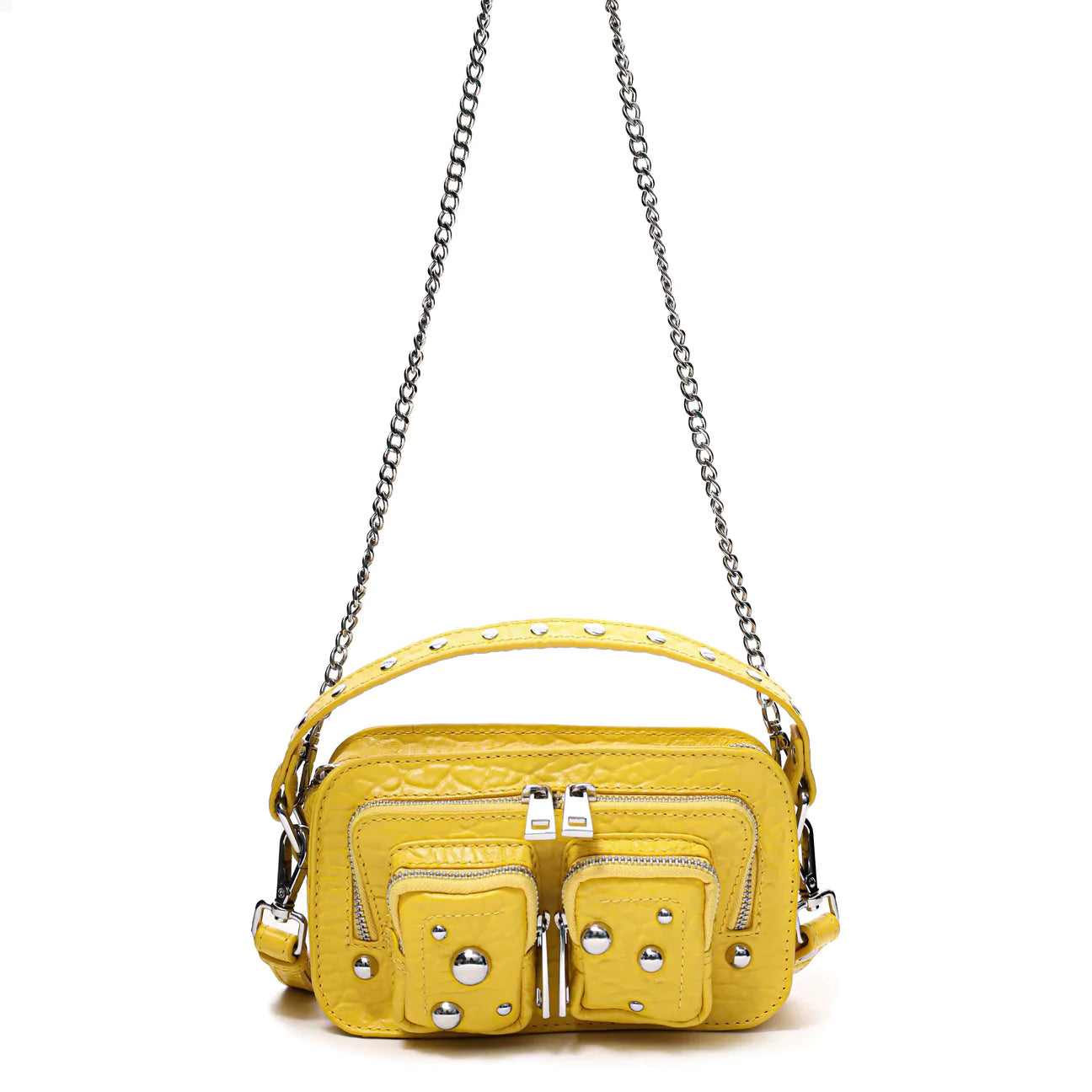 The Helena Bag by Danish Label, Núnoo, has a main compartment and two small compartments on the front of the bag. The bag closes with a zipper. This style comes with an adjustable leather strap and a chain. Also Available in Florence Blue Sky, NZ Black with Studs, NZ White with Studs and Ibiza Light Green.