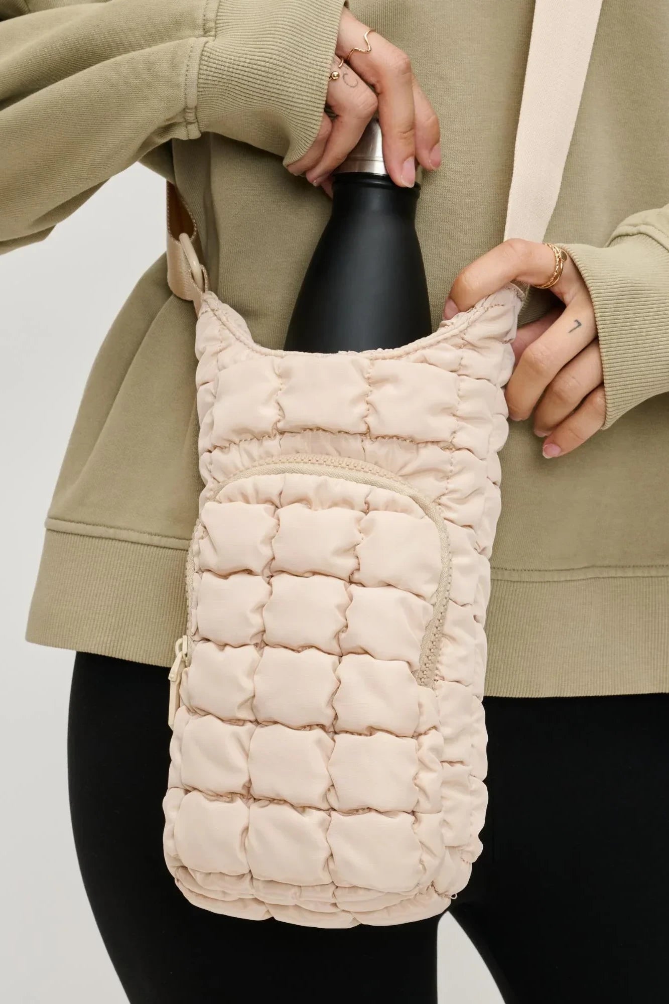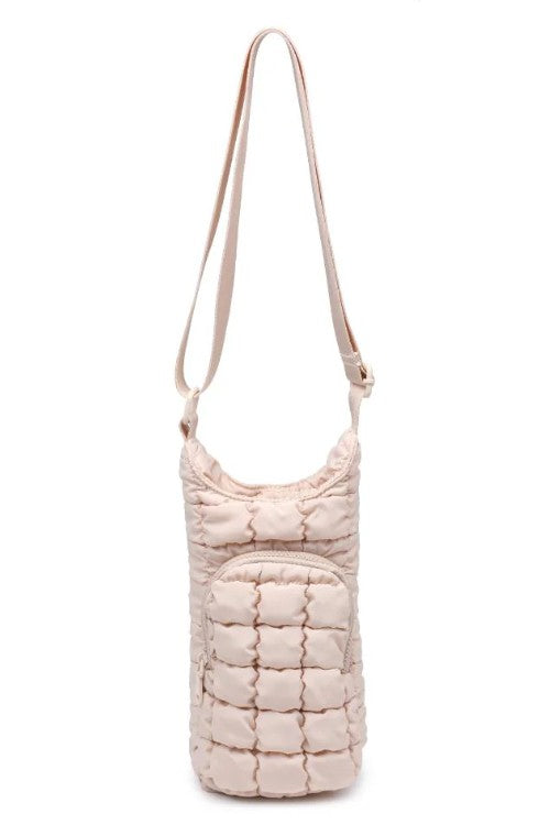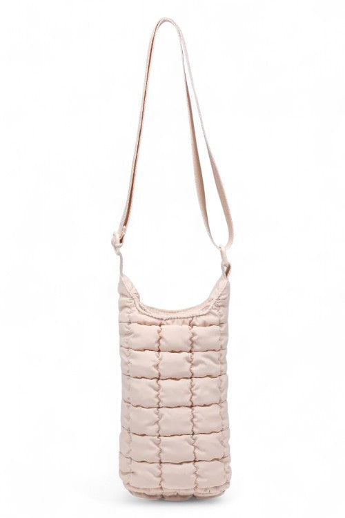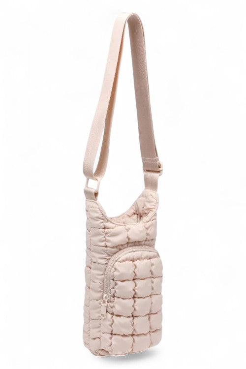 Introducing the Let It Flow Quilted Puffer Water Bottle Crossbody Bag—a fashion-forward essential for all active women! Crafted with care, this bag seamlessly combines fashion and function. Its compact design ensures you stay hydrated on the move, making it your ideal companion for busy days. Carry your water bottle in the center compartment, store your cell phone in the backside slip pocket, and keep your personal essentials organized in the front zippered compartment. Elevate your fashion game while prioritizing health—hydrate in style!