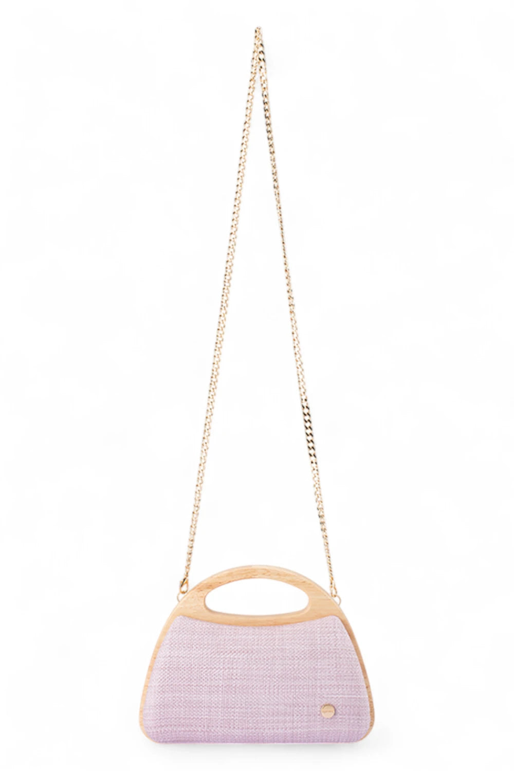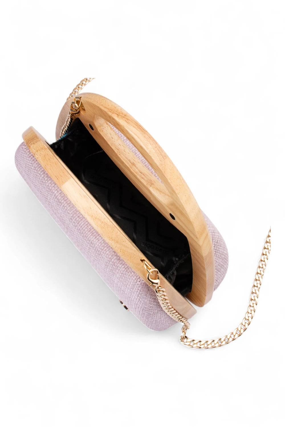 The SARAH Wooden Frame Grab Bag features a stunning woven exterior complemented by a wooden frame. A great option for round the clock events. This bag includes a detachable shoulder chain for when you need to be hands free.