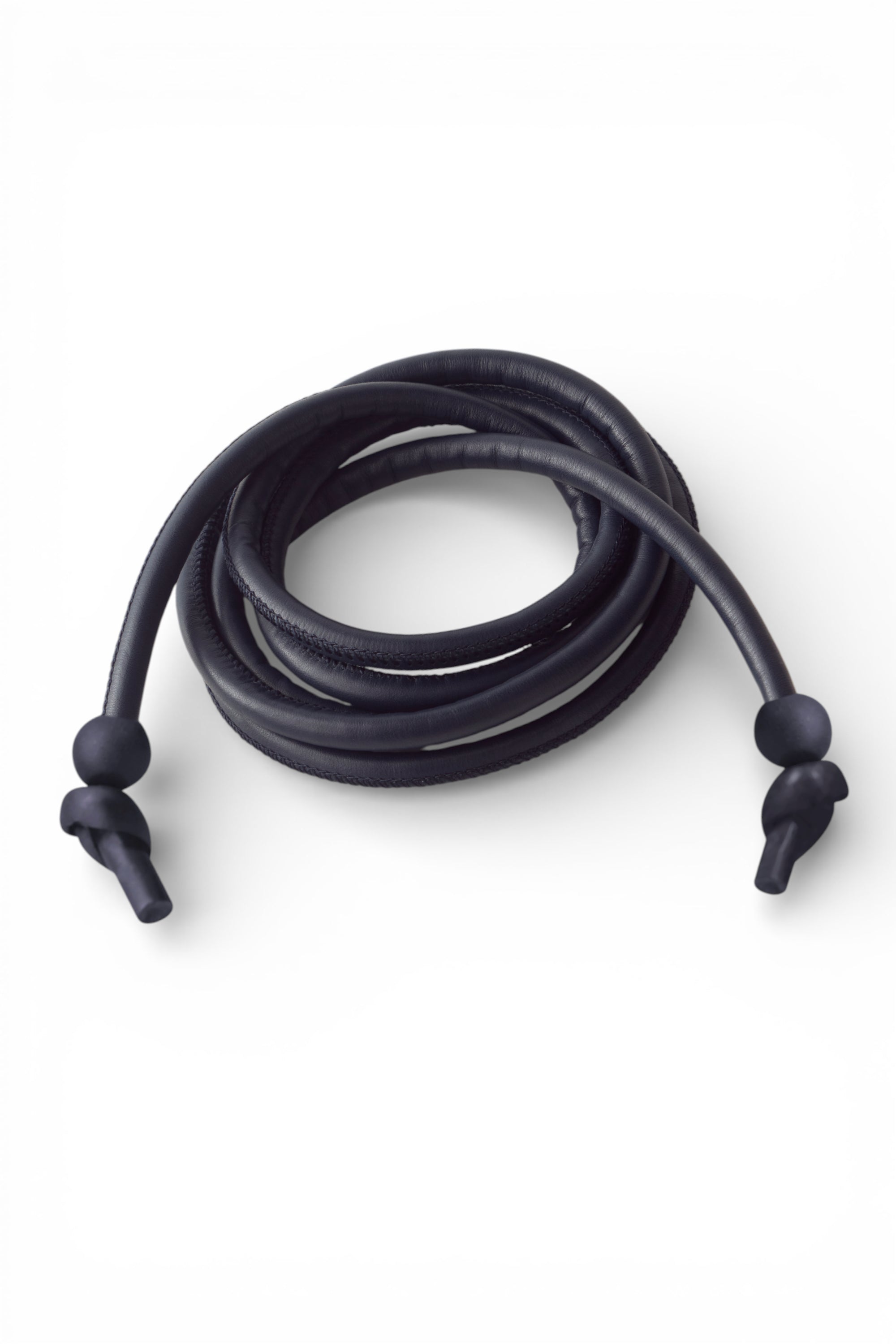 This refined belt is crafted from supple leather rope, designed to softly wrap the waist with understated structure. Finished with a sculptural resin bead and hand-tied knot detailing, the ends are sealed with wax for durability and a clean, considered finish. An accent piece that brings quiet definition to dresses, tailoring or layered silhouettes.