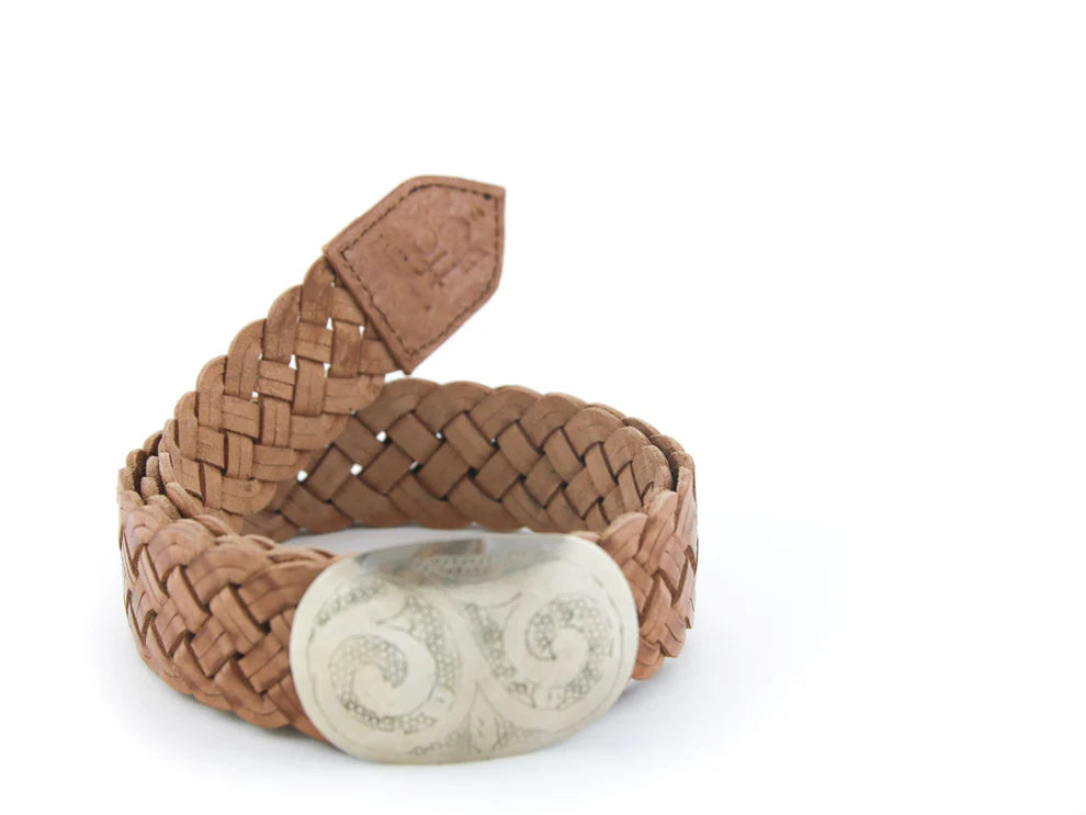 Marrakesh Narrow Plaited Leather Belt with Engraved Oval Buckle