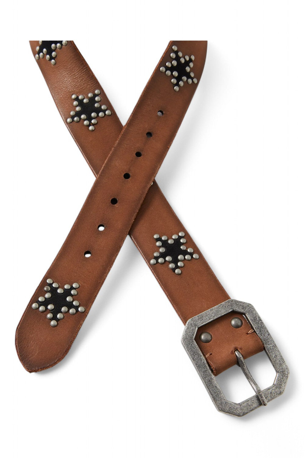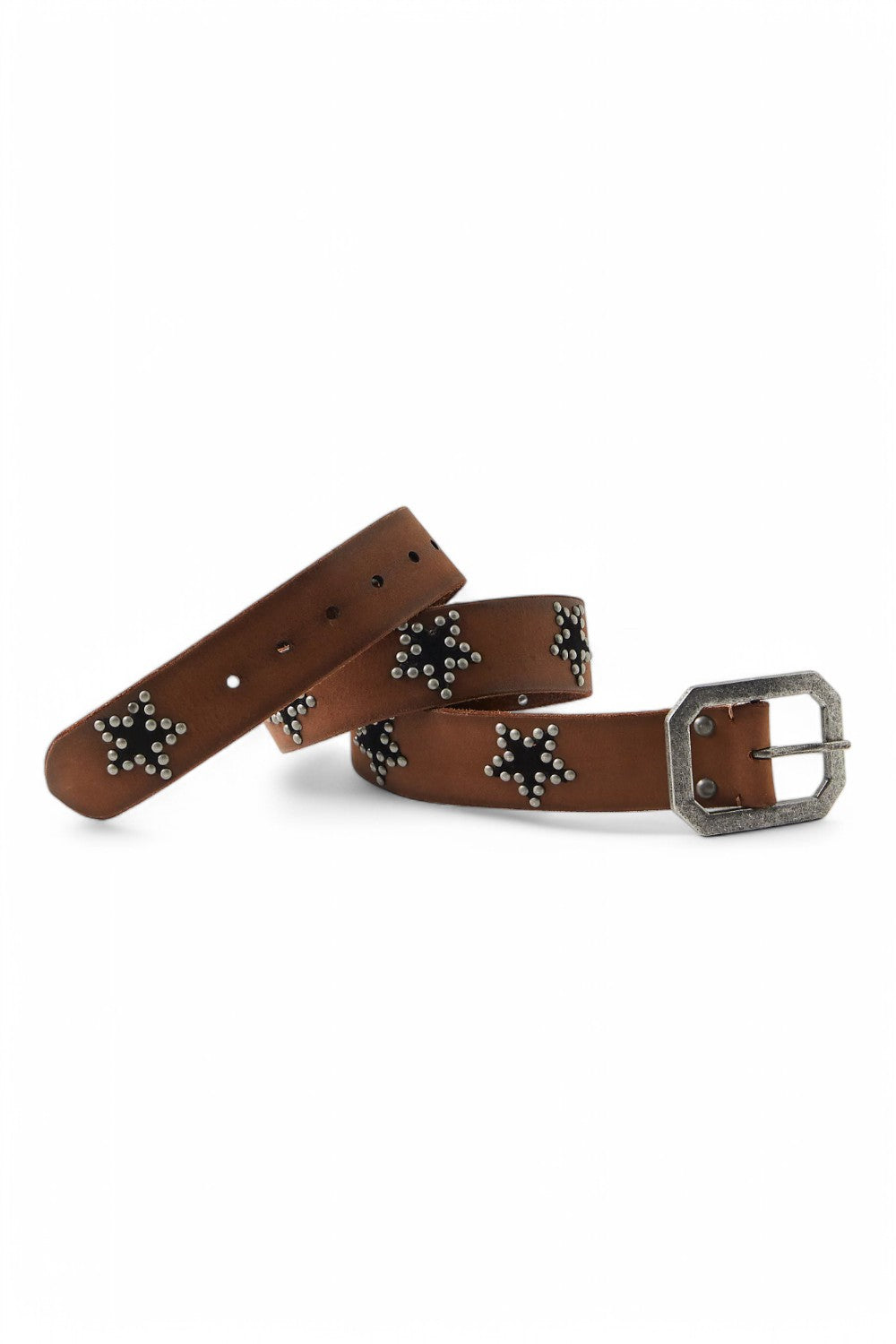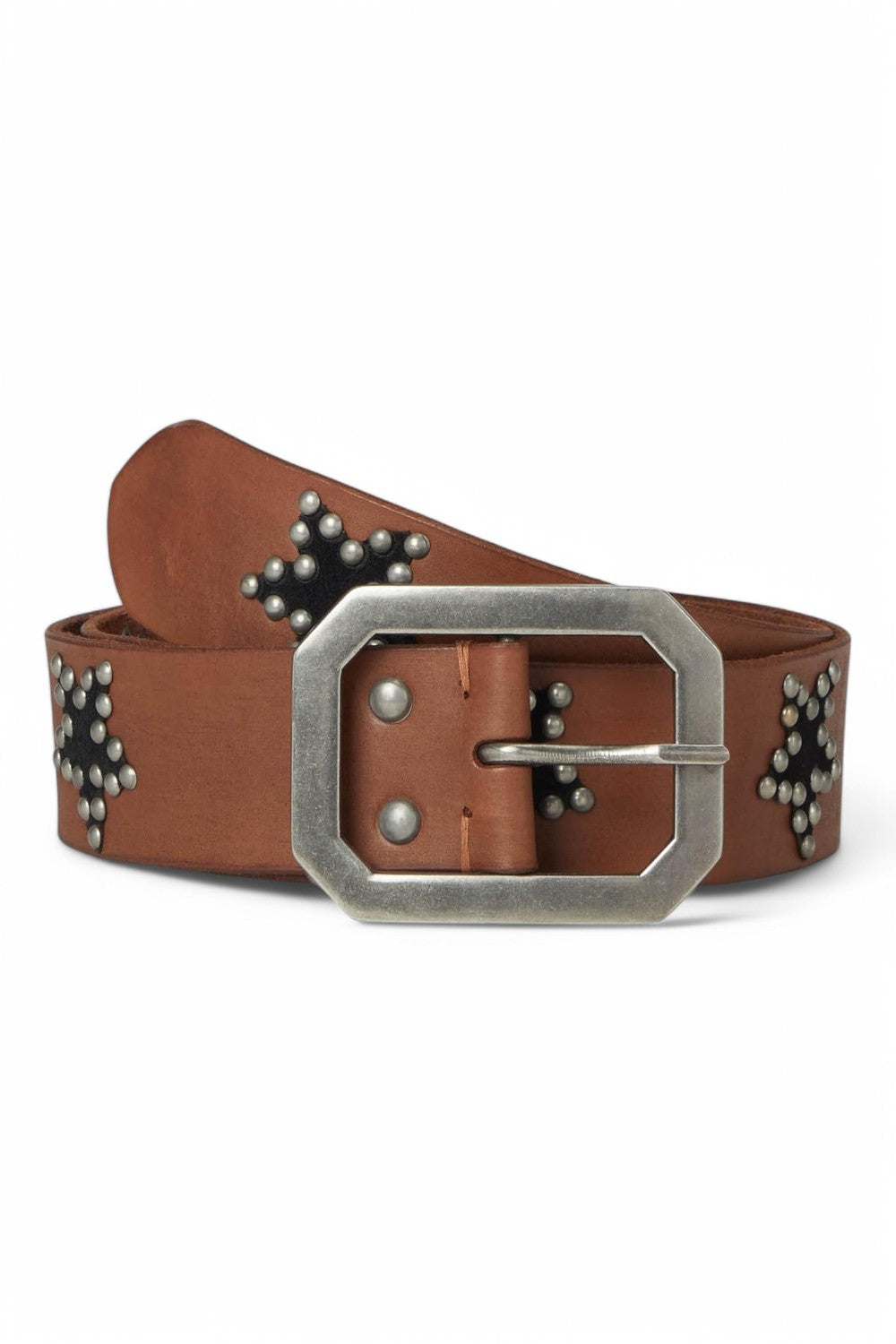 Add necessary embellishment to any look with this soft leather belt, featured in a medium width with studded stars and a classic buckle closure. This star-studded belt can be worn to cinch your waist or to adorn your favorite pair of jeans.