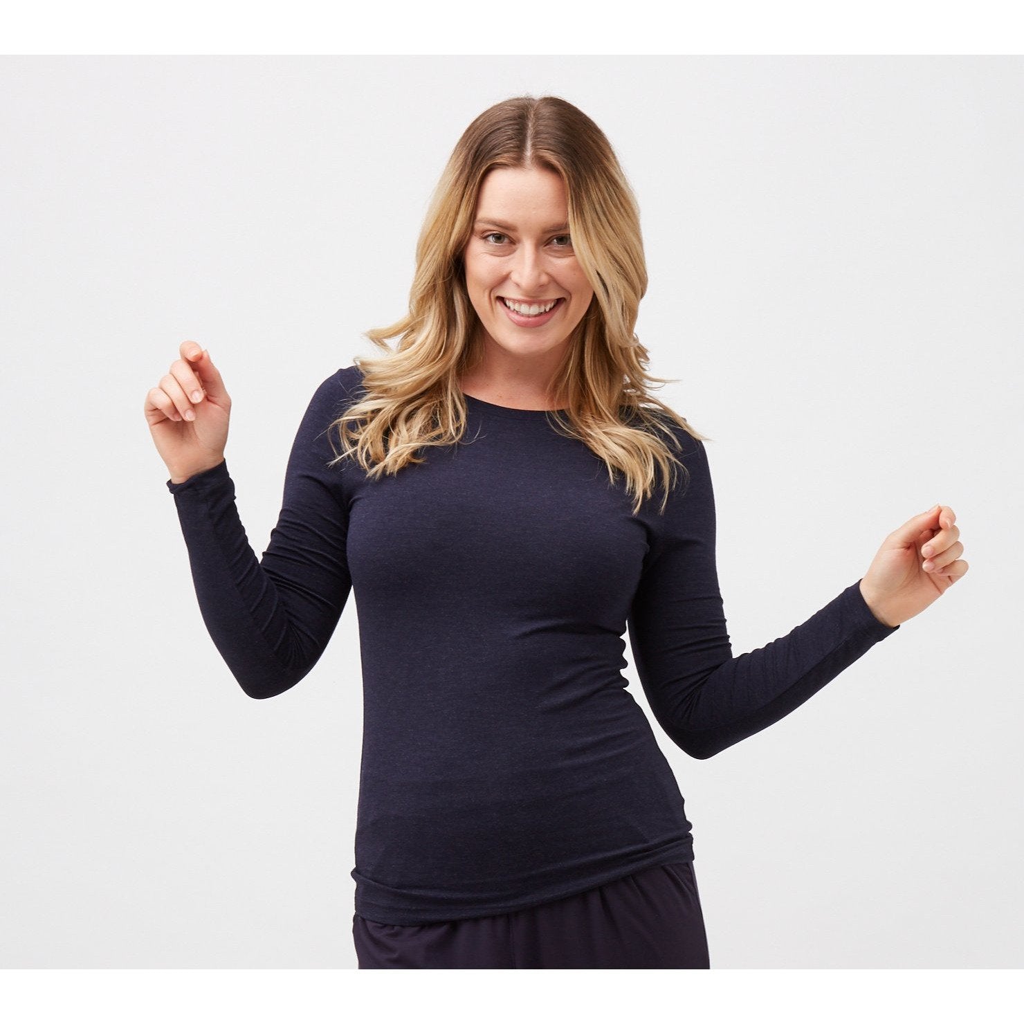 The Best layering top New for winter is the Midnight Marle slightly heavier weight than the usual Tani fabric. High round neckline. Fabric does not retain moisture or odour.  Fitted body shape. Long sleeves.