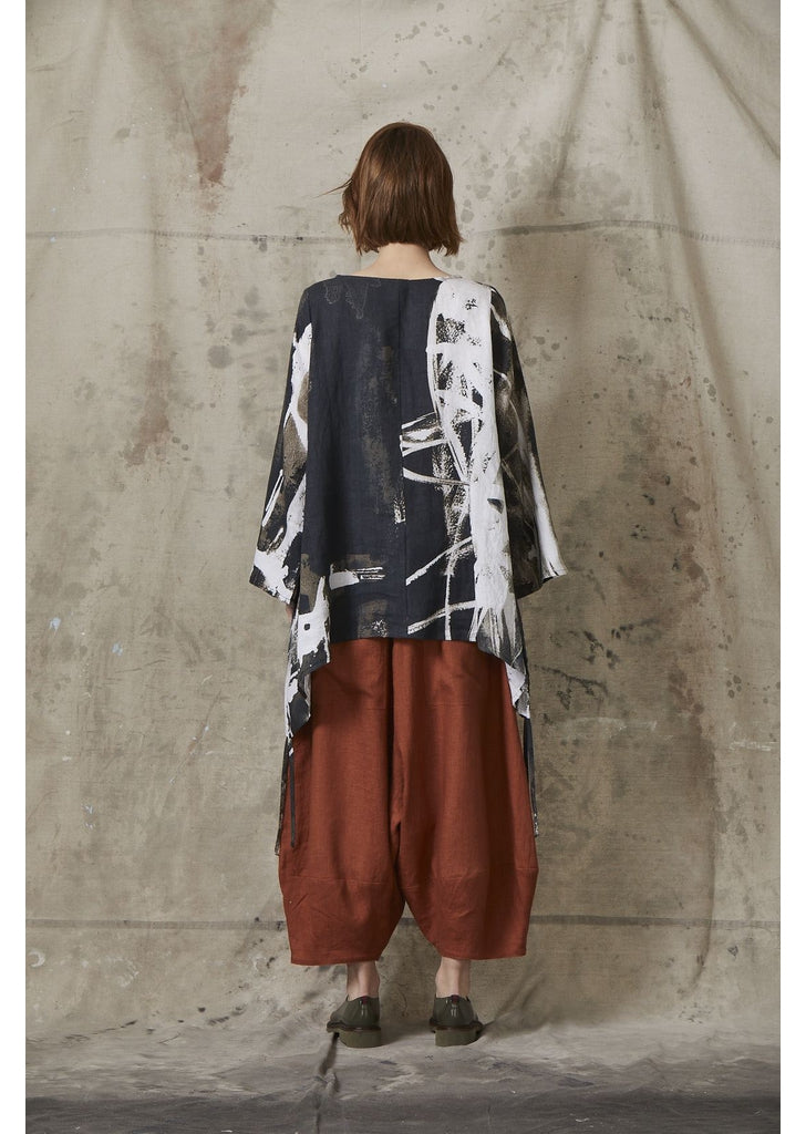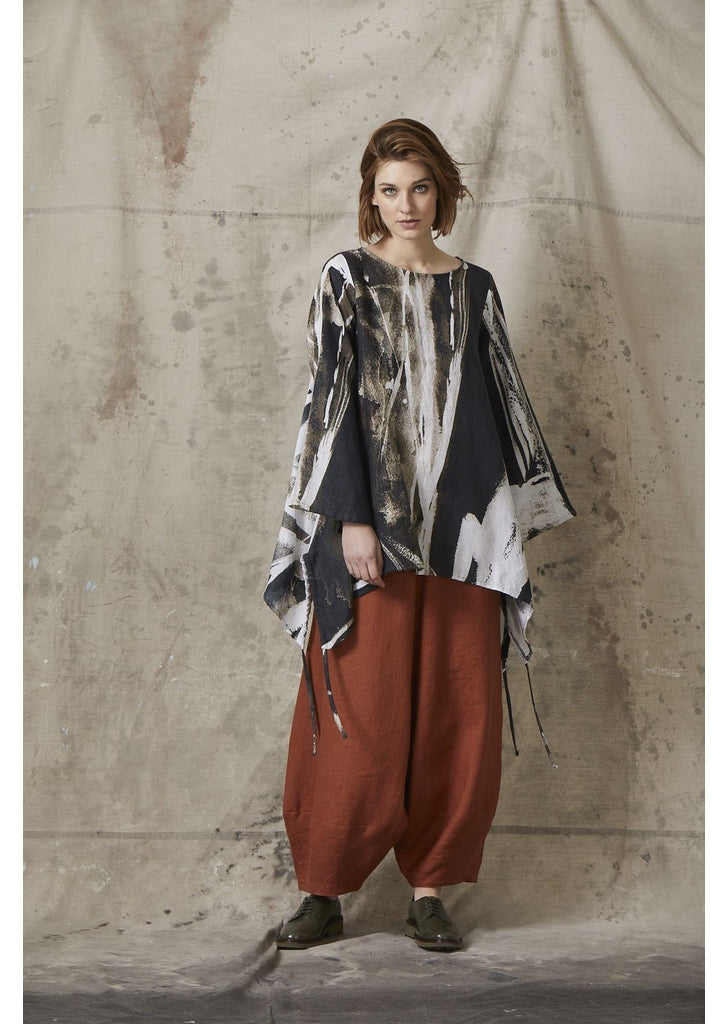 The Bell Culottes in Saffron are featured with the Leisure Tunic in Brushstroke. Both items are available. The European linen is medium weight lending itself to be worn on its own or with a pair of boots and tights for cooler months.