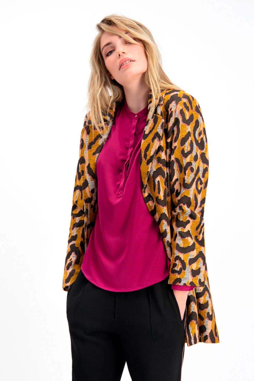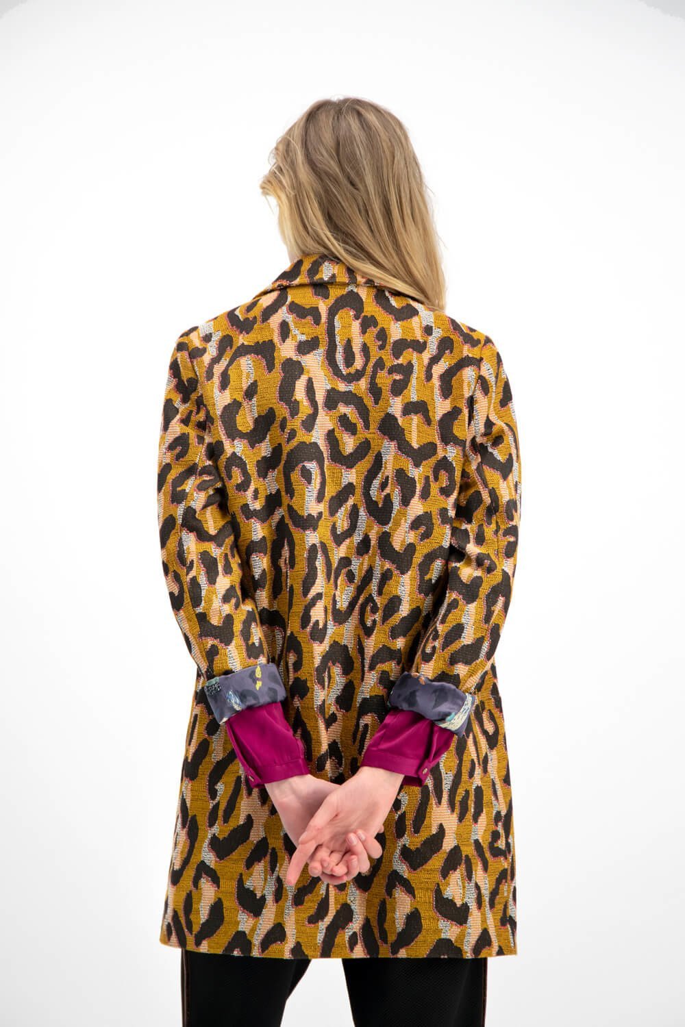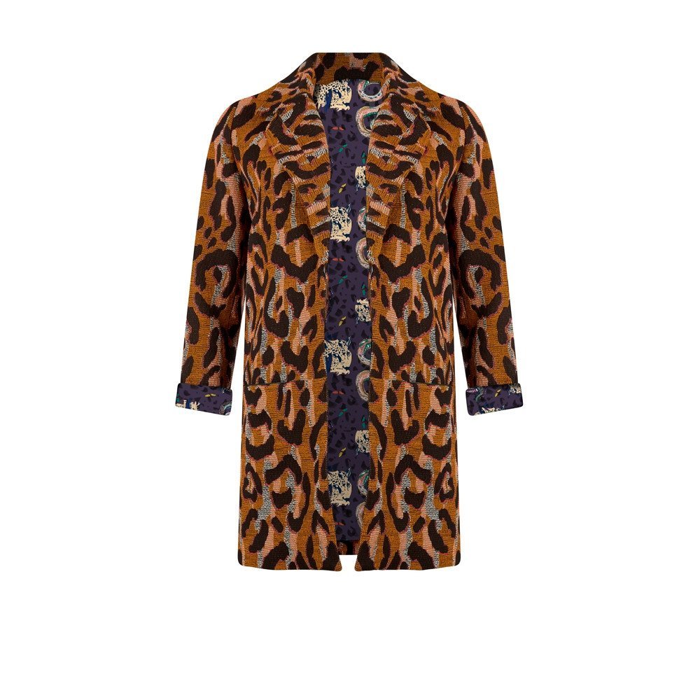 The Big Leopard Jacket in Ocher by POM Amsterdam is an elaborately processed jacket made of a Jaquard outer fabric in trendy leopard design on an ocher-colored background. The jacket is completed with a beautiful lining, adorned with a wild jungle print on a purple base colour.
