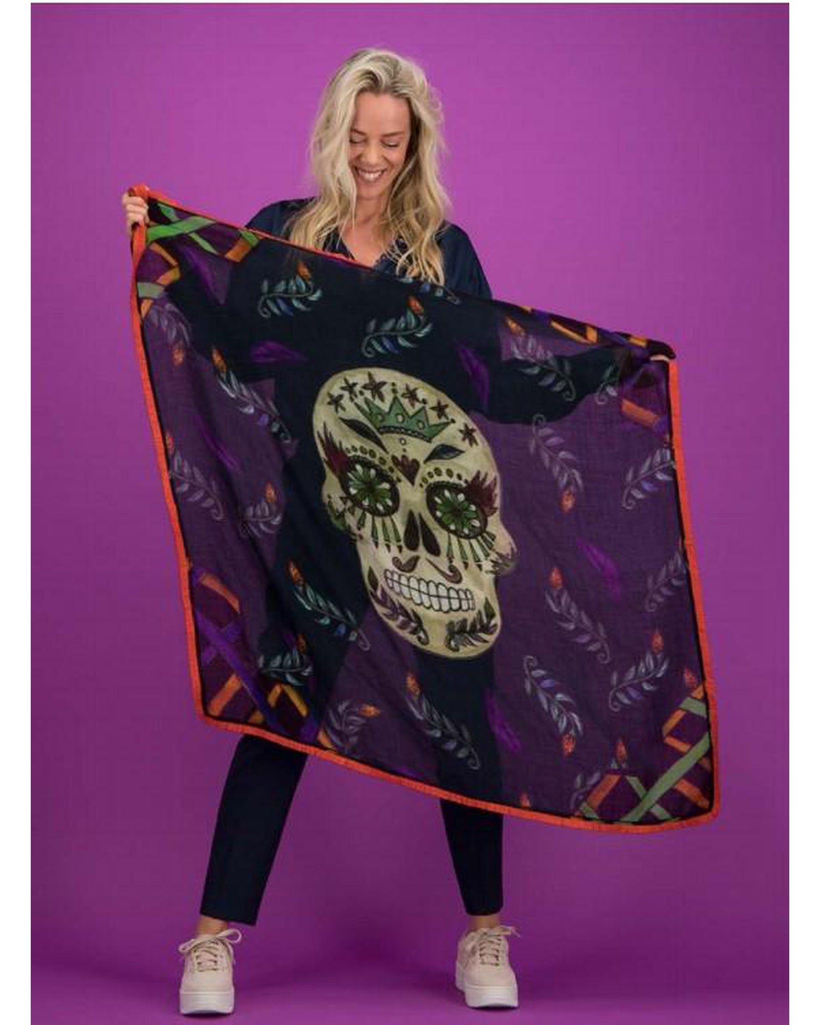 This 100% wool Calaveras Maxi Shawl by POM Amsterdam is inspired by the Día de los Muertos Latin holiday. Its hues of purple, orange and dark blue are beautifully autumnal. Perfect to wrap up in the cooler weather.