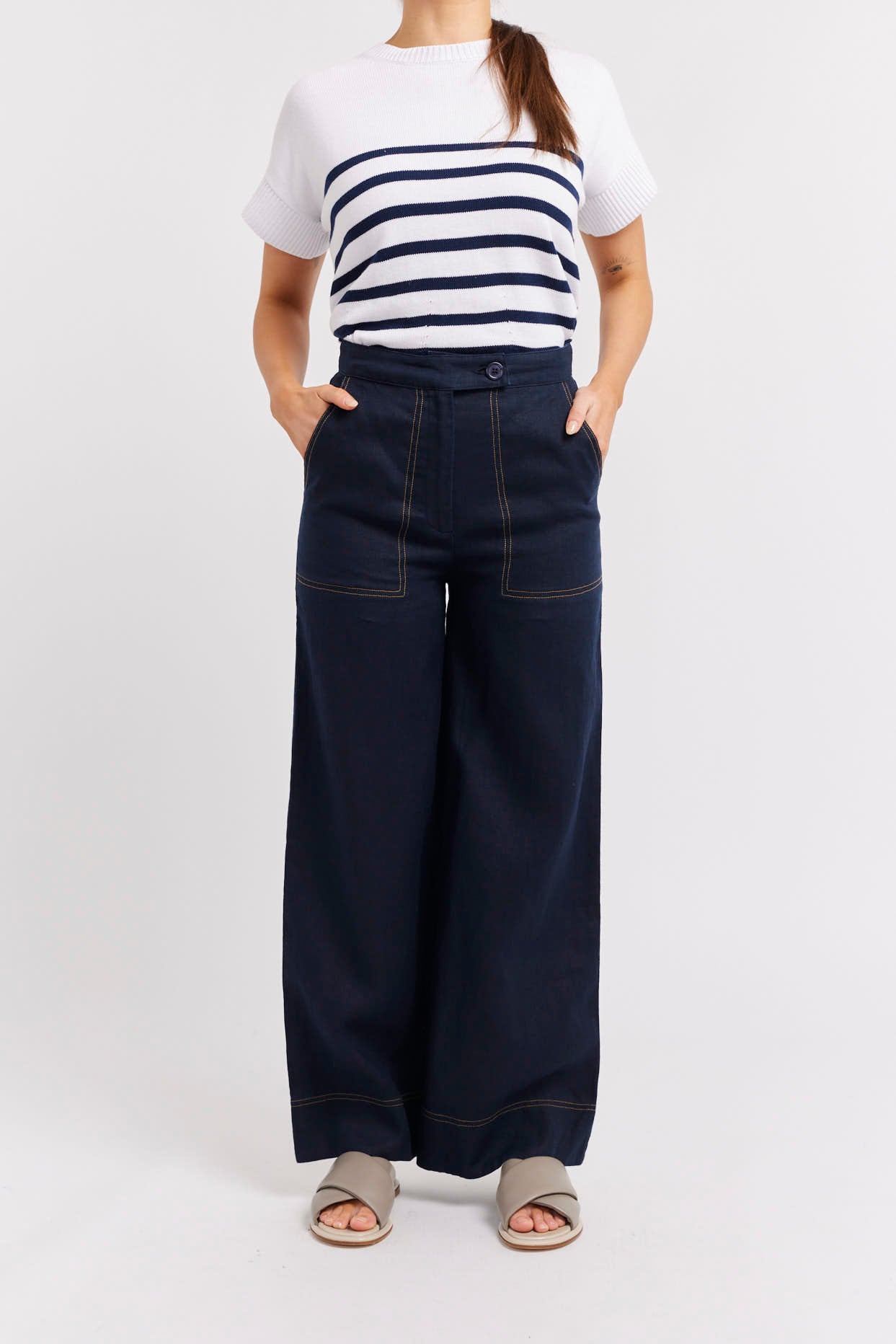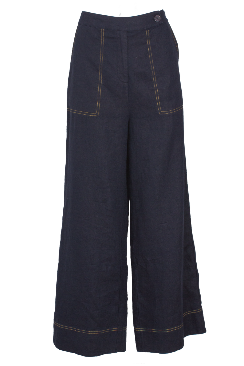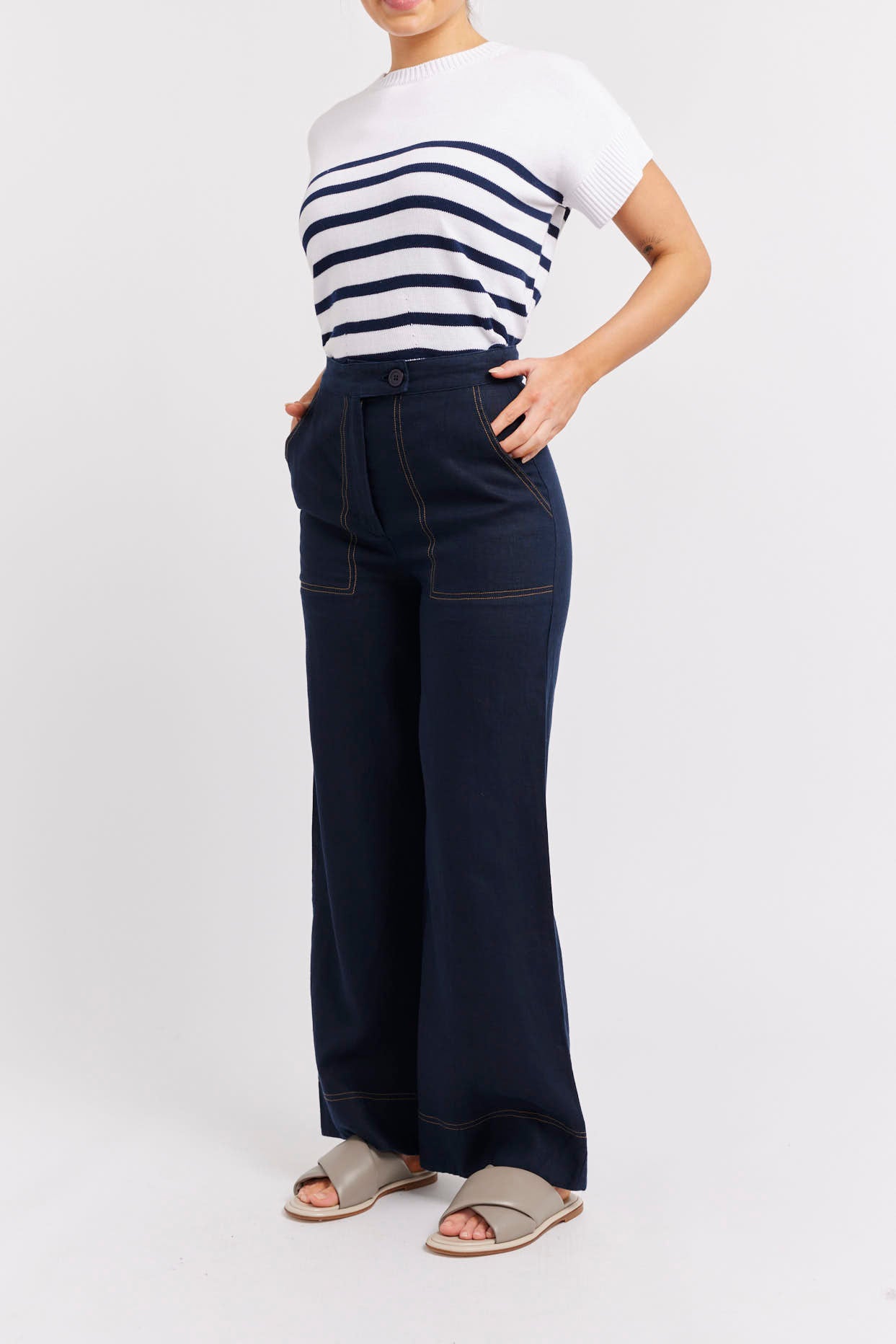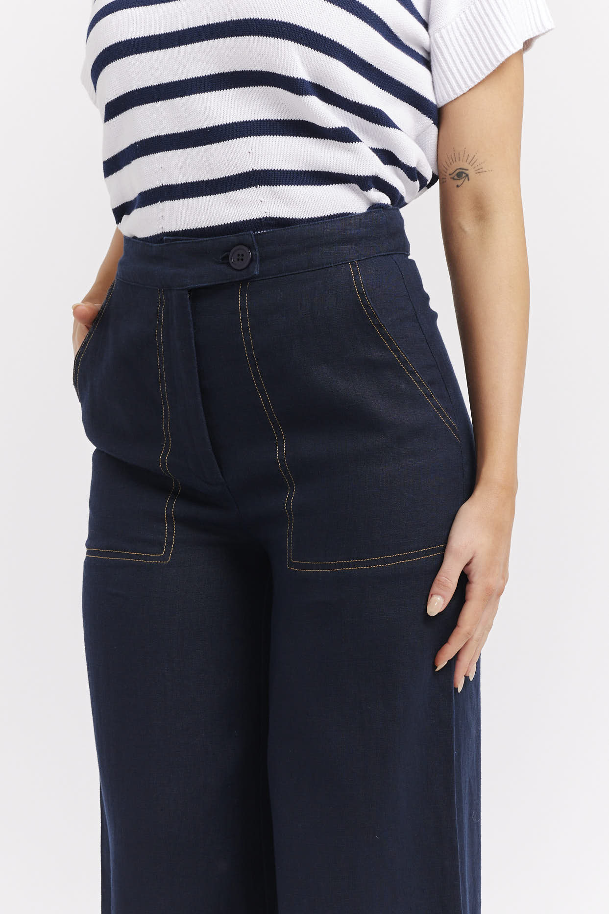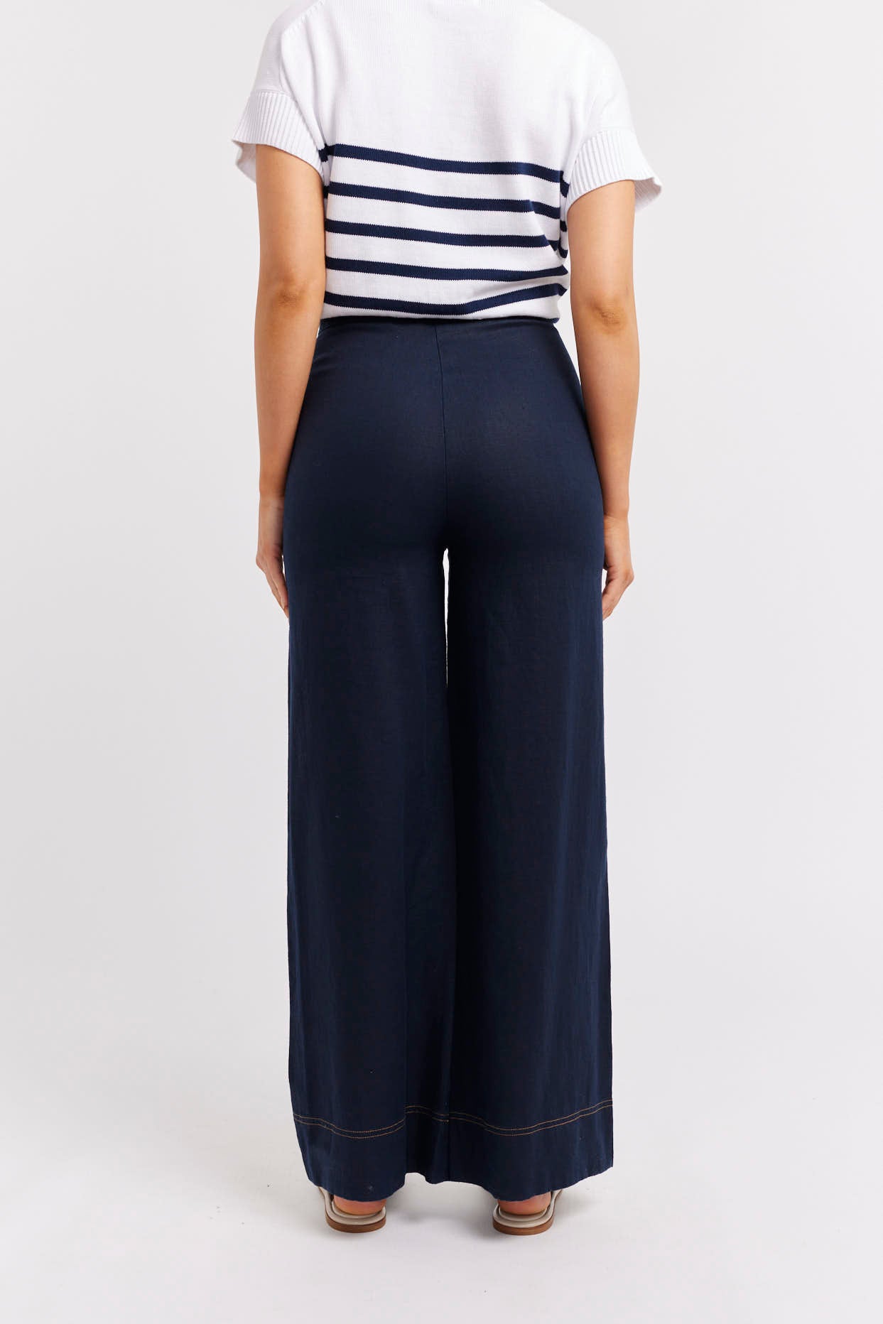 The Clio Linen Pant in Navy offers a sophisticated summer look that will make a lasting impression. Crafted from a luxurious linen fabric, it features structured lines, eye-catching Neutral stitching, and an asymmetrical button opening for subtle asymmetry. With a deep hemline for an optimal fit, this pant is the perfect way to stay looking stylish and feeling fresh all summer long.