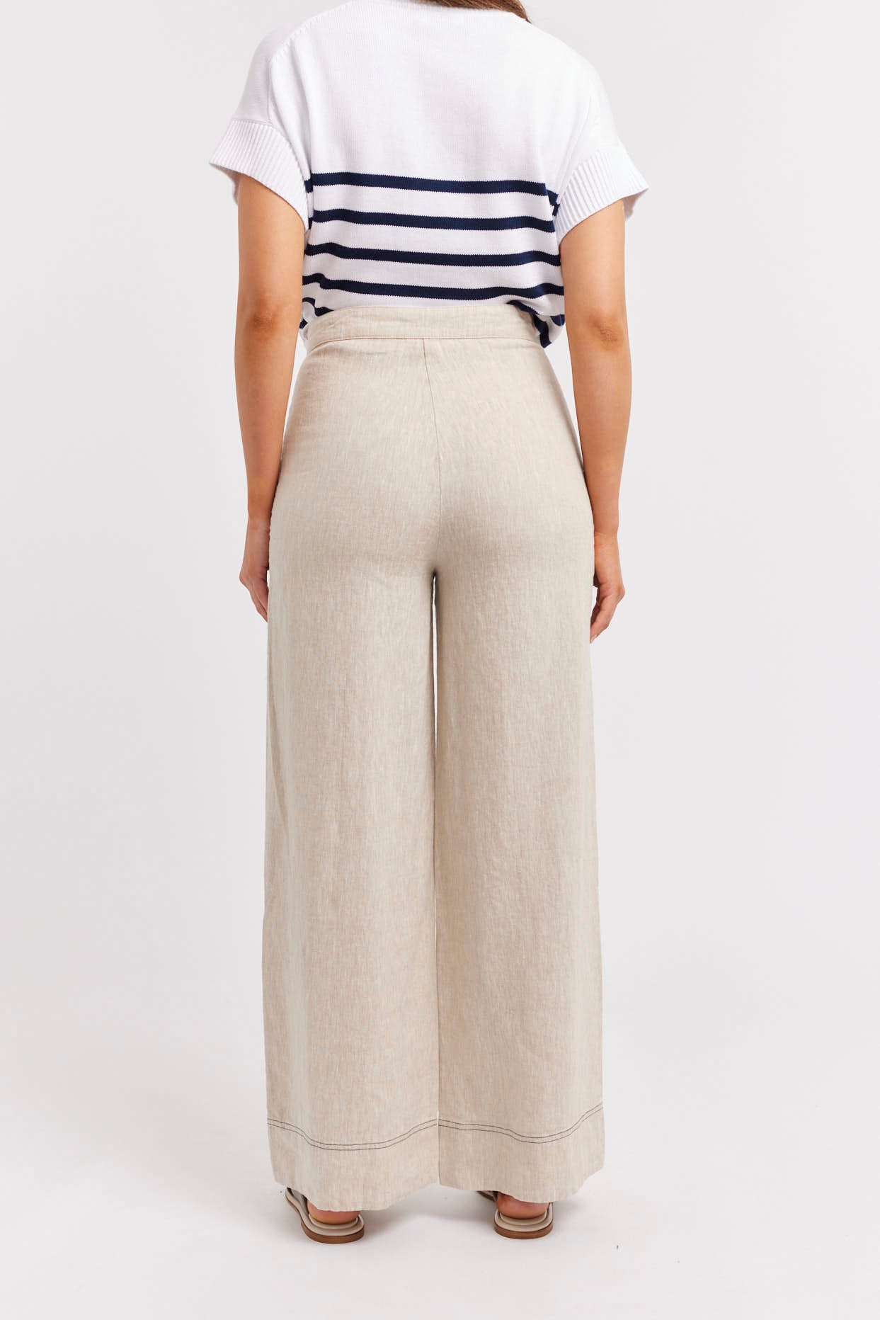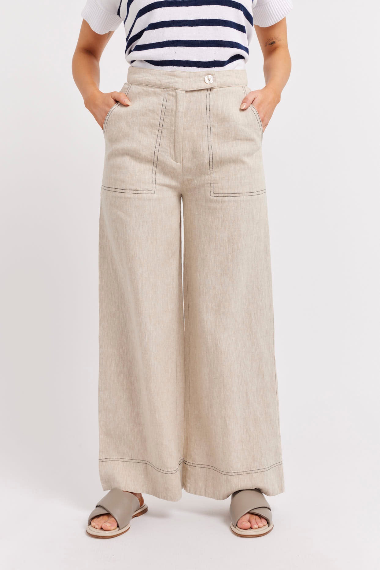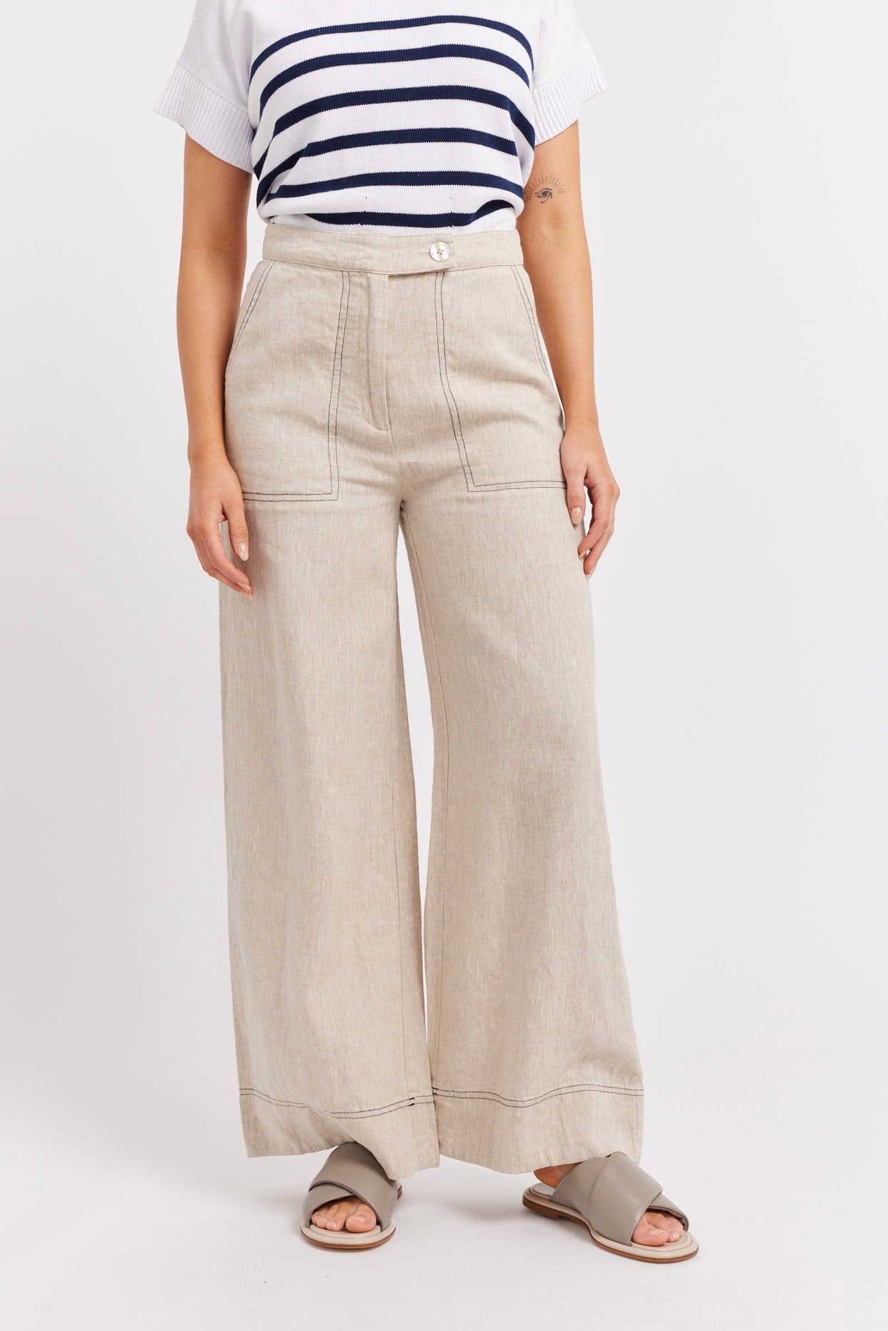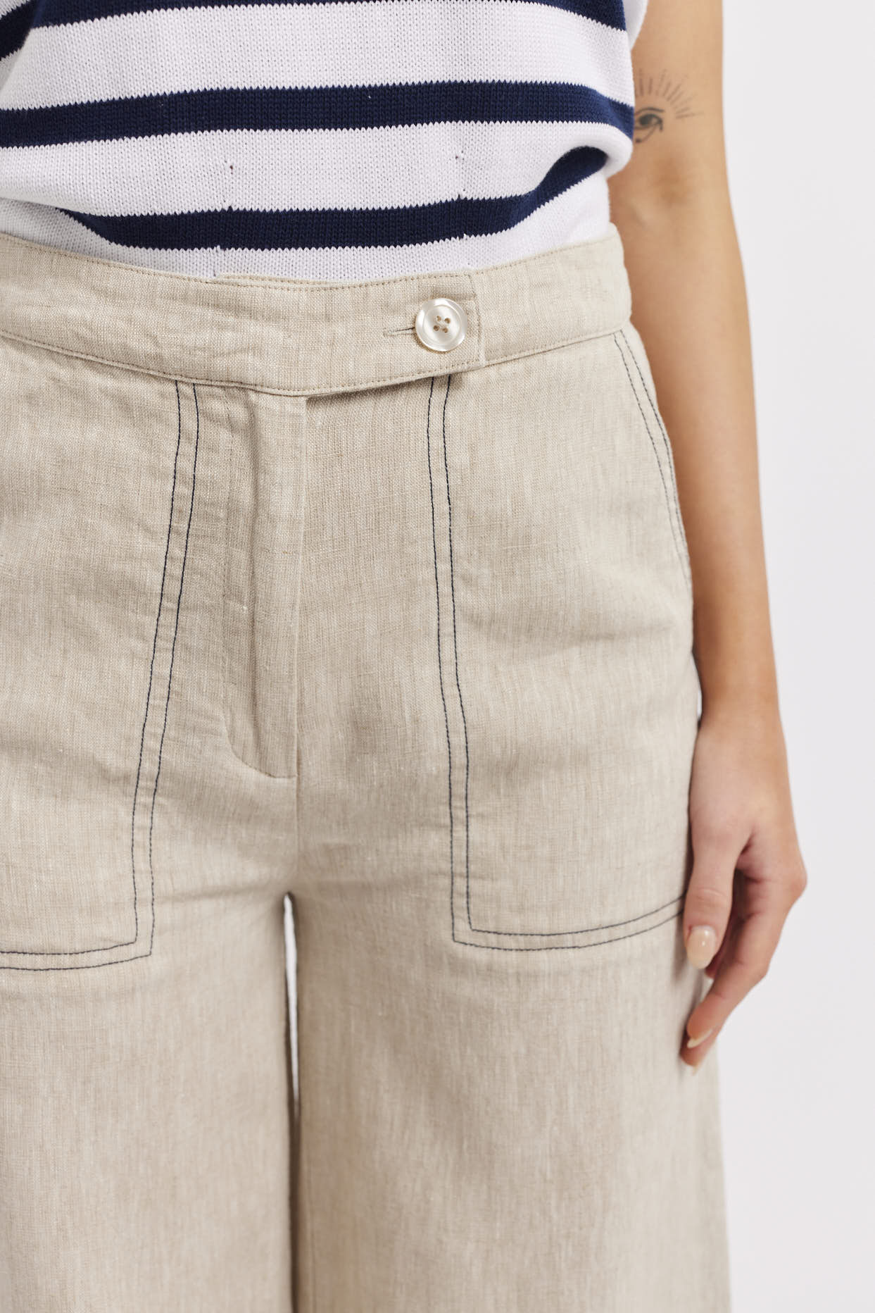 The Clio Linen Pant in String offers a sophisticated summer look that will make a lasting impression. Crafted from a luxurious linen fabric, it features structured lines, eye-catching navy-blue stitching, and an asymmetrical button opening for subtle asymmetry. With a deep hemline for an optimal fit, this pant is the perfect way to stay looking stylish and feeling fresh all summer long.