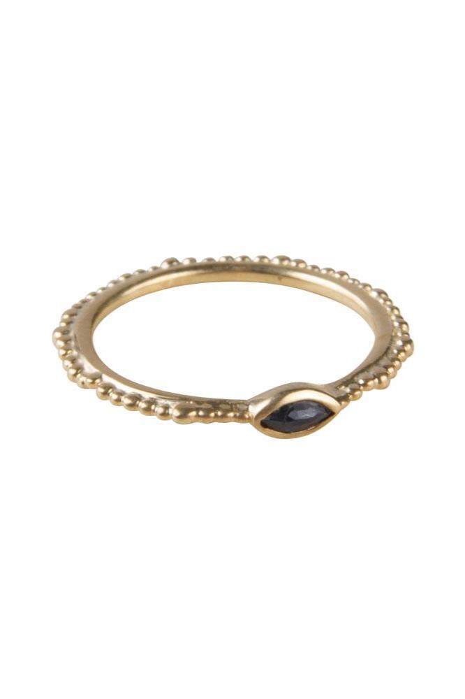 This stacker band features an elegant blue sapphire, the stone of mental activation that helps us to see our inner wisdom, set in sterling silver 24k Italian gold plate with uneven granules around the band.