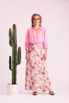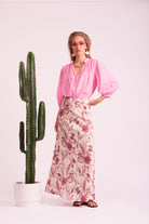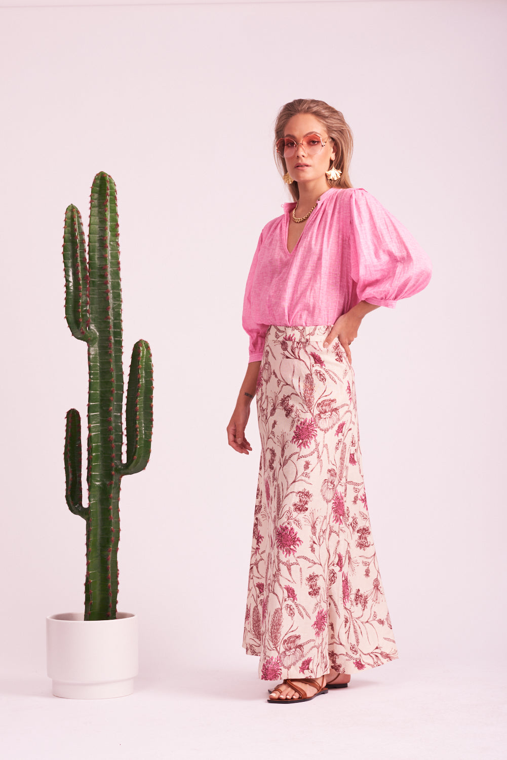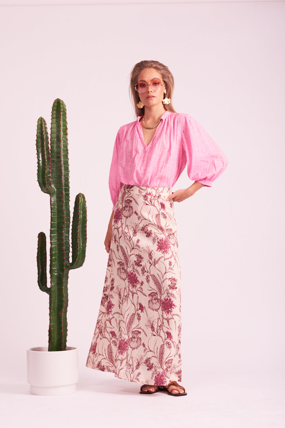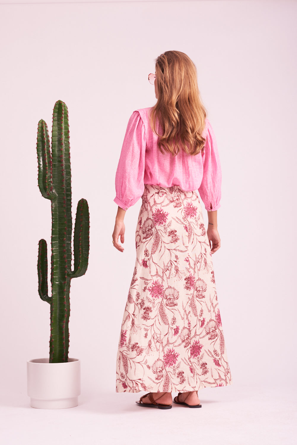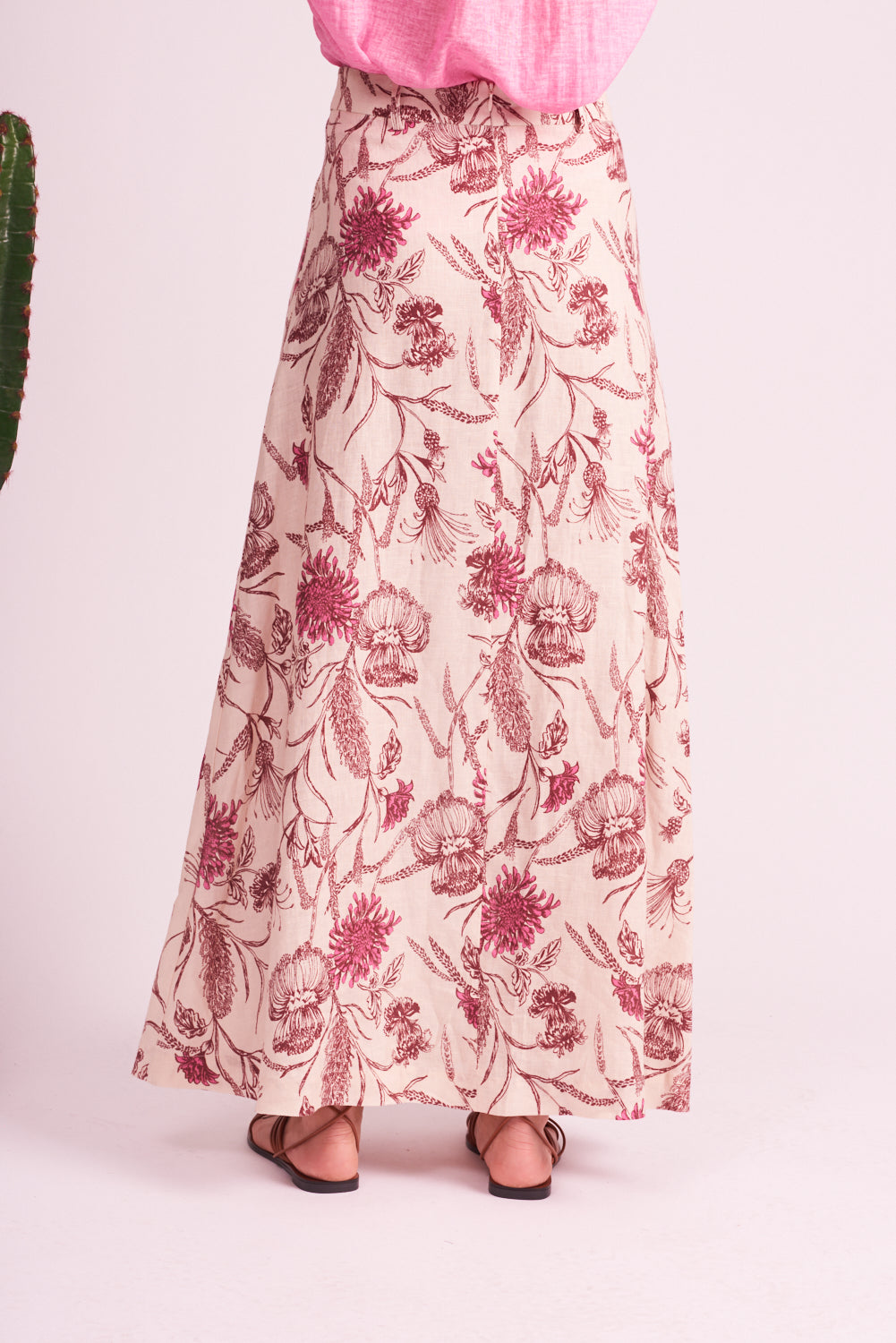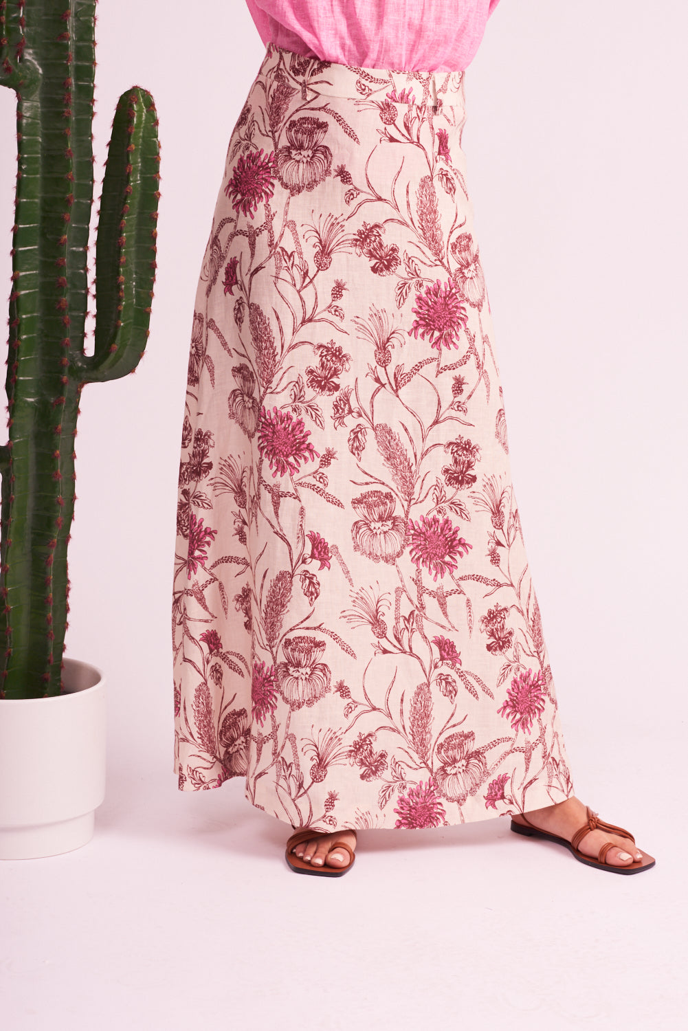 You'll love this stunning skirt. Made from an exclusive French linen (printed in France by a heritage listed fabric mill) it features a large abstract floral in burgundy with pops of fuschia pink. Featuring a flattering A-line shape with self tie, it is half lined in ultra soft cotton voile. Looks stunning back with our Cocktail Hour Linen top or Breezy Desert Smock Top. Also looks fab back with our Jetset Blazer for more polished look. You'll want to keep this one forever.
