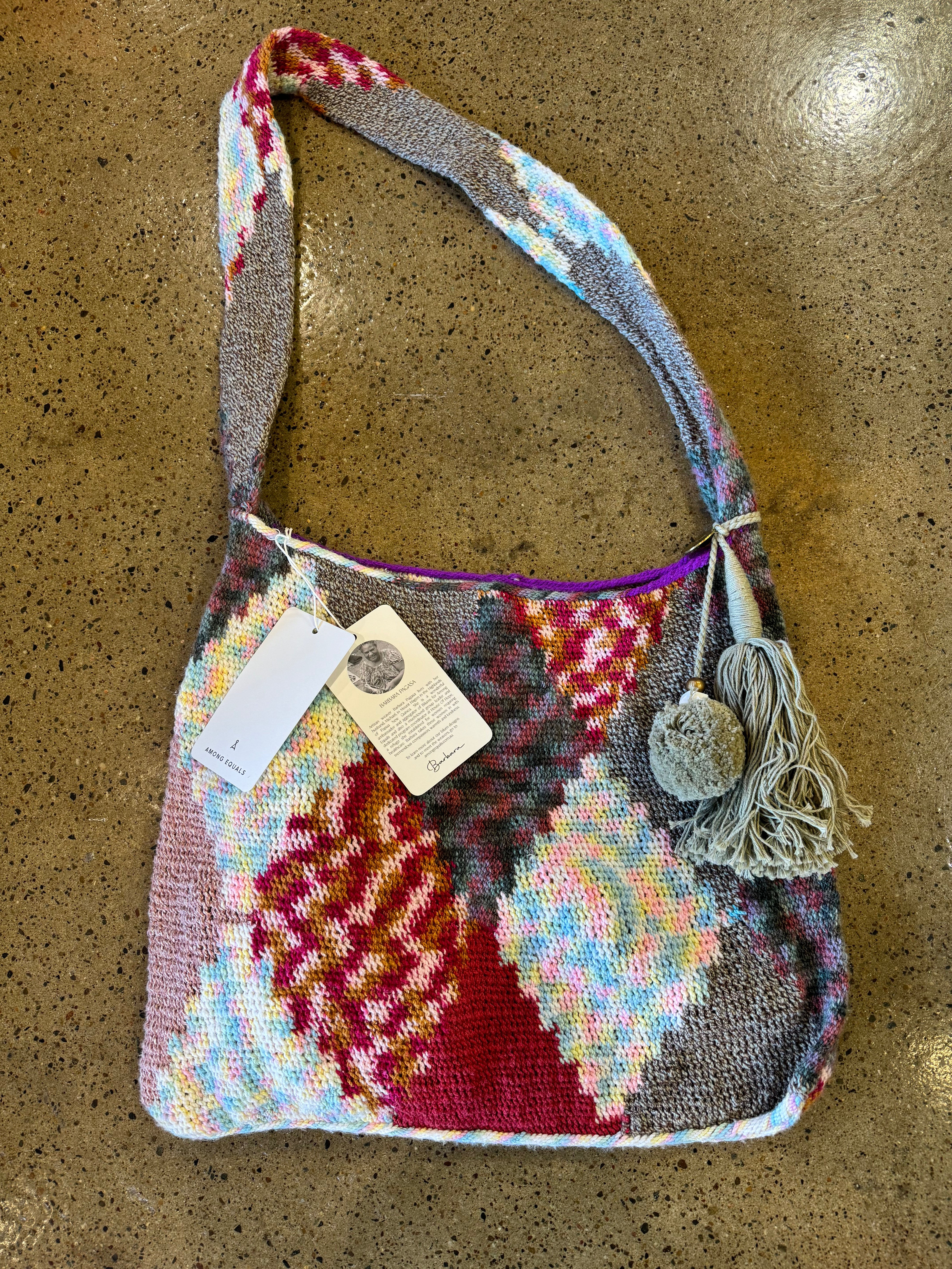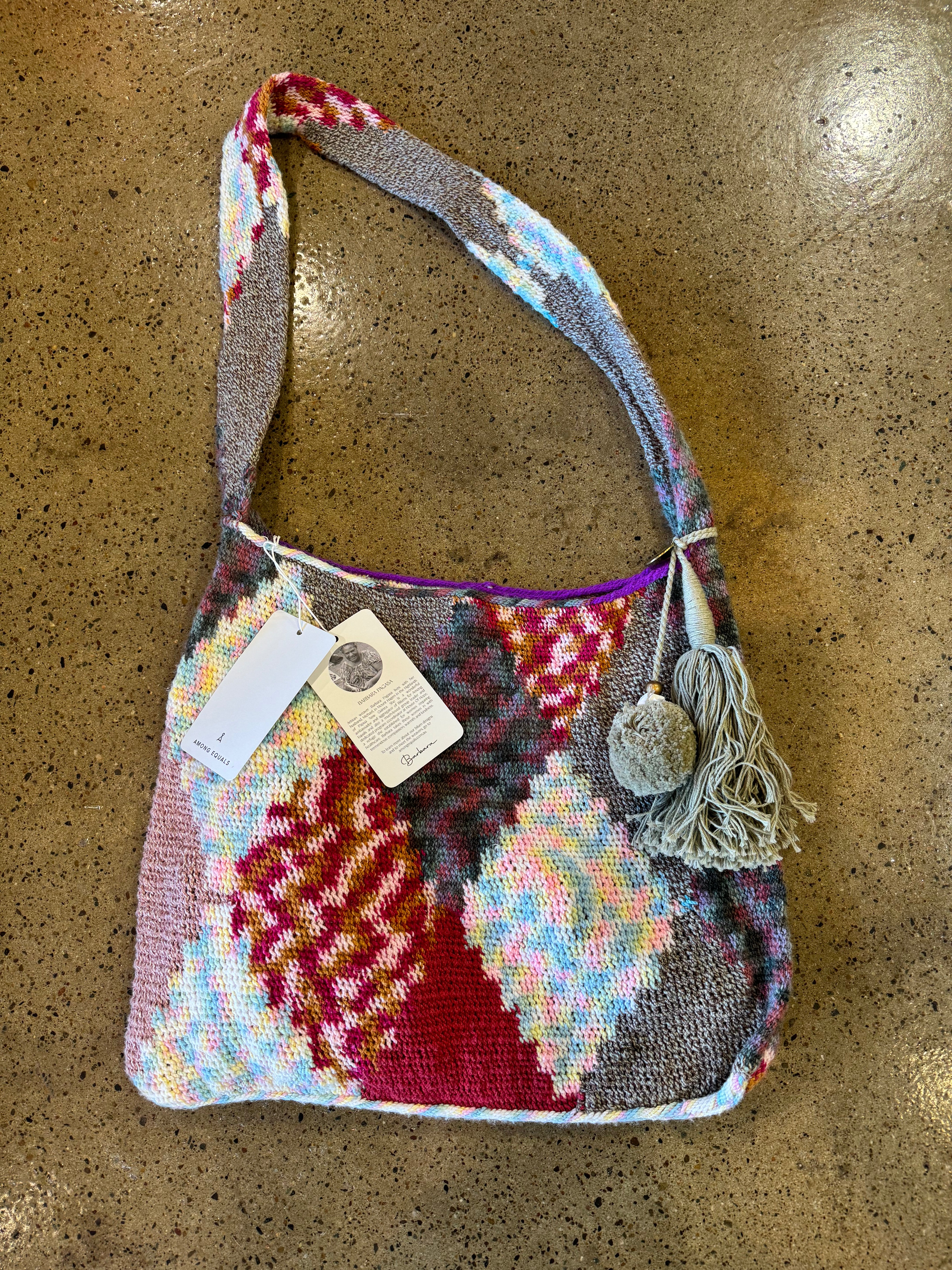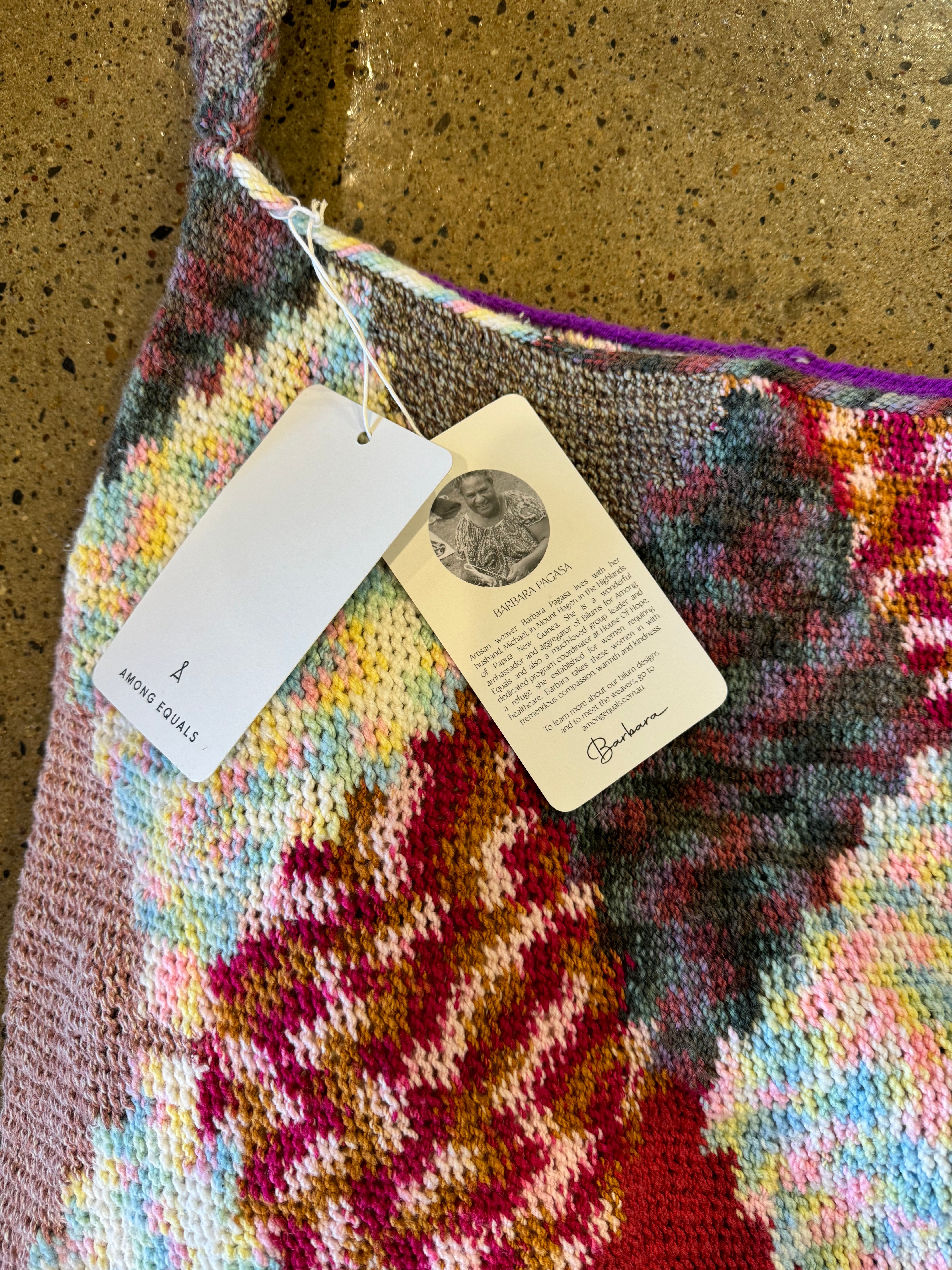 Each Bilum is handwoven and takes around eight weeks to make. The weavers’ beautiful natural fibres are created from surrounding vegetation, such as the Pandanus plant and Tulip tree. These fibres are beaten, rolled on the knee and then twisted into fine yarns. Alternatively, the women work with yarns which have been upcycled, a lengthy process which involves unraveling knitted jumpers and spindling the thread to form fine new lengths.