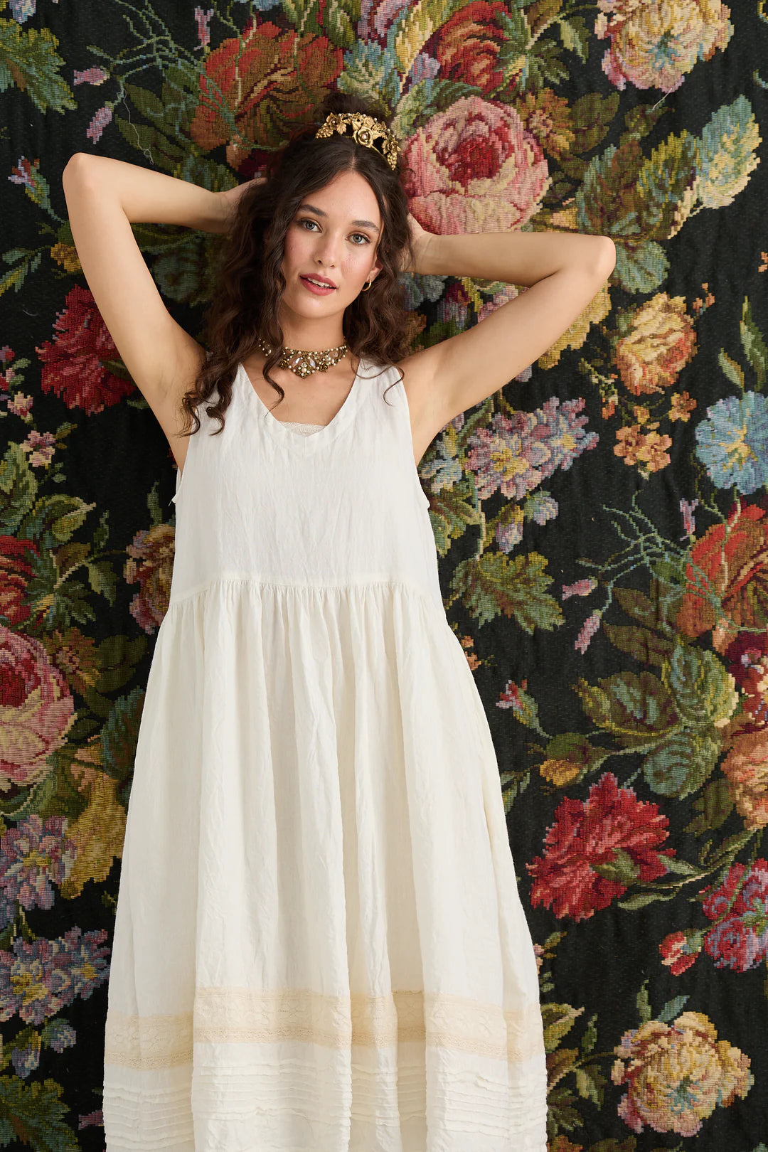 Enchantress is a true statement piece. Dramatic, theatrical, poetic but also achingly Romantic. With its soft folds of luxurious linen gauze the coat is enriched with exquisite detailing - pintucks and vintage lace prettily adorn it and the simple fine ties bring it together at the front. Truly a sumptuous piece. Perfect for special occasions and weddings.