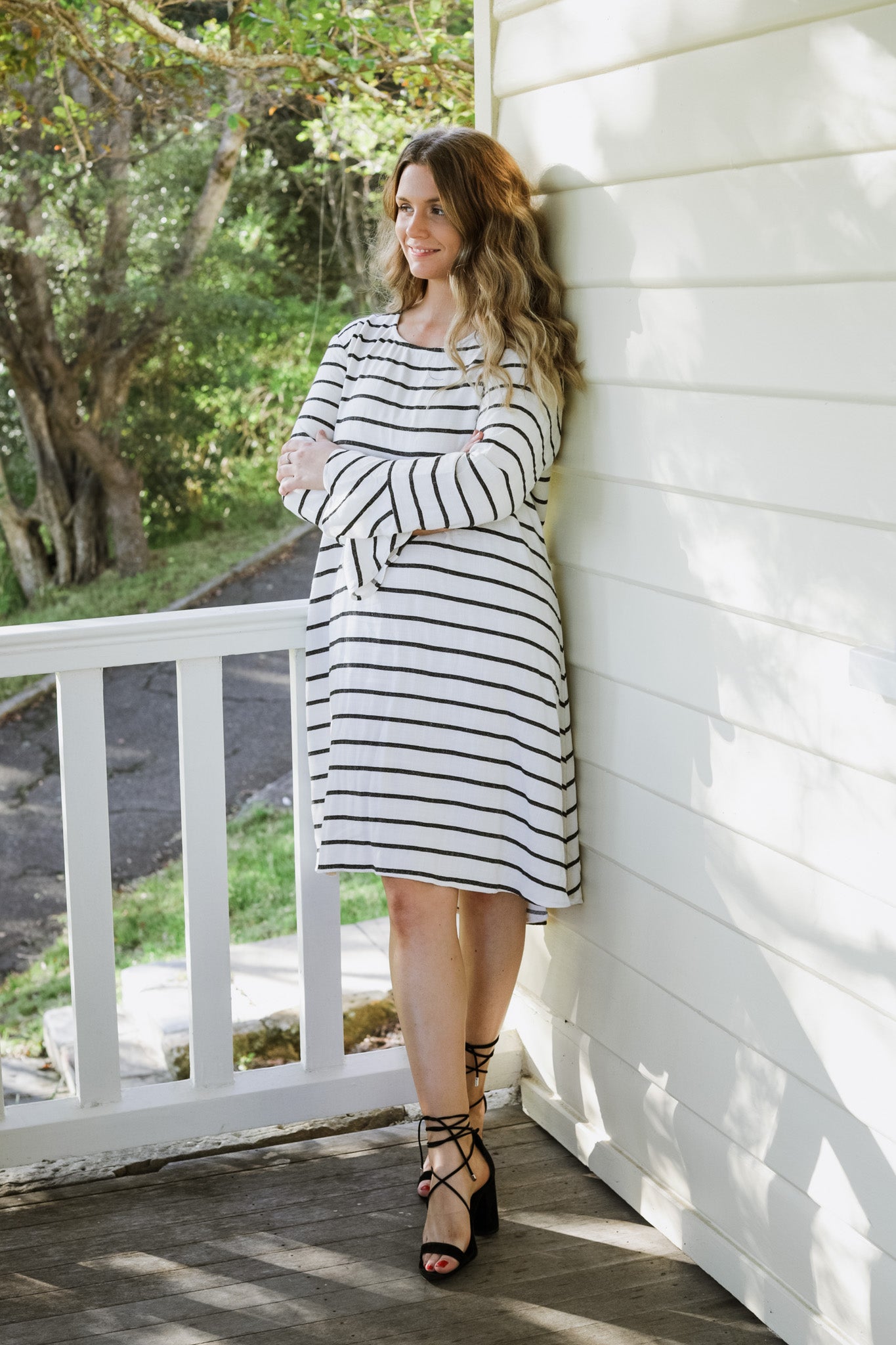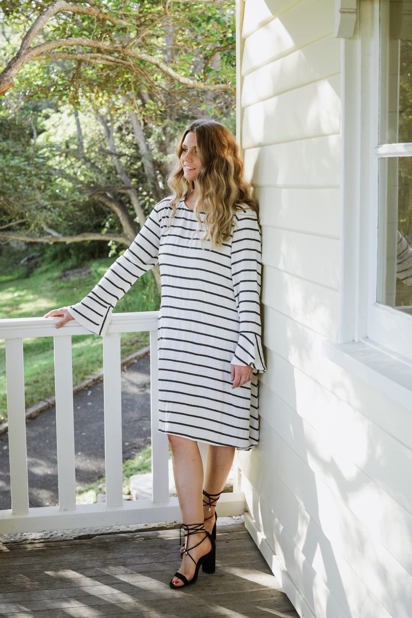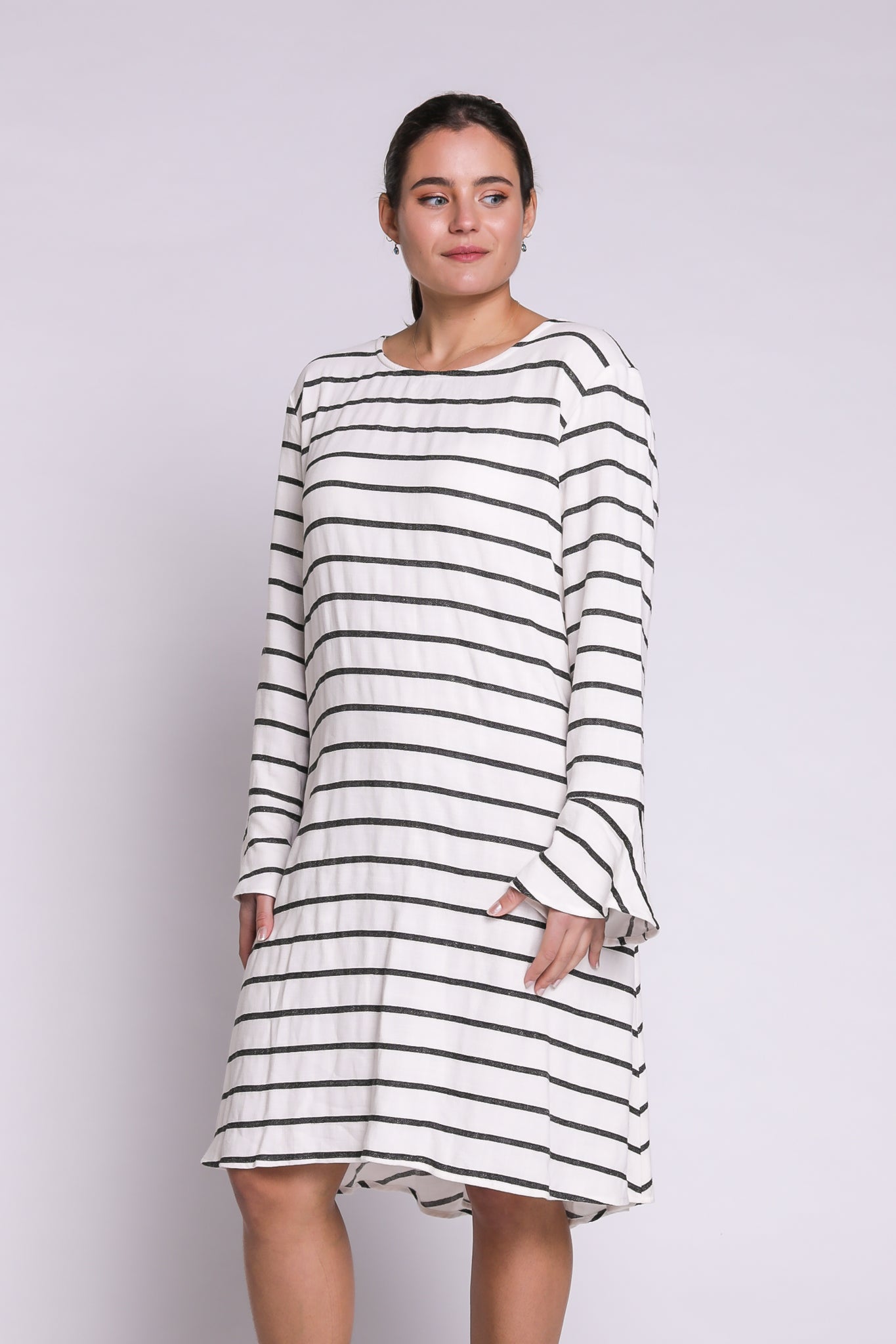 The Flared Sleeve Dress by Olive Et Julie is cut from light-medium weight linen and cotton combo. This dress is a perfect trans seasonal piece and is great for layering.