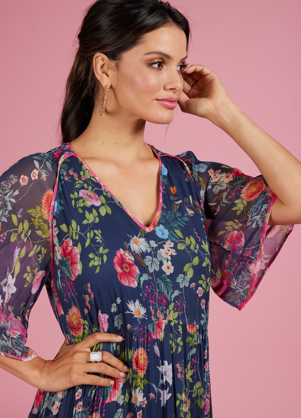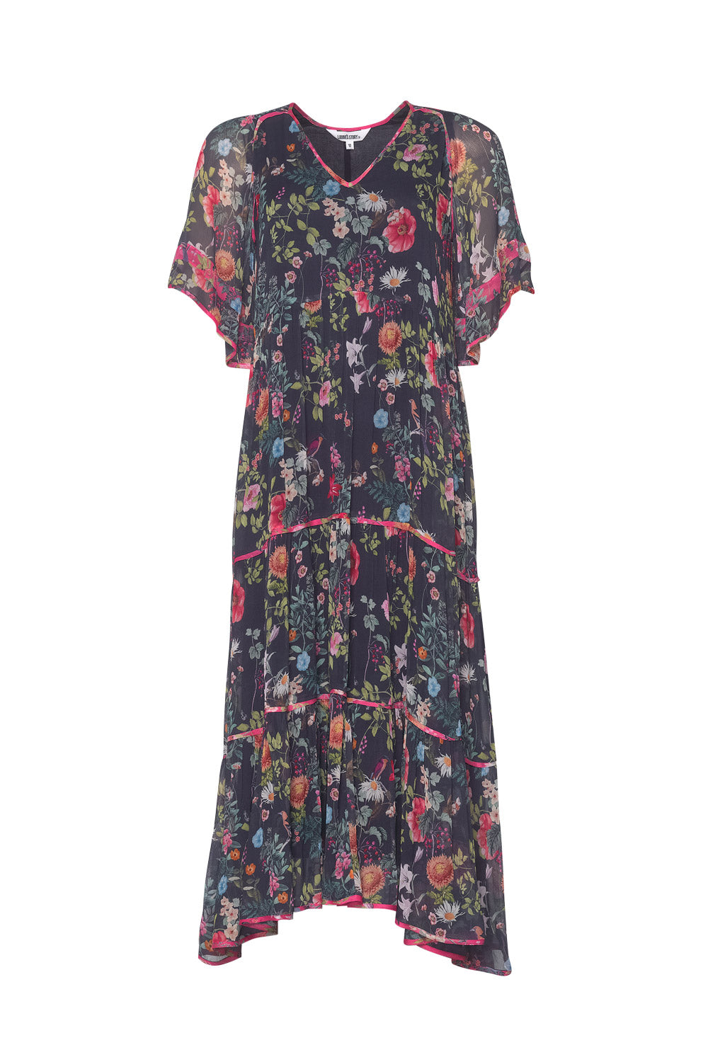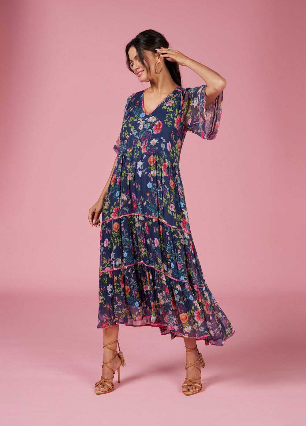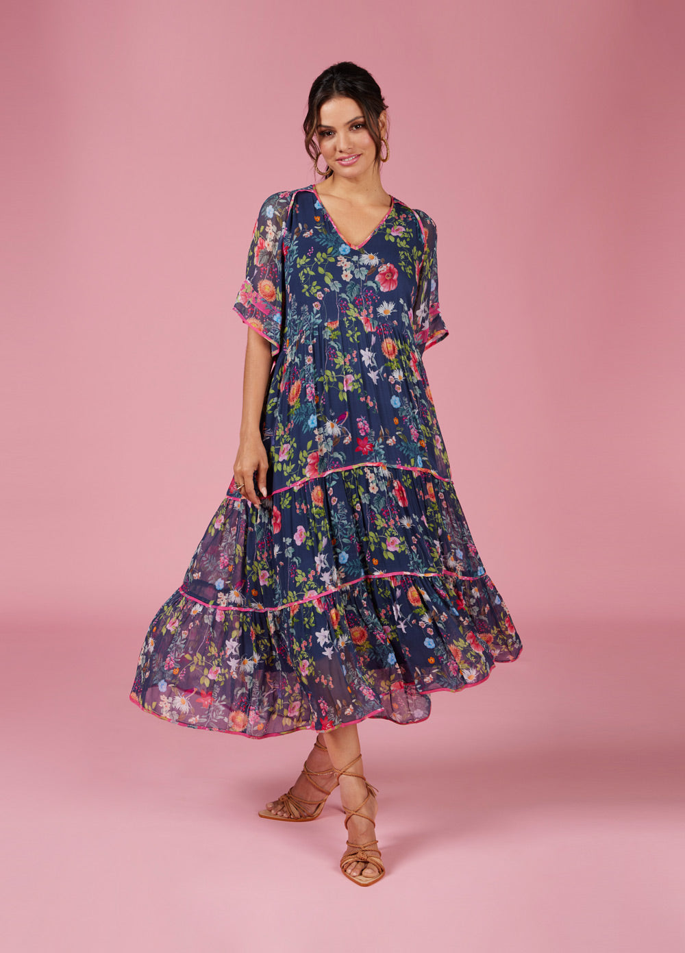 Tiered midi dress with V-neckline and floaty sleeves. Featuring shirring detail at shoulder, with print binding at all tiers and at sleeve edge. Fully lined.