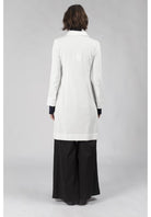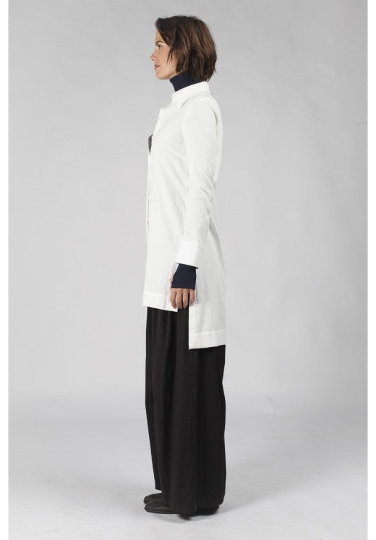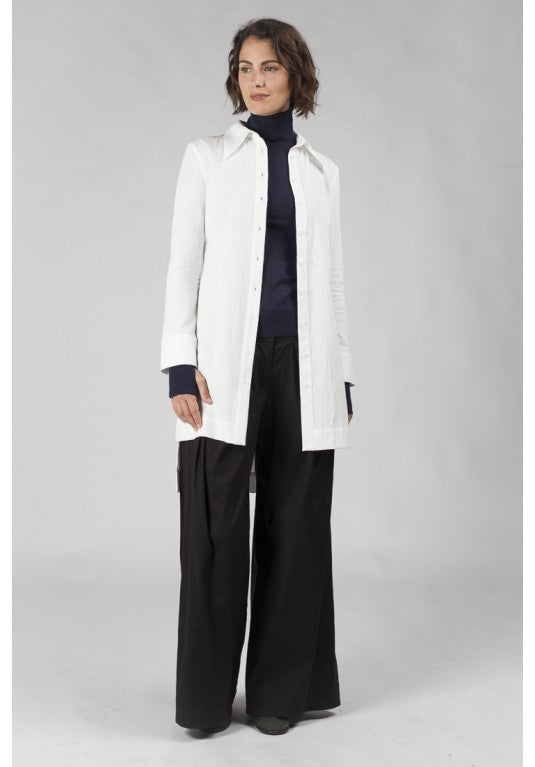 Frost Shirt is a full length, fitted shirt with a two-piece collar and wide sleeve hem with a placket and 2 buttons. It buttons from the top to the bottom and has an uneven, 5cm hem band, finishing mid thigh.
