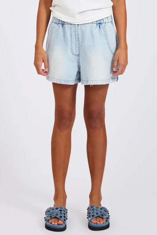 Featuring an elasticated high waist, sporty flippy legs, and a faux fly front, these shorts balance comfort with attitude. Lightweight denim chambray gives them movement and softness — perfect from beach to street.