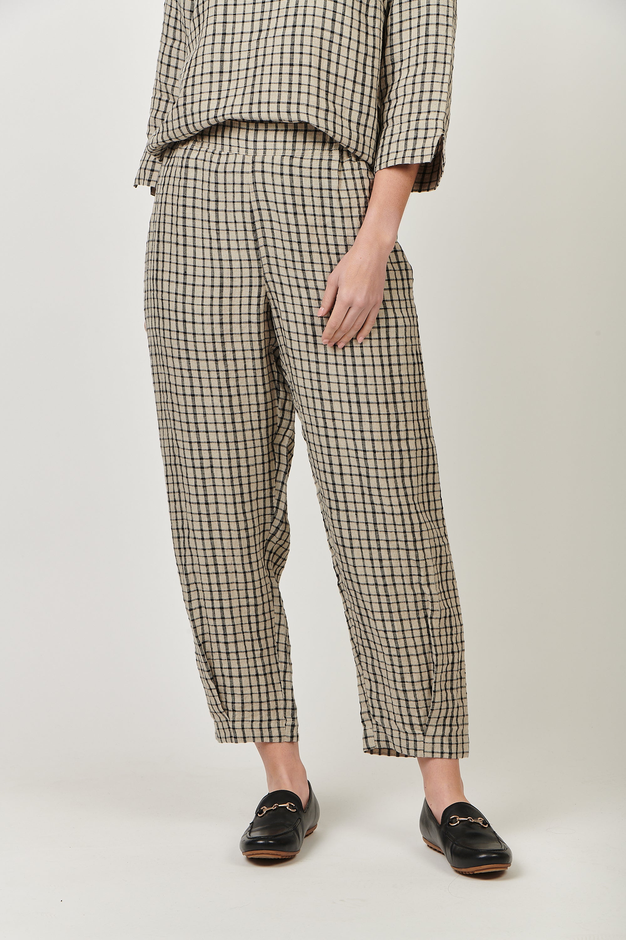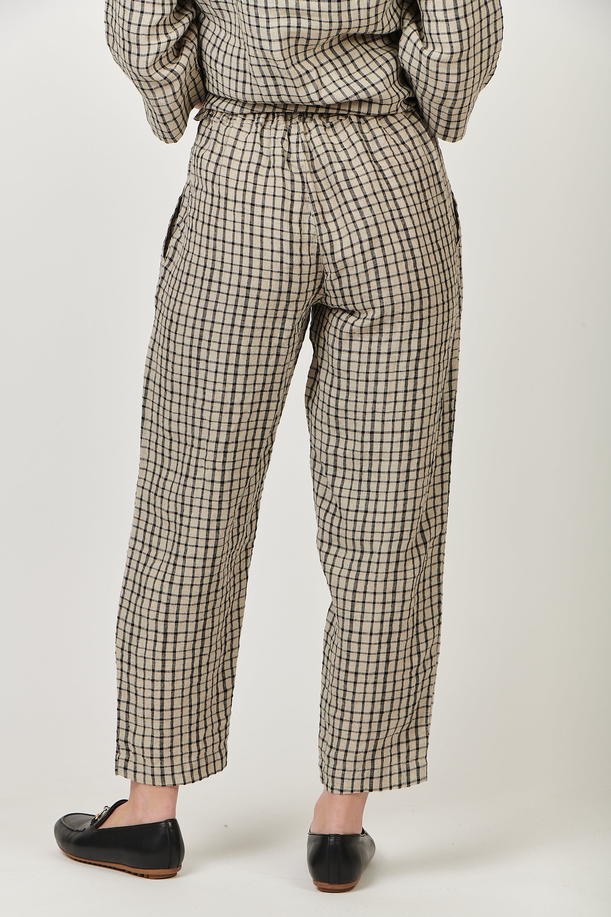 Inspired by the classic chino pant but in breathable, 100% linen, a cropped, straight-leg pant featuring an elastic waistband and pockets. A subtle panel at the pant hem completes the look.