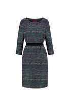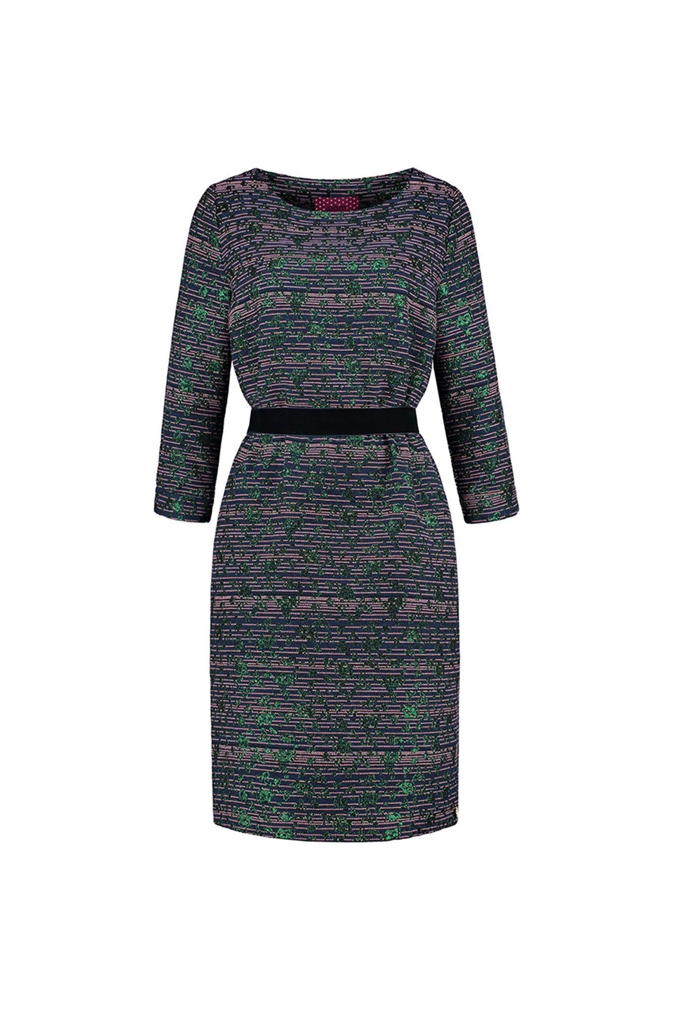 This dress with three-quarter sleeves in jacquard fabric has a pink striped pattern on a blue background with green lurex details. It has a black velvet belt around the waist.