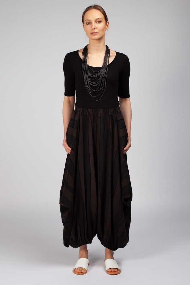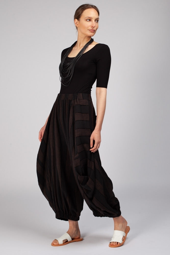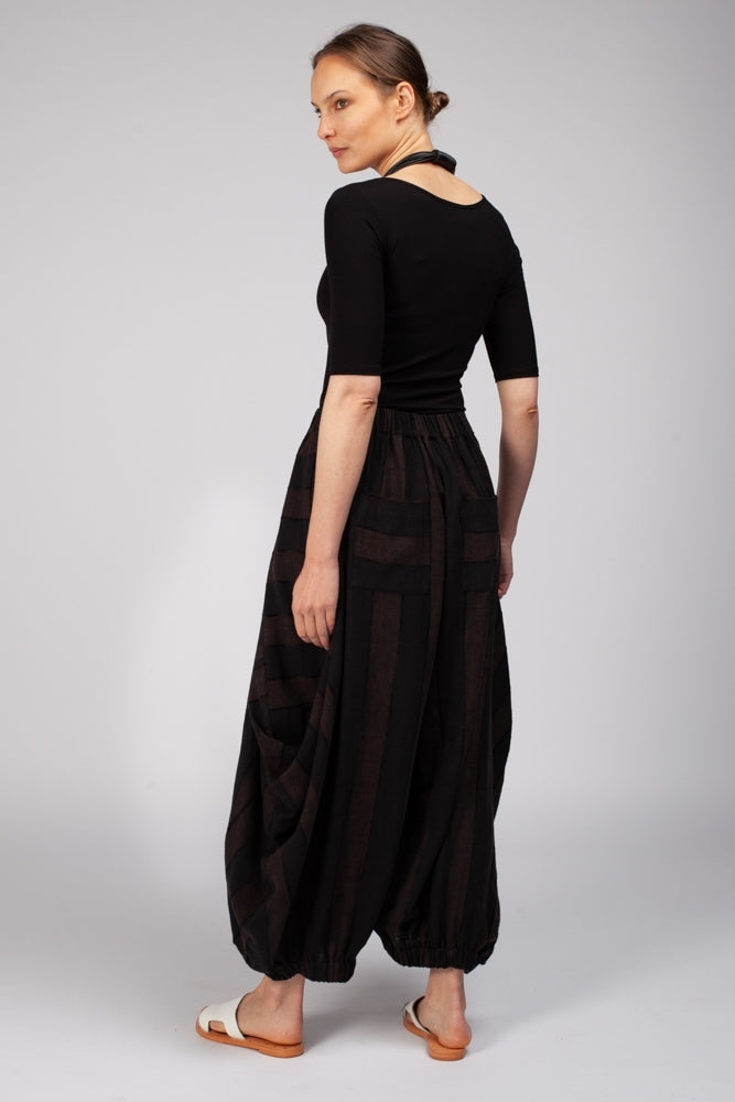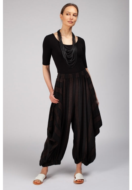 The Haori Pants in Chocolate are a natural fibre soft draped pant that feature 2 side pockets and 2 back pockets, an elasticated hem and waistband that sits comfortably on the waist. They are light-weight and travel well and are detailed with wide angled stripes chocolate and black.
