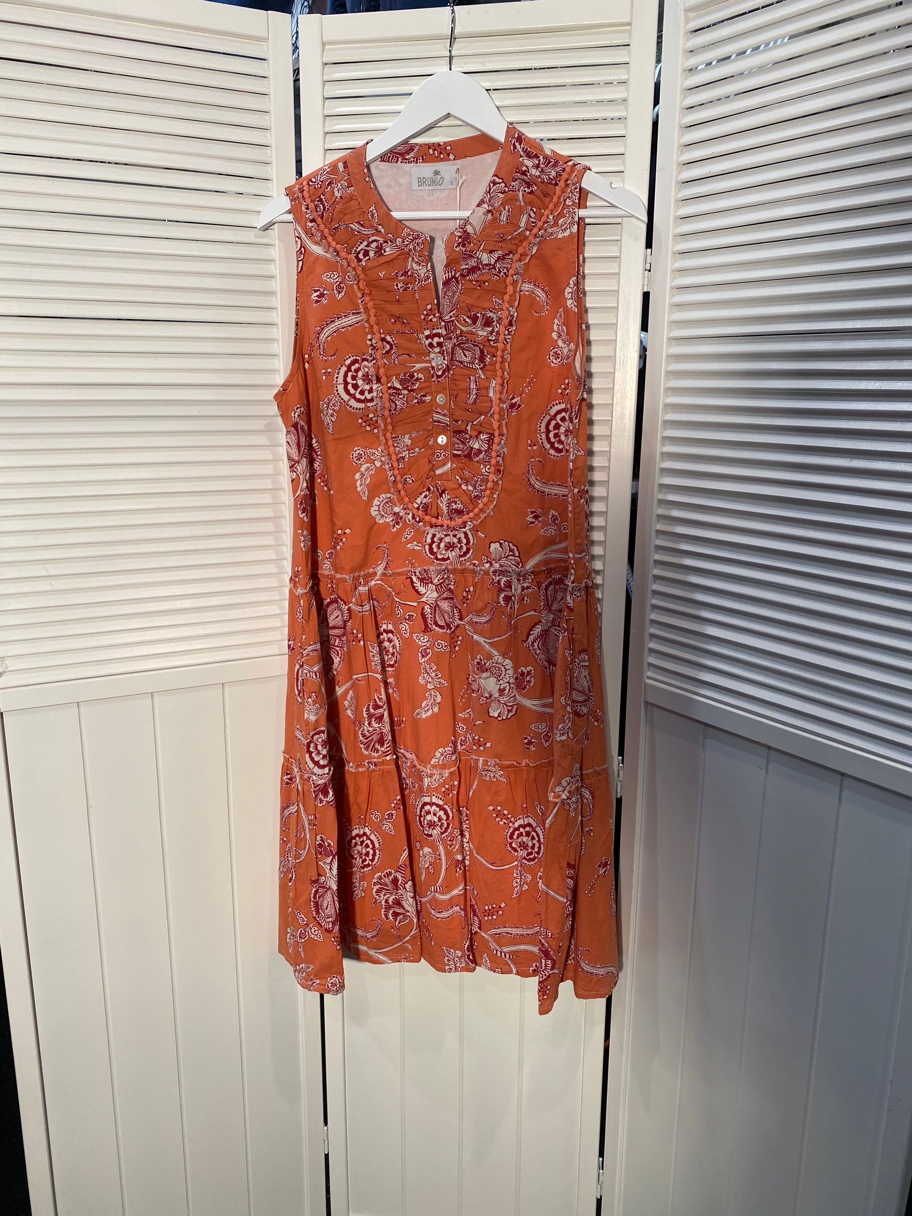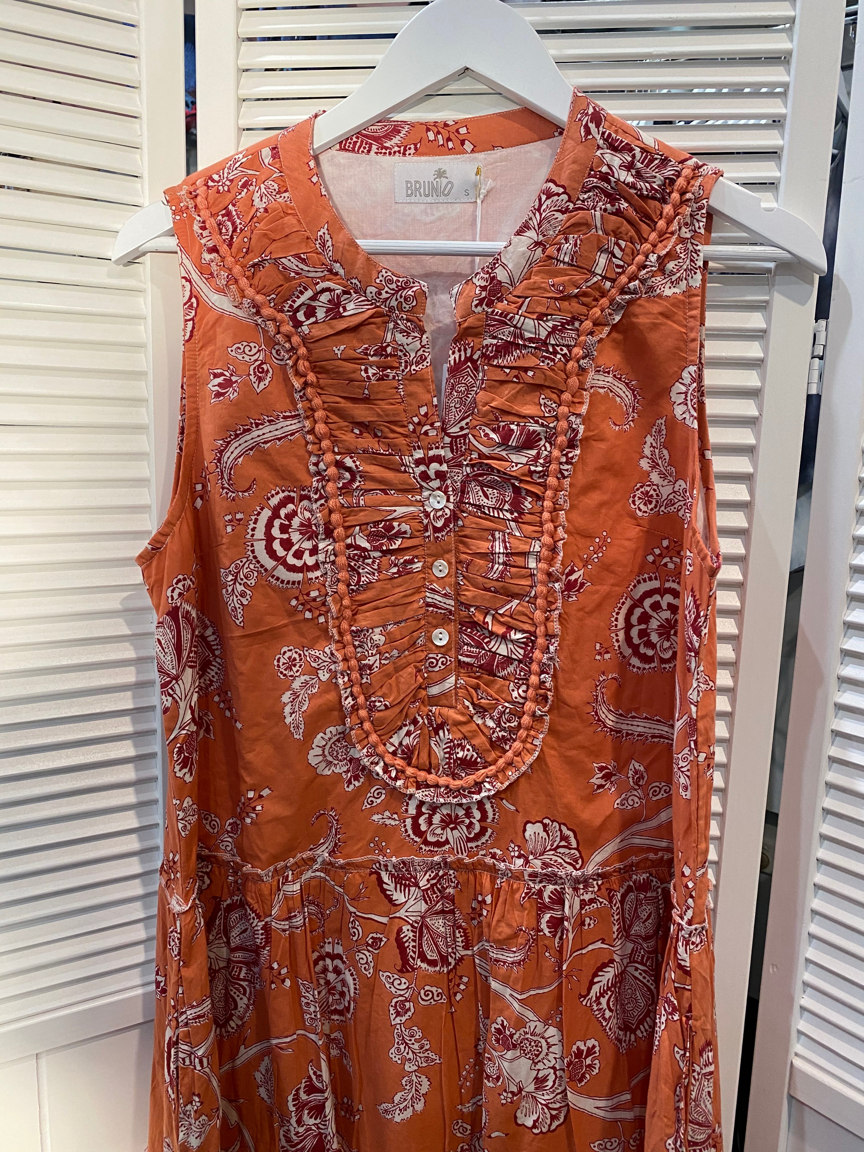 Introducing a new style by Bruno, the Jemma Dress. A take from the Chloe Dress, It features a slight A-line swing skirt in strong hand crinkled cotton - no ironing, YAY! It has a three tiers with frill detail and is sleeveless. The Jemma Dress has three buttons descending from the neckline making it an easy dress for breastfeeding mums. Not only does it have pockets, but it's also fully lined.