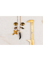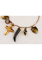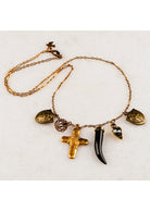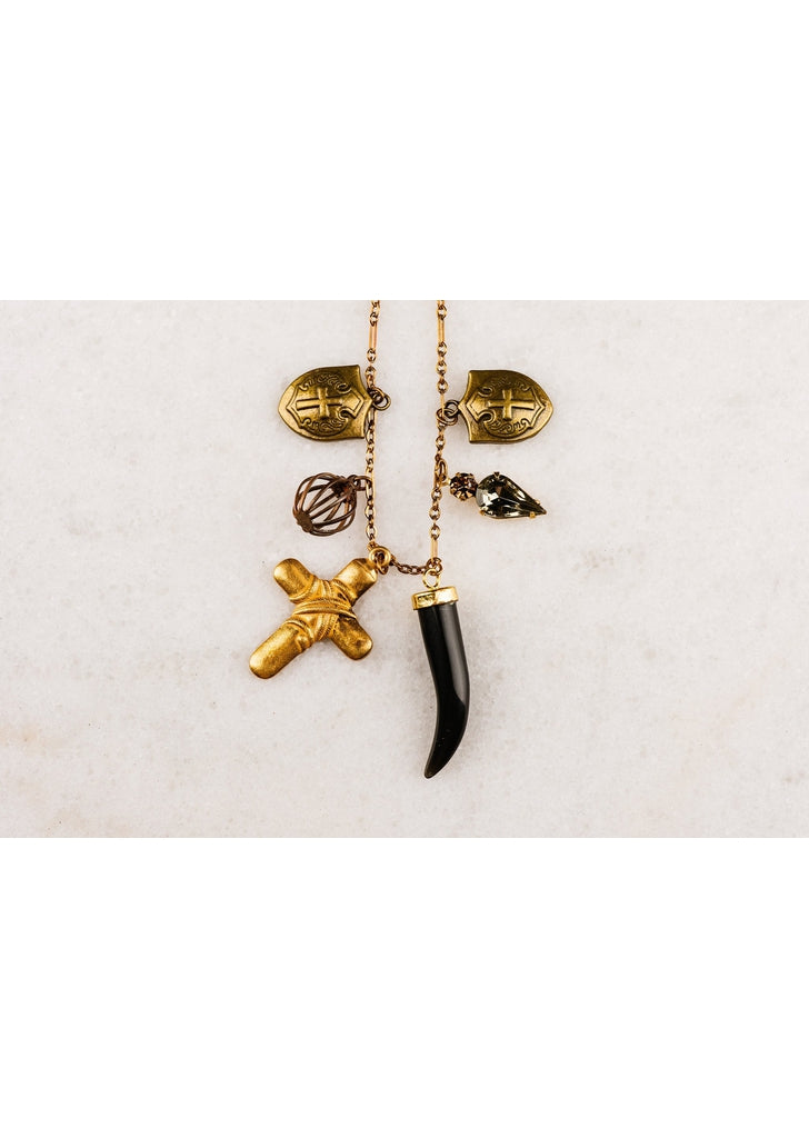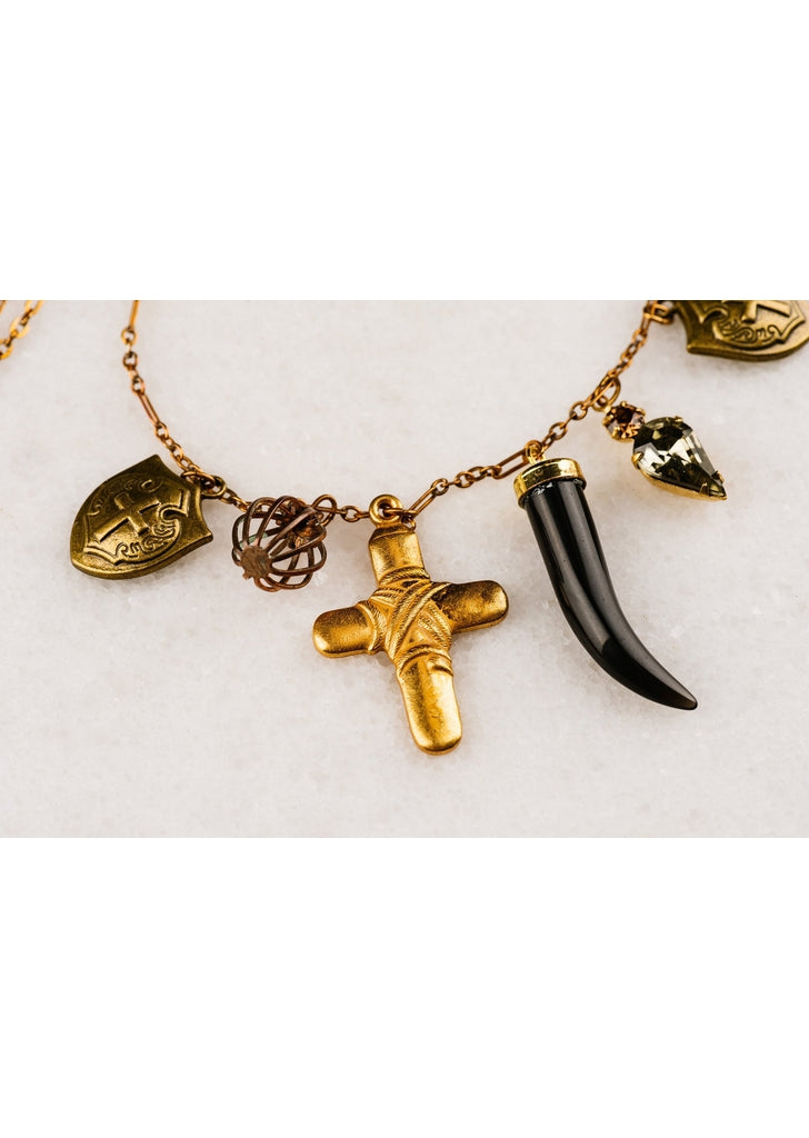 A beautiful necklace made with vintage charms including Vintage Swarovski Crystal, carved Agate Tusk, Cast Golden Cross, Vintage Cage Bead and vintage shields on a long vintage chain.