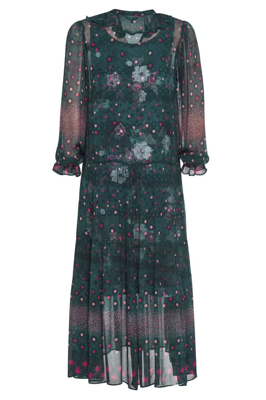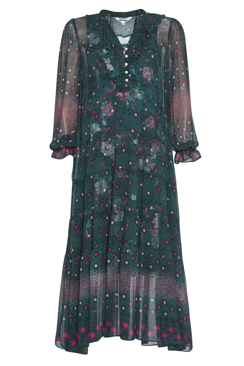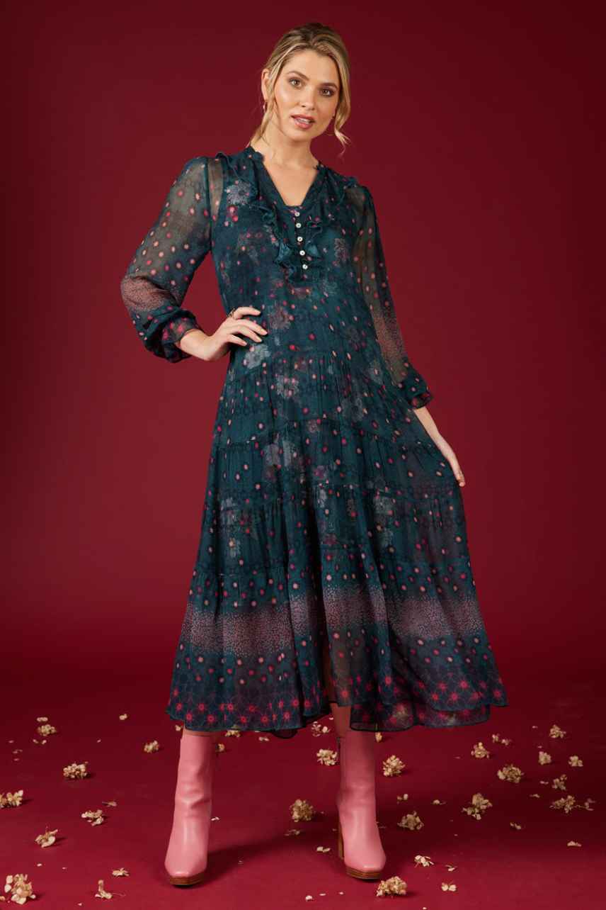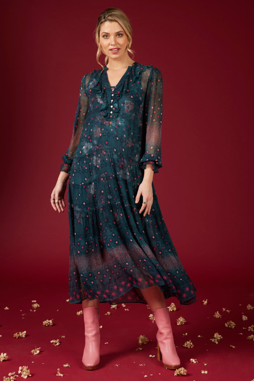 Floaty tiered midi dress with a v-neckline, and a buttoned front placket with a soft flounce frill. Includes printed slip in contrast floral.