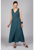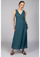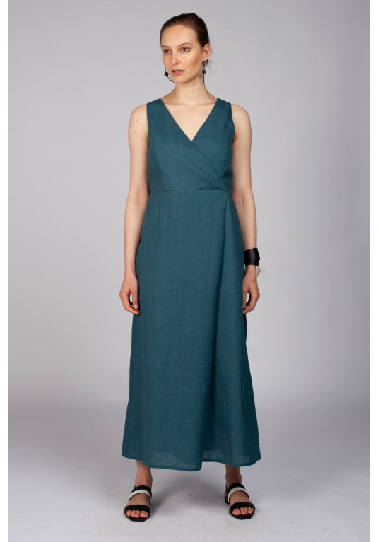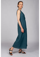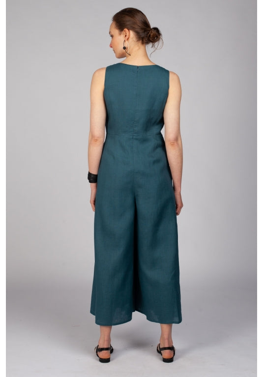 The Kokochi Jumpsuit in Teal is a wide leg wrap jumpsuit made from a breathable 100% linen. Fitted at the bodice this sleeveless jumpsuit wraps across the bust creating a V neckline and falls to an A-Line pant leg.