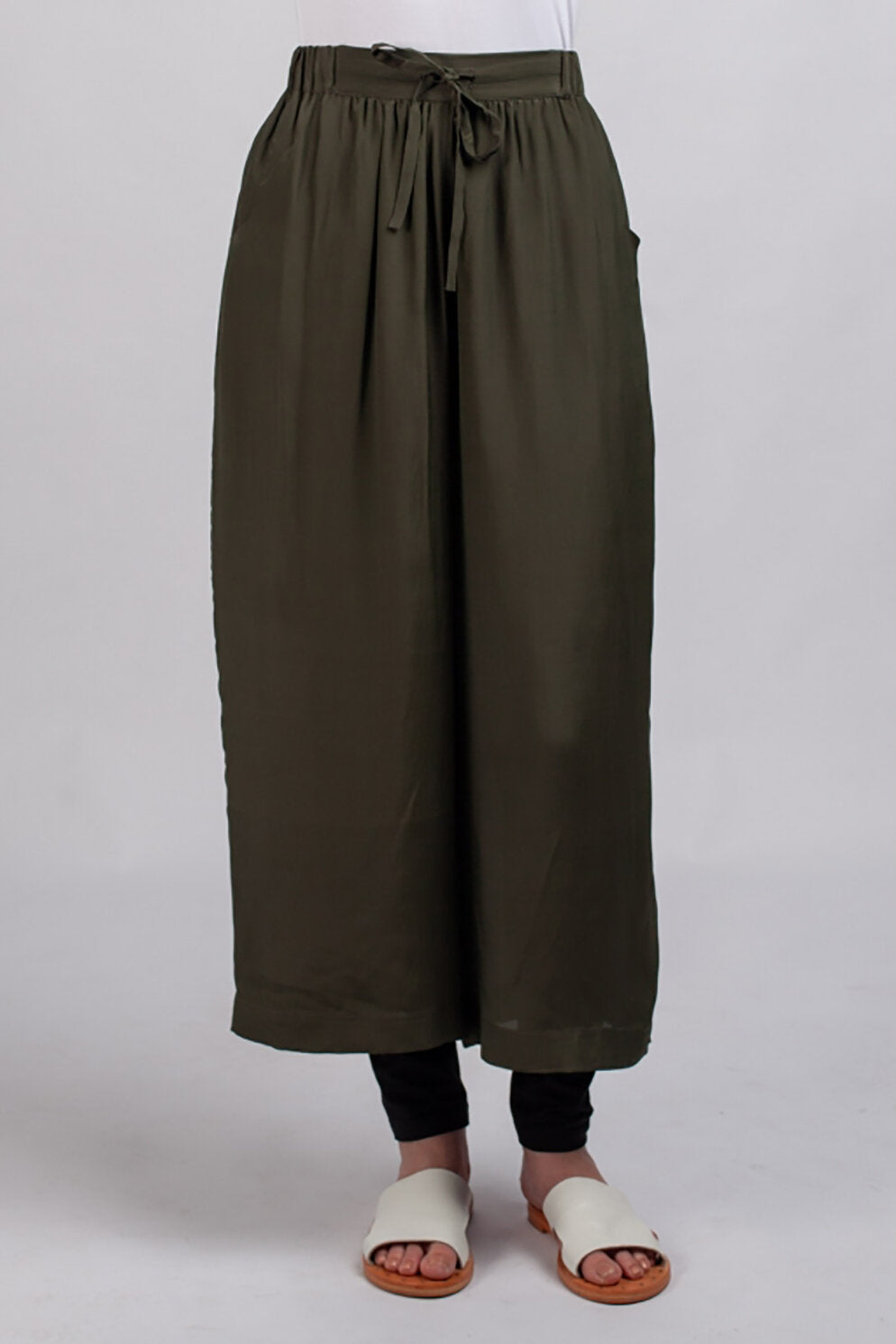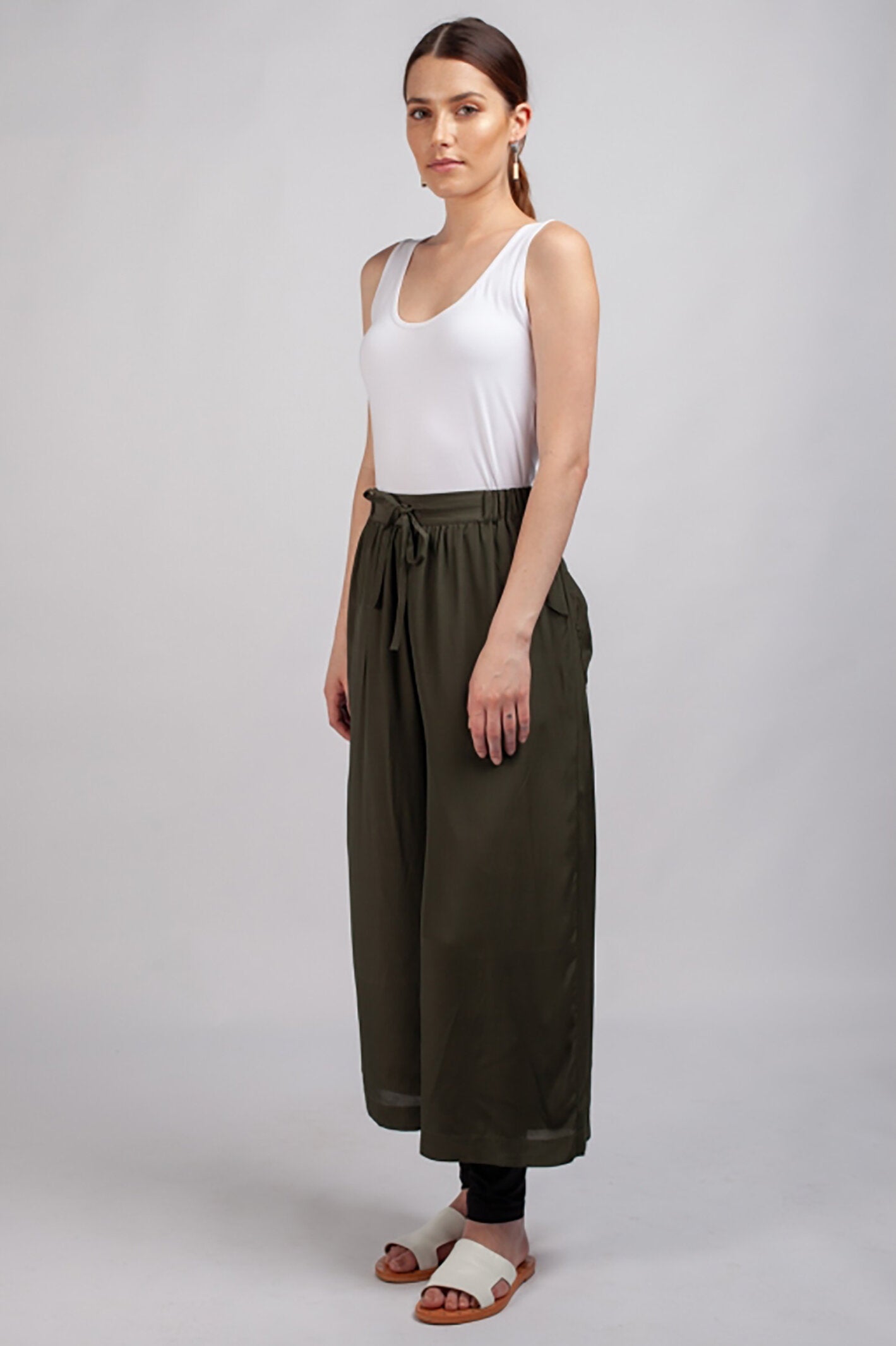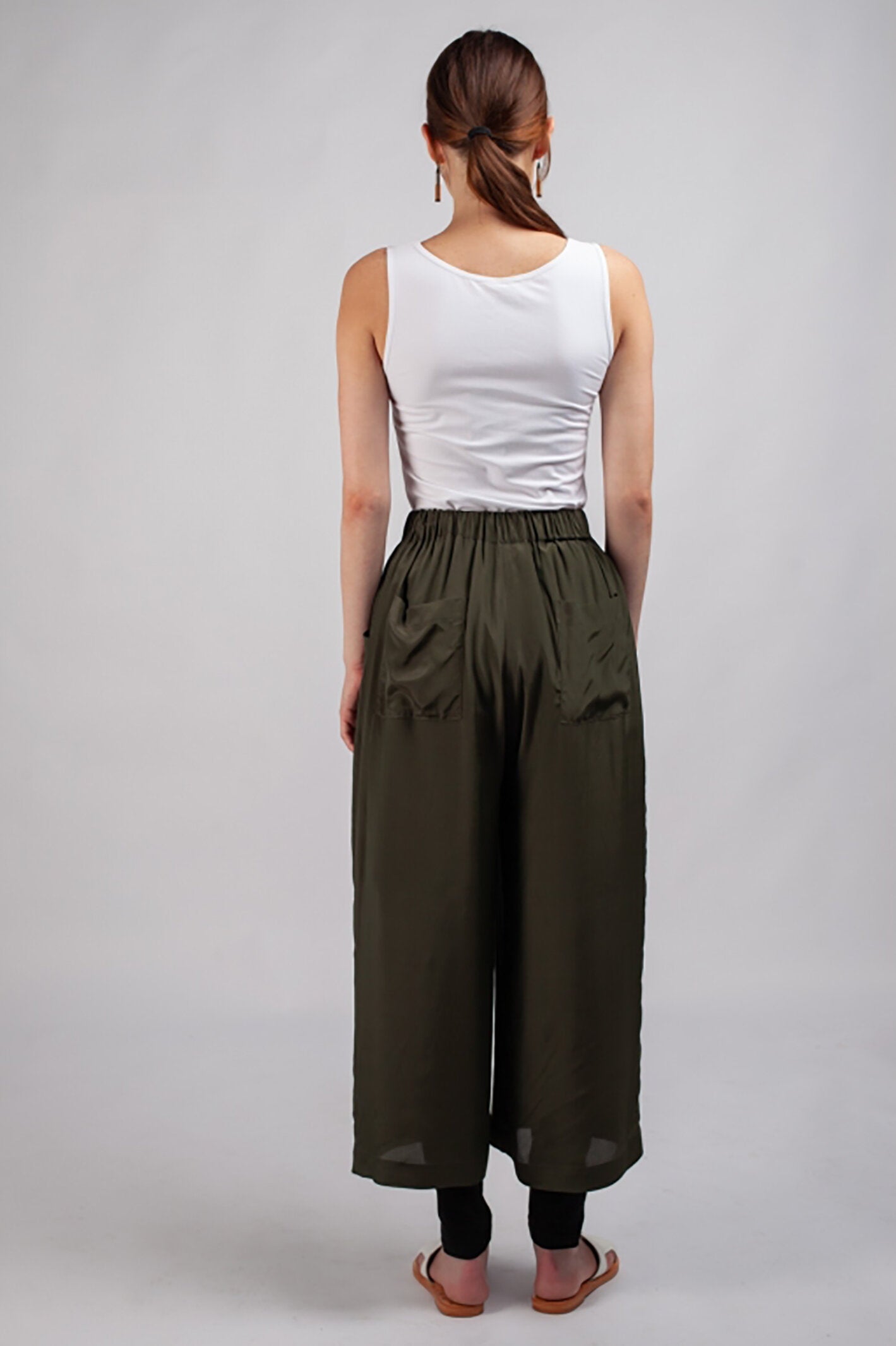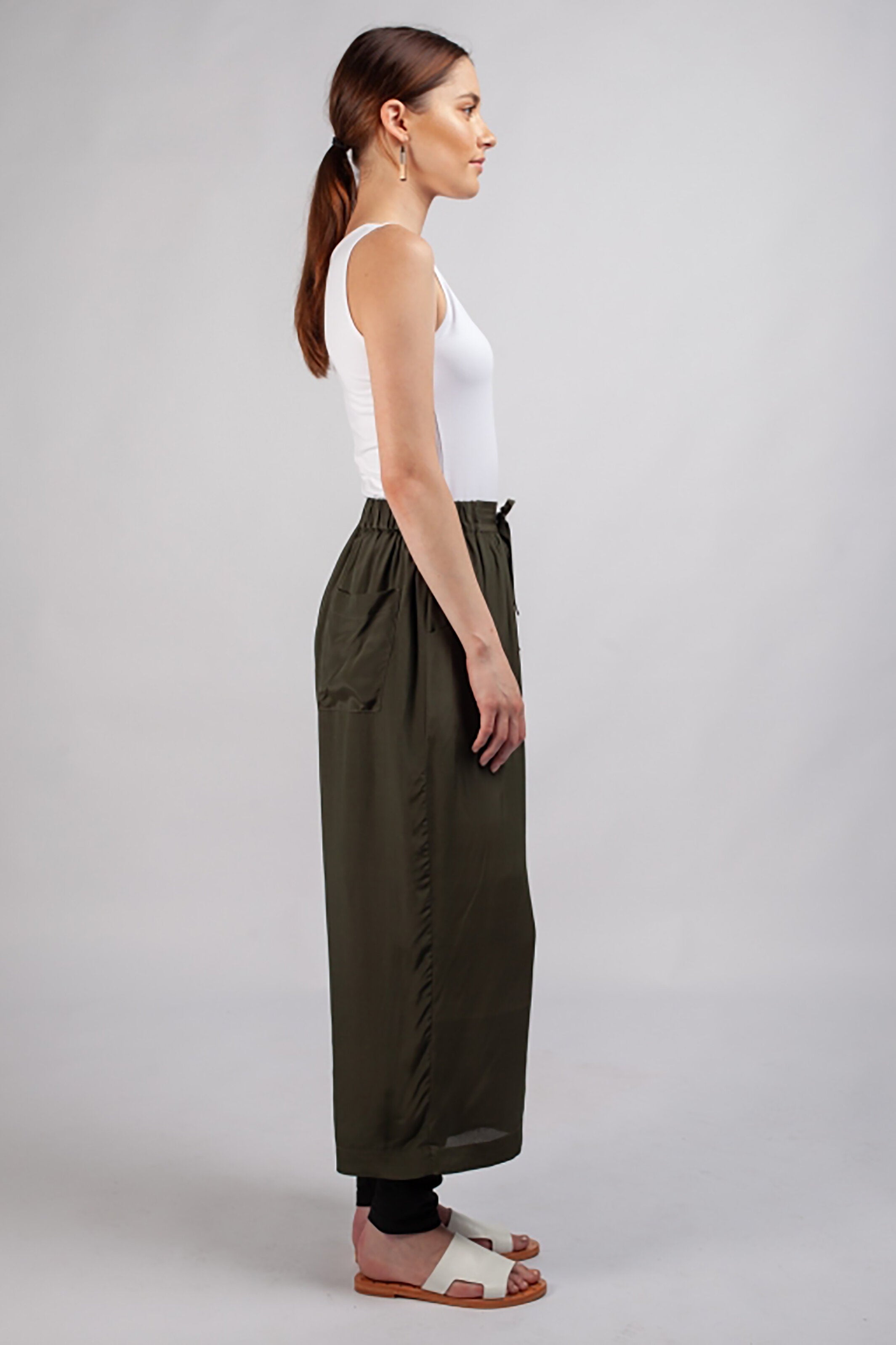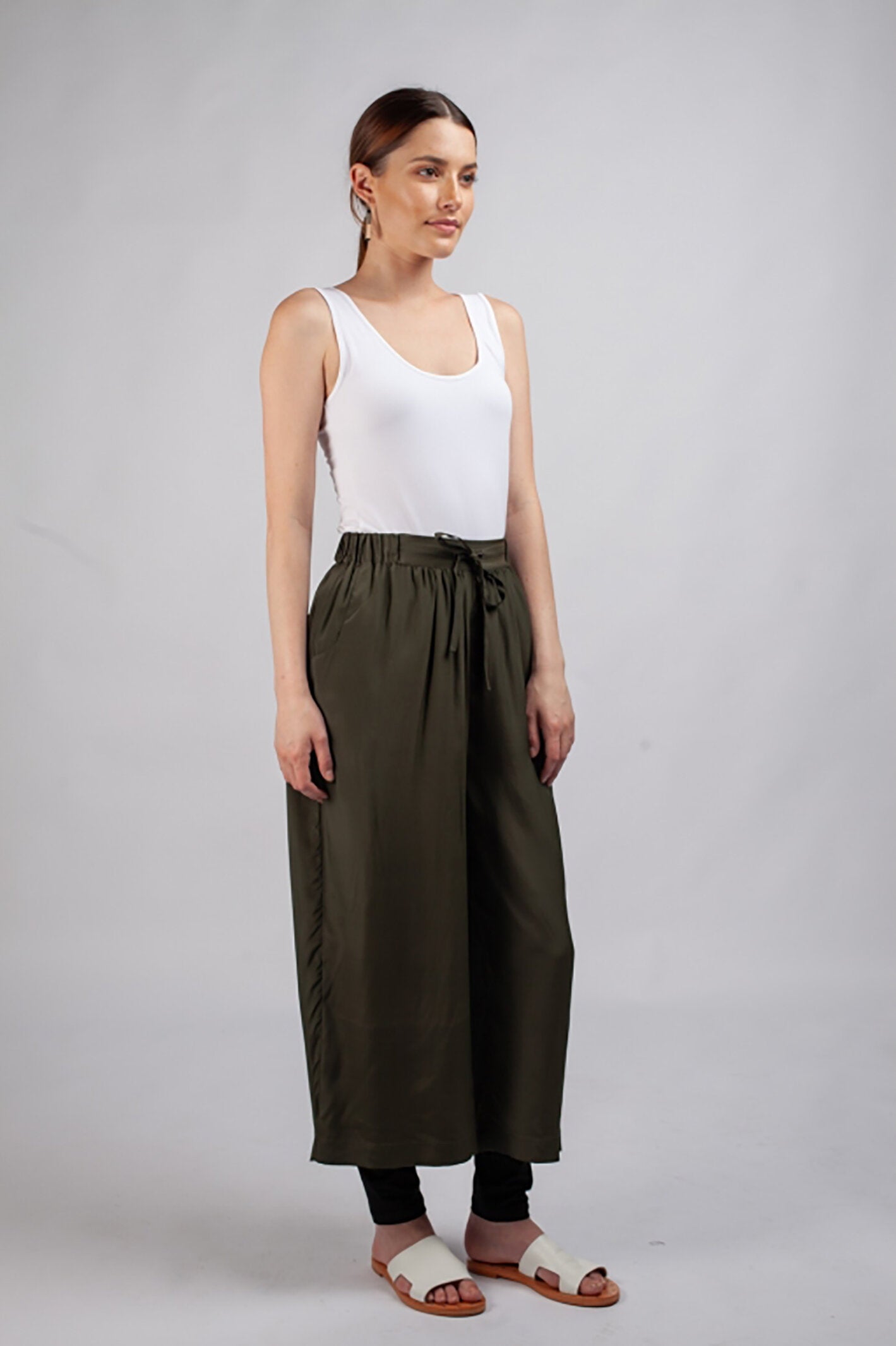 The Laneway Pants in Khaki are a semi-wide leg pant featuring an elasticated waistband that sits comfortably on the hips. Fastening with a drawstring along the waistband and made from 100% silk, these pants are the epitome of comfort