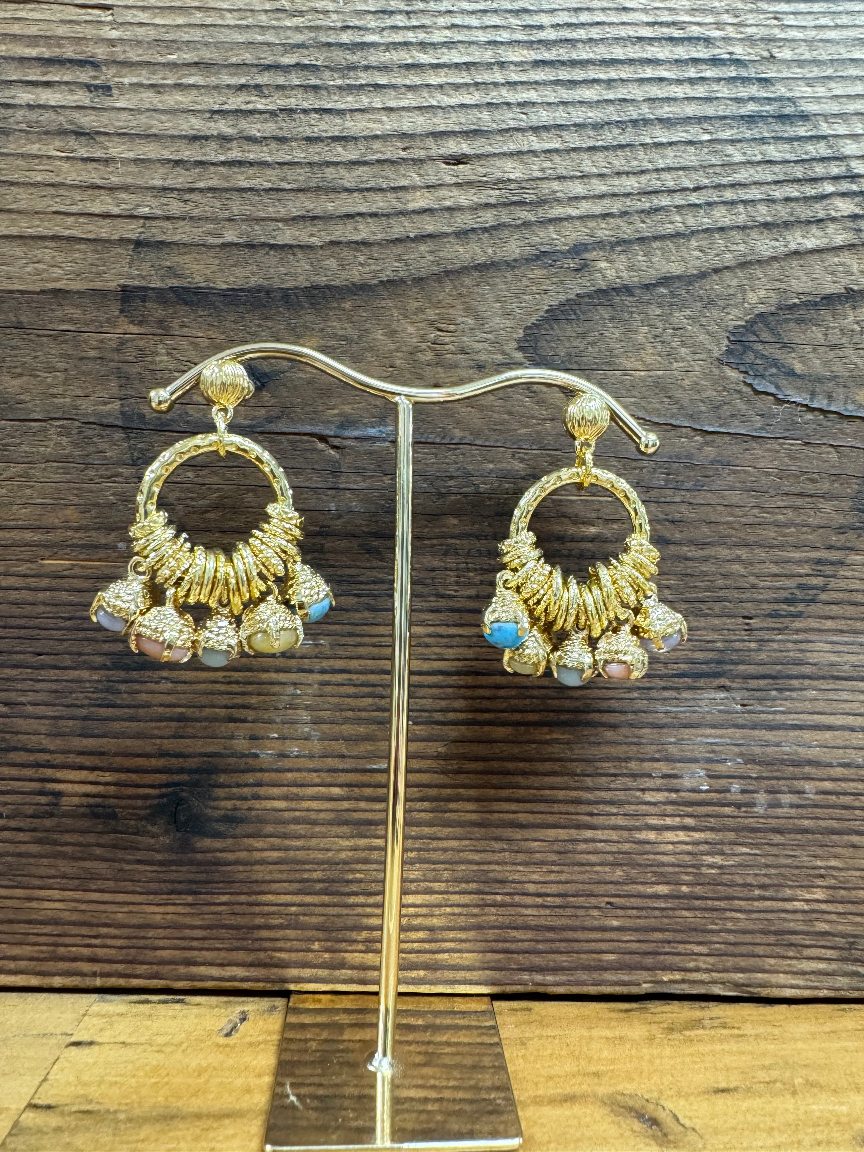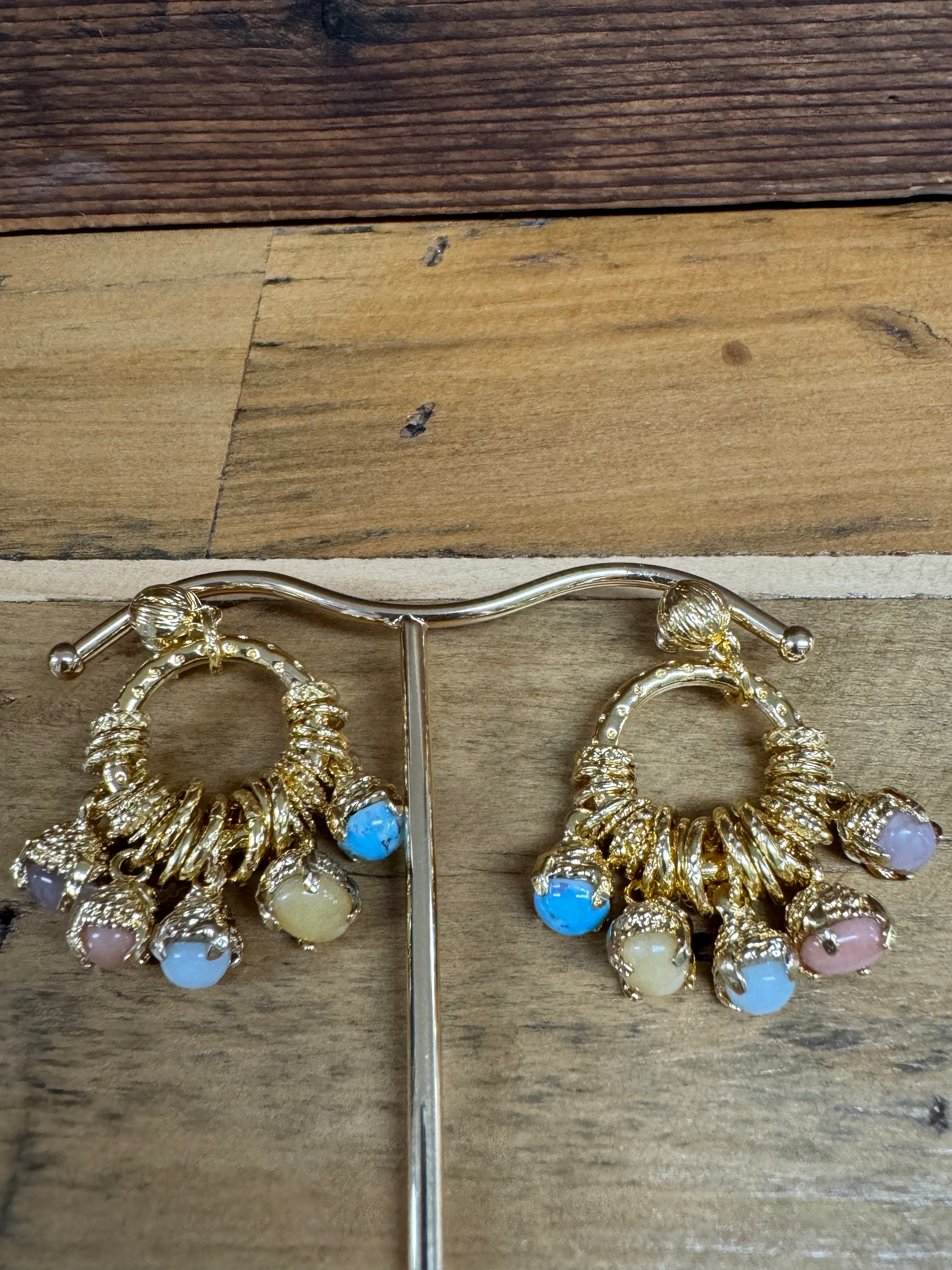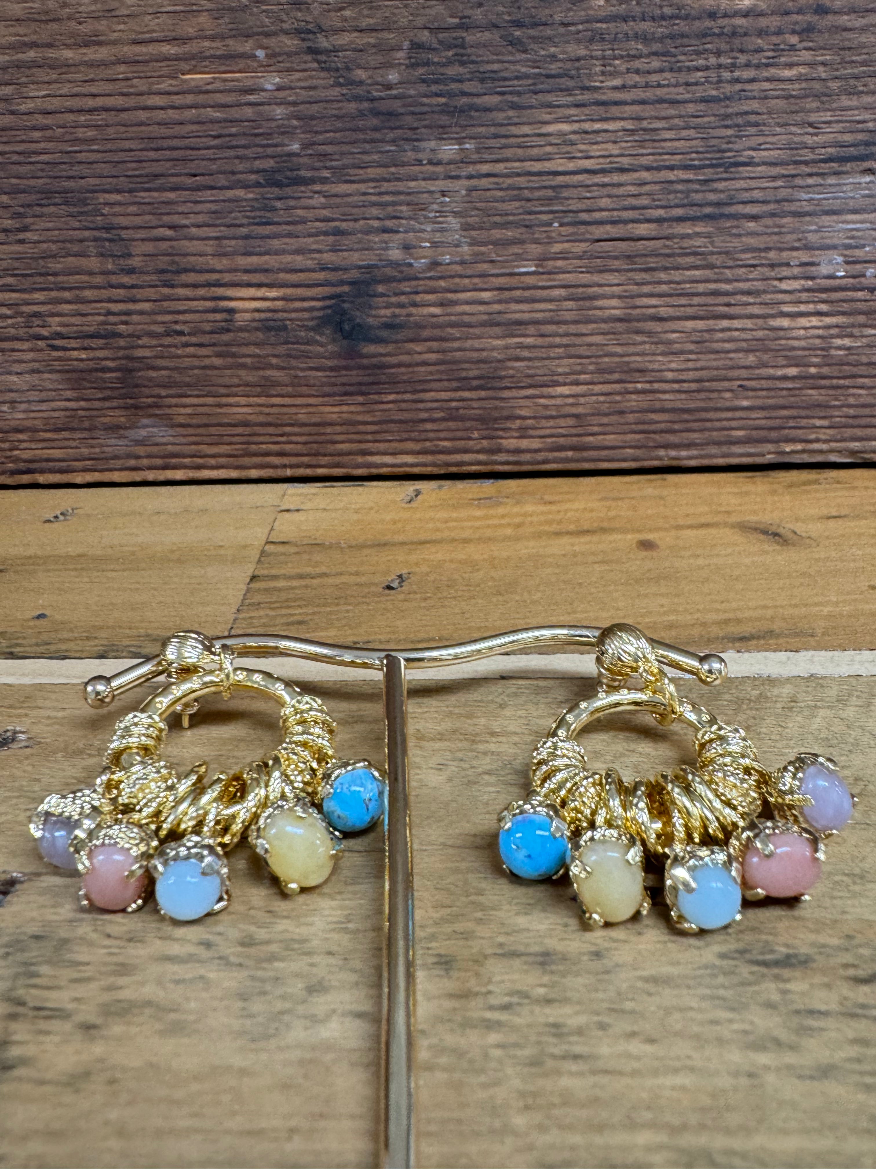 Gold plated earrings, set with five colored glass stones and hammered hoops.
